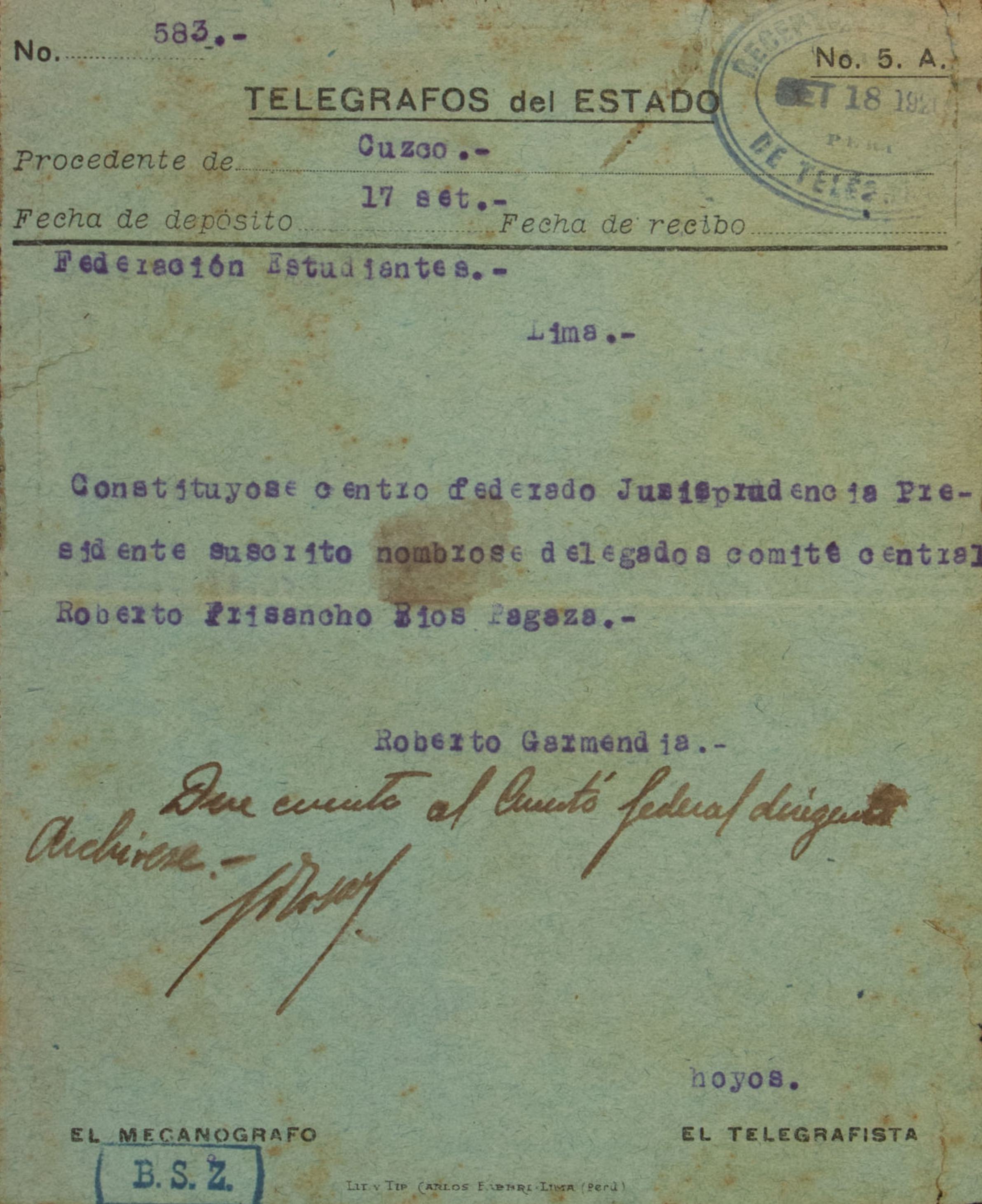 El telegrama, enviado desde Cusco el 3 de abril de 1920 por Rafael Calderón, presidente de la Asociación Universitaria, está dirigido al presidente de la Federación de Estudiantes del Perú en Lima. En el mensaje, Calderón expresa la extrañeza de los estudiantes de Cusco ante la decisión del gobierno de nombrar delegados al congreso de Madrid sin respetar la autonomía universitaria. Solicita el apoyo de la federación para respaldar la reclamación presentada al gobierno, exigiendo que las universidades tengan la libertad de elegir a sus propios delegados
