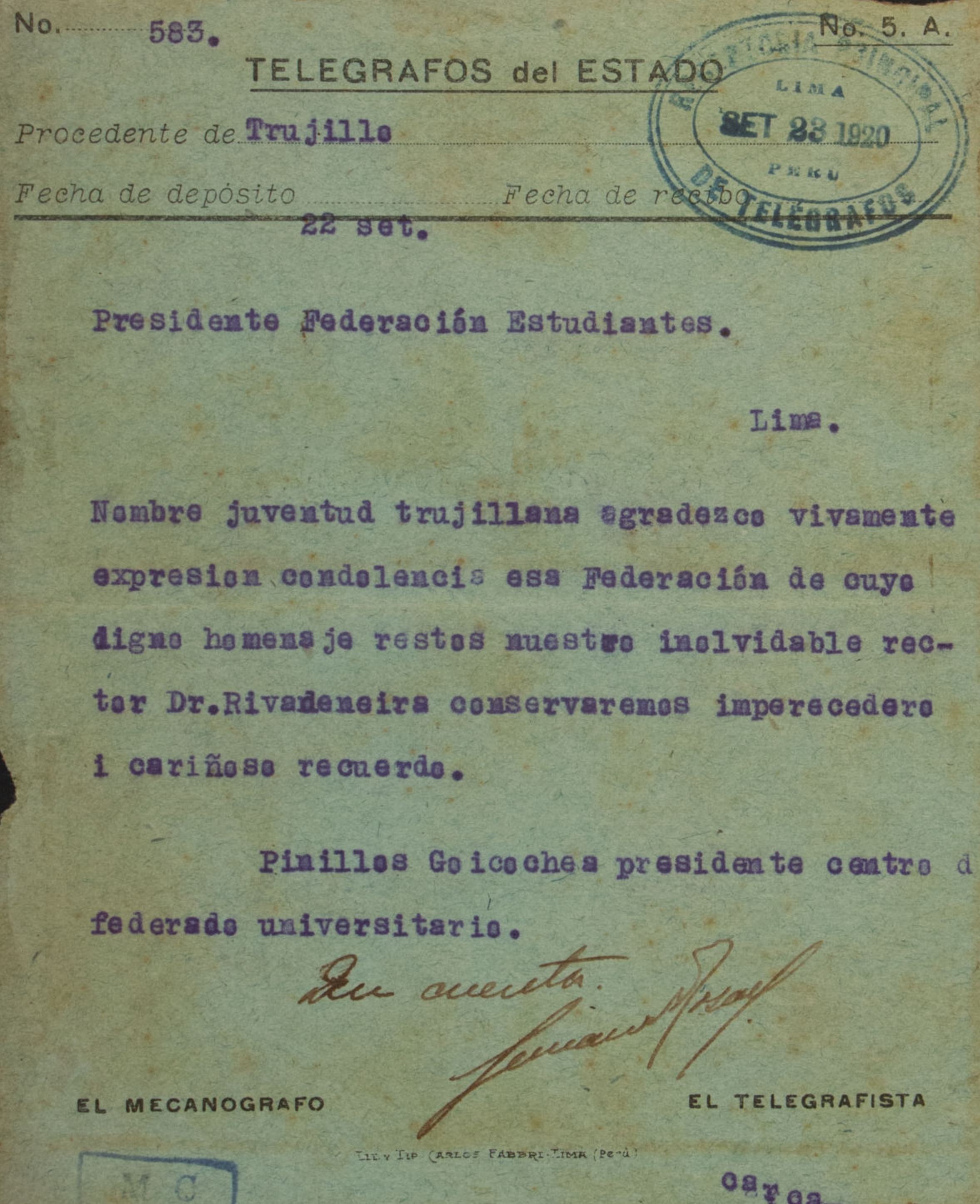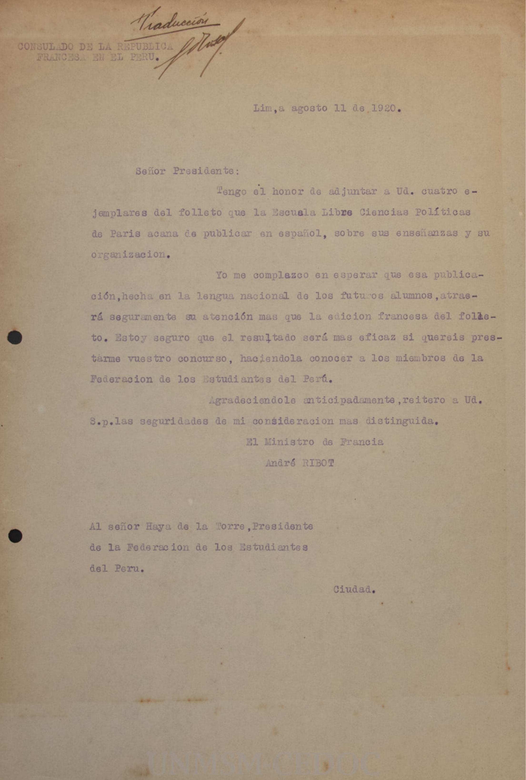 La carta, fechada el 5 de abril de 1920 y enviada por el Ministerio de Fomento, Dirección de Agricultura y Ganadería, está dirigida al presidente de la Federación de Estudiantes del Perú. En la comunicación, se informa sobre la resolución suprema que aprueba la solicitud de la federación para posponer los exámenes de aplazados en la Escuela Nacional de Agricultura y Veterinaria. Los exámenes se reprograman para los días 15, 16 y 17 de abril, y la apertura del nuevo año escolar se fijó para el 19 de abril. La resolución lleva la rúbrica del presidente de la República.