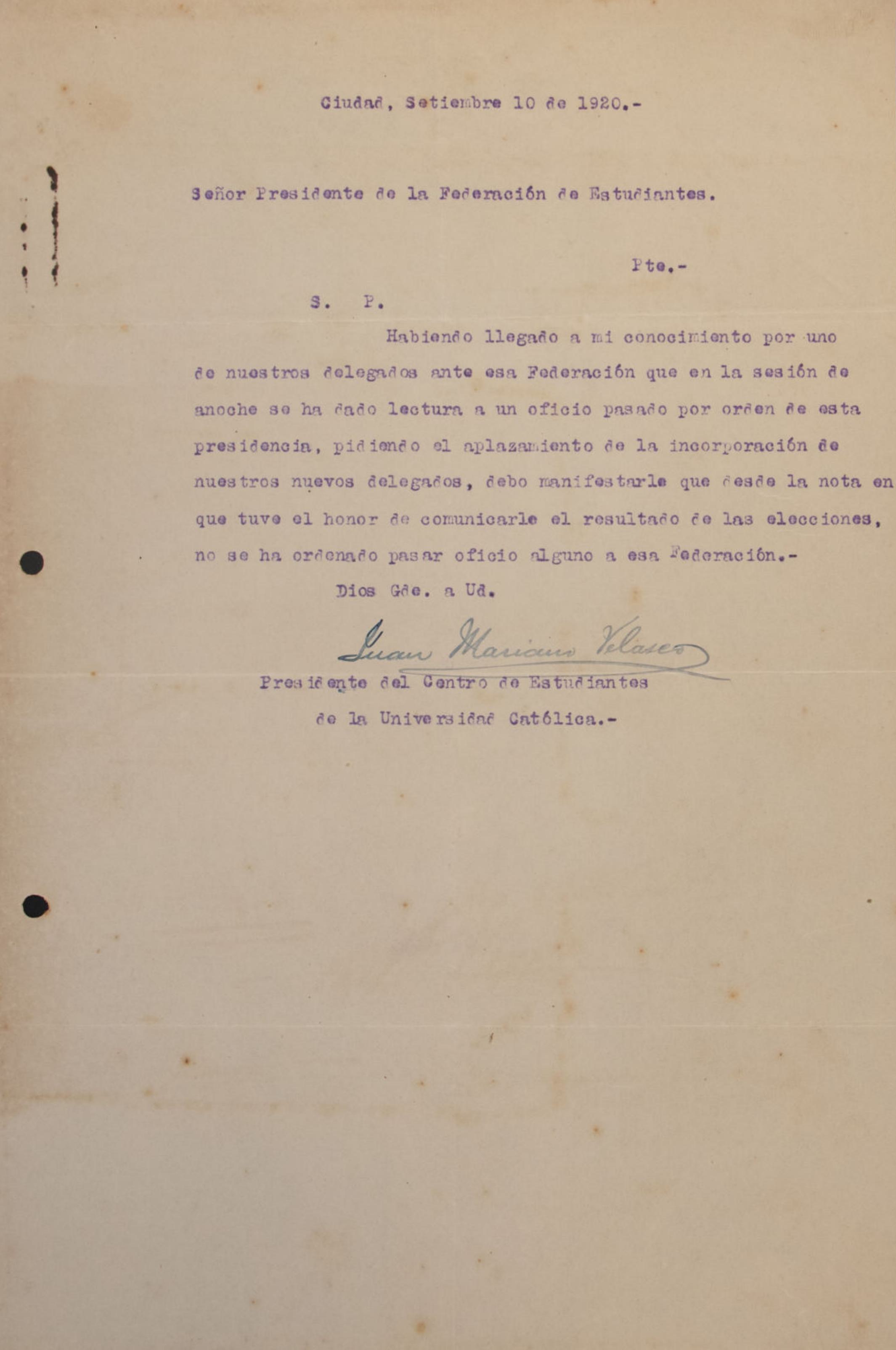 Carta del presidente del Centro de Estudiantes de la Universidad Católica