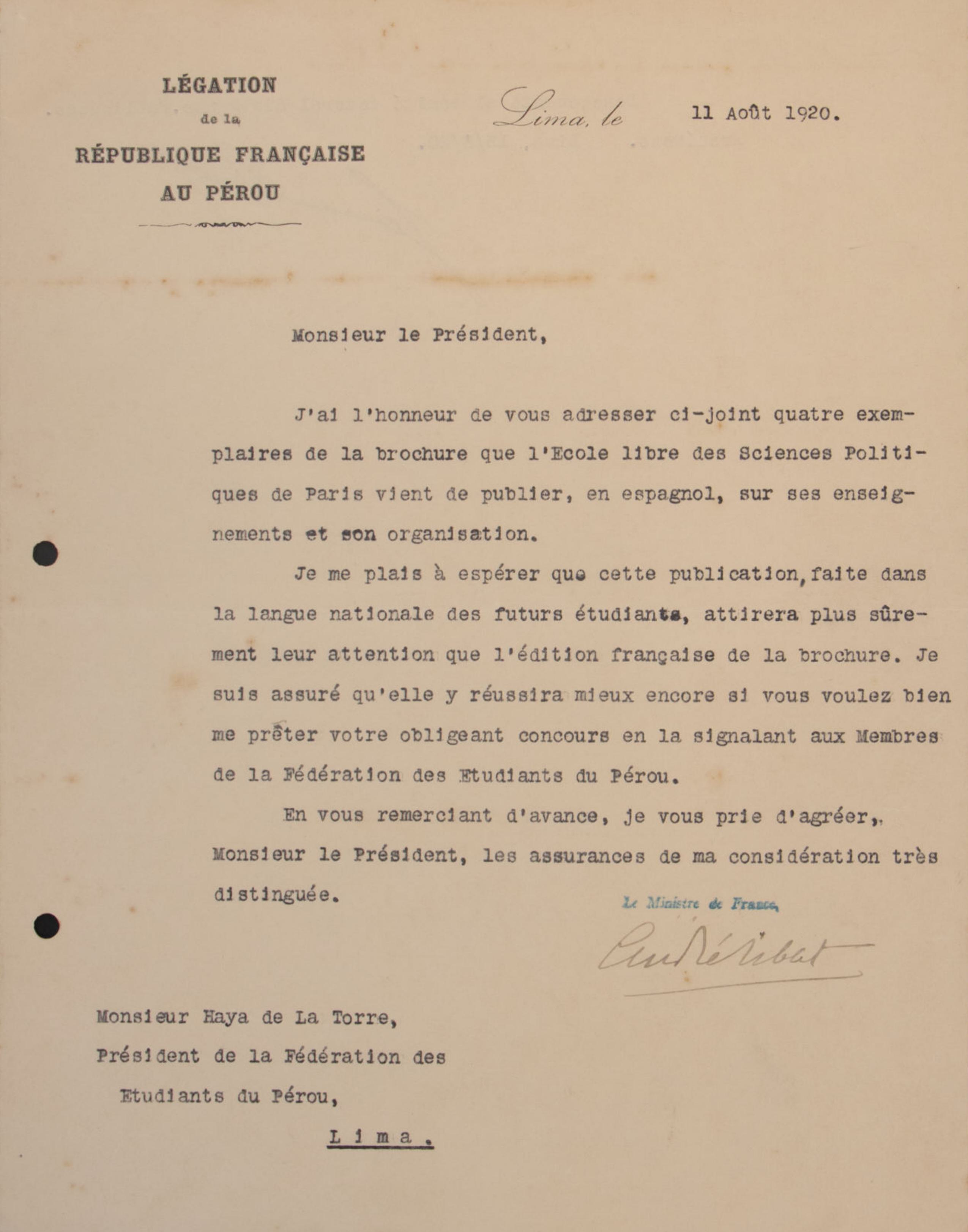 Carta de la Legación de la República Francesa en el Perú