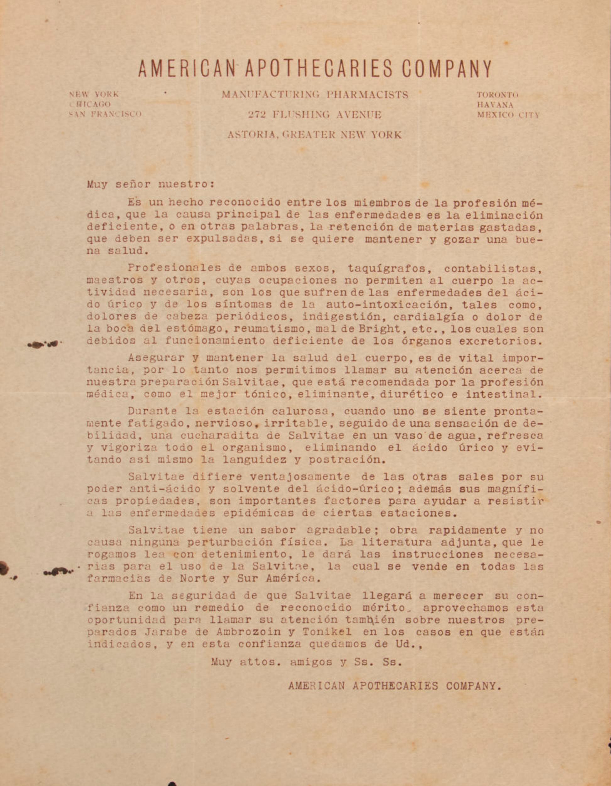 Carta de la American Apothecaries Company sobre el uso de Salvitae para la salud