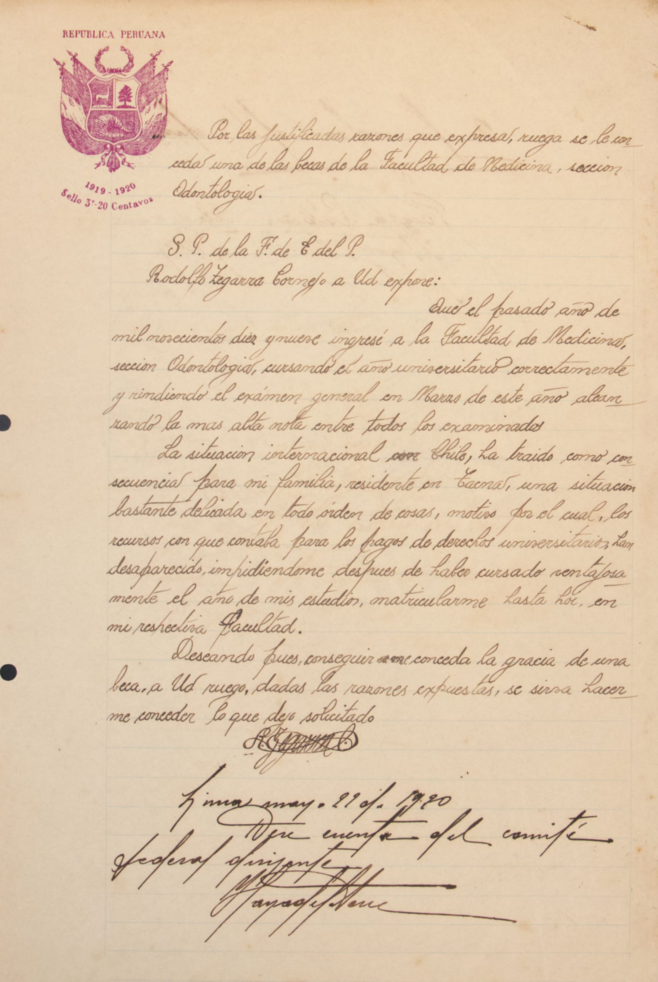 Solicitud de beca por parte de Rodolfo Zegarra Cornejo a la Facultad de Medicina, sección Odontología