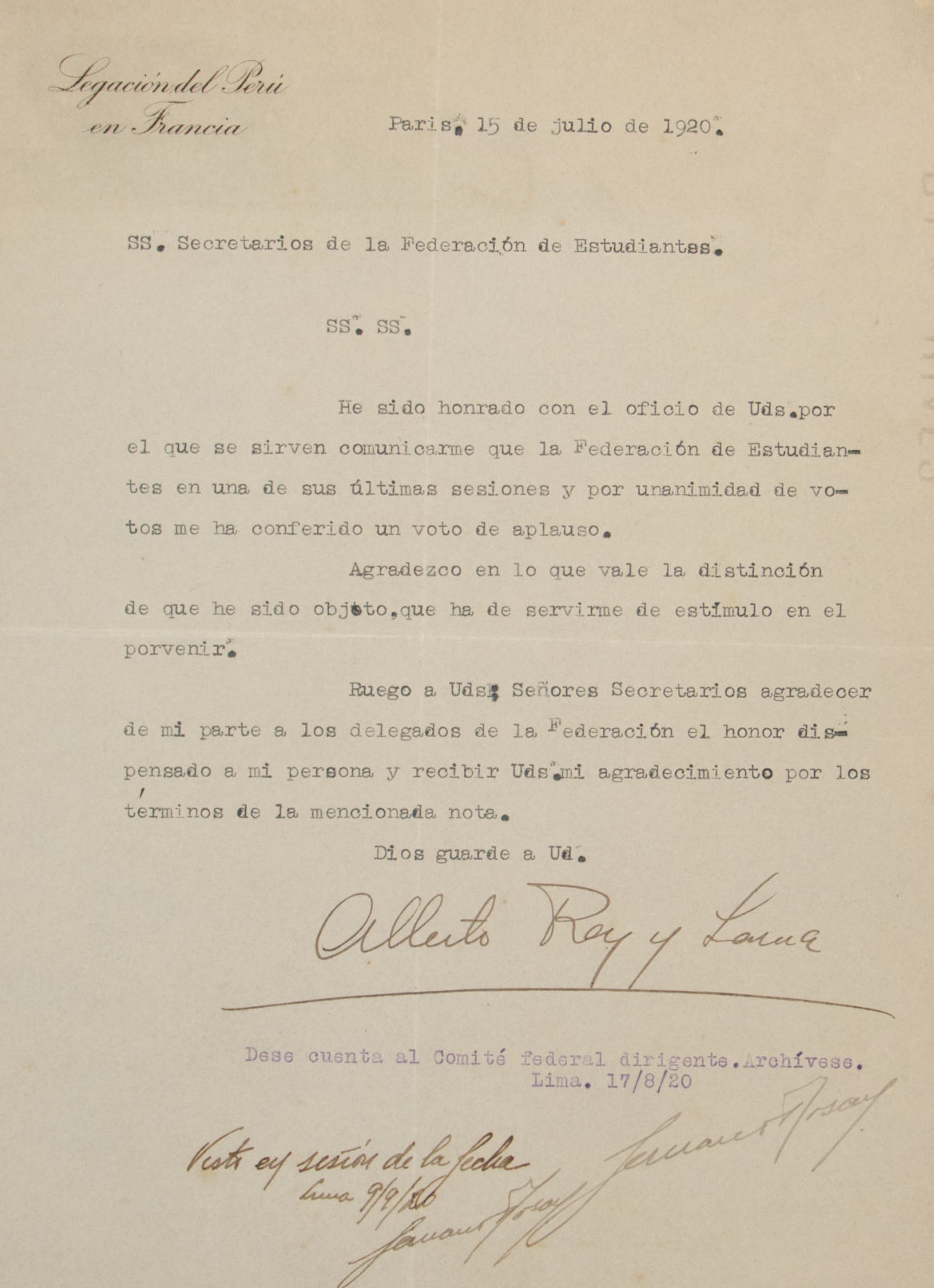 La carta, fechada el 30 de abril de 1920 y enviada por Pedro M. Oliveira al presidente de la Federación de Estudiantes del Perú, Víctor Raúl Haya de la Torre, agradece la felicitación recibida por parte de la juventud universitaria en relación con su reciente nombramiento diplomático. Oliveira expresa su gratitud por este reconocimiento, señalando su profundo significado y valor, y solicita transmitir su agradecimiento a toda la federación