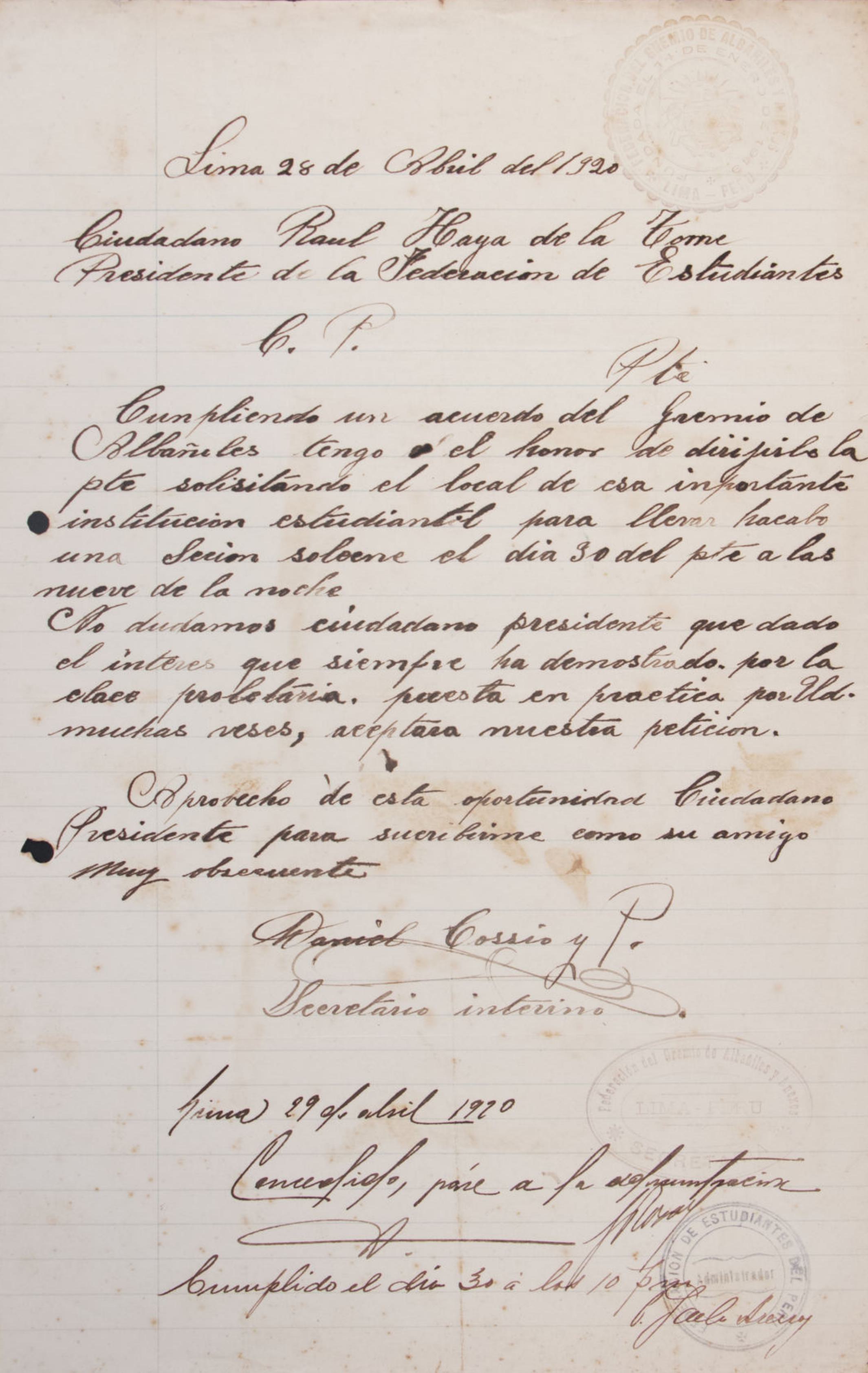 El documento es una carta fechada el 1 de mayo de 1920 y enviada desde París por Pedro Silva Surita al presidente de la Federación de Estudiantes del Perú. Silva Surita, aunque no estudiante, manifiesta su admiración por la labor realizada por el exdelegado Alberto Rey y Lama en su rol en la legación peruana en París. Expresa su apoyo y alienta la continuidad de esta labor, ofreciendo su disposición para colaborar en beneficio del país.