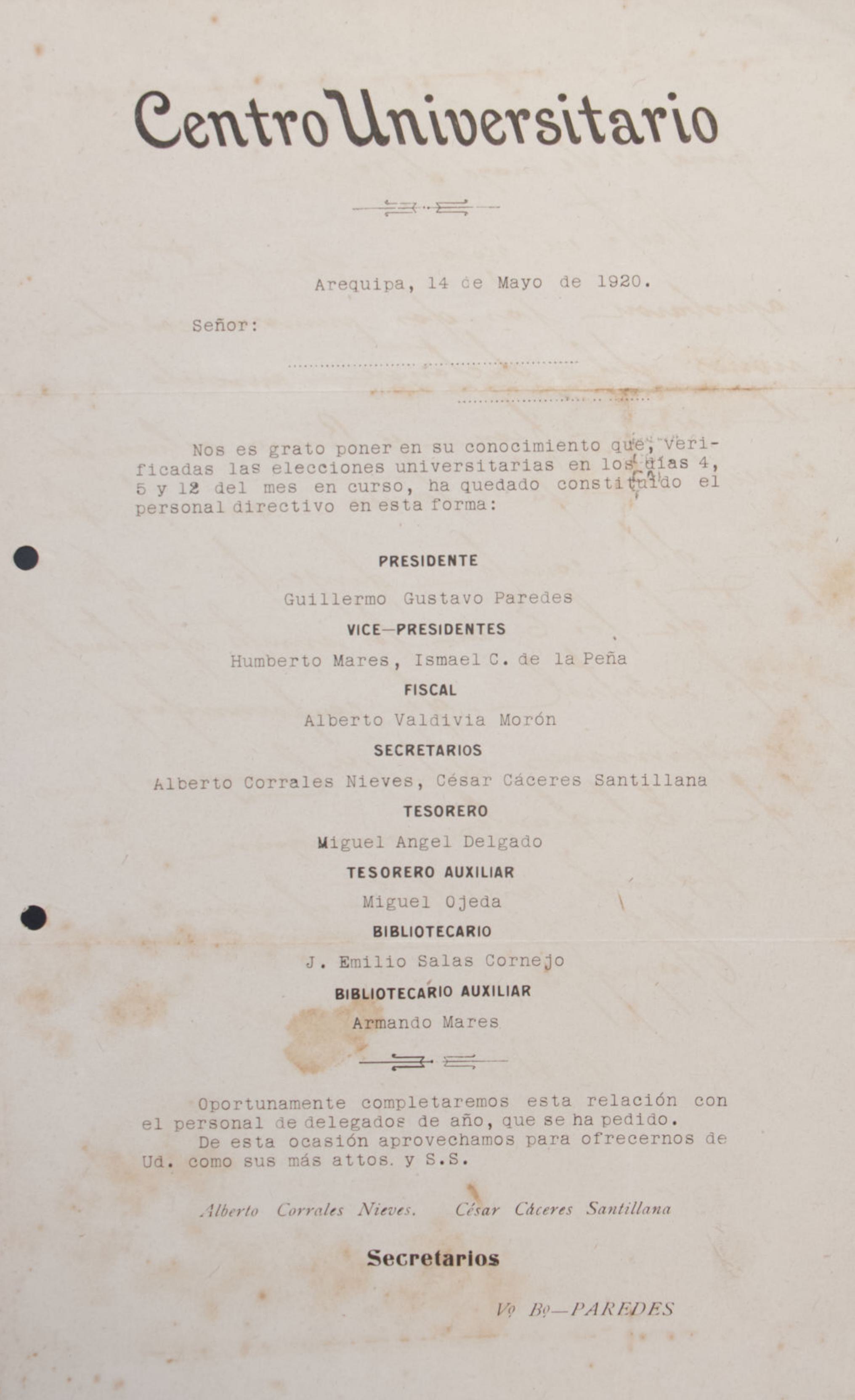 Telegrama procedente de Arequipa, fechado el 5 de mayo de 1920, dirigido al presidente de la Federación de Estudiantes del Perú, informando sobre los resultados de la elección del centro universitario, en la que Gustavo Paredes fue proclamado presidente con 71 votos, seguido de Zegarra Ballón con 53 votos y otros candidatos con 13 votos. El mensaje está firmado por Mares, presidente de la mesa escrutadora.