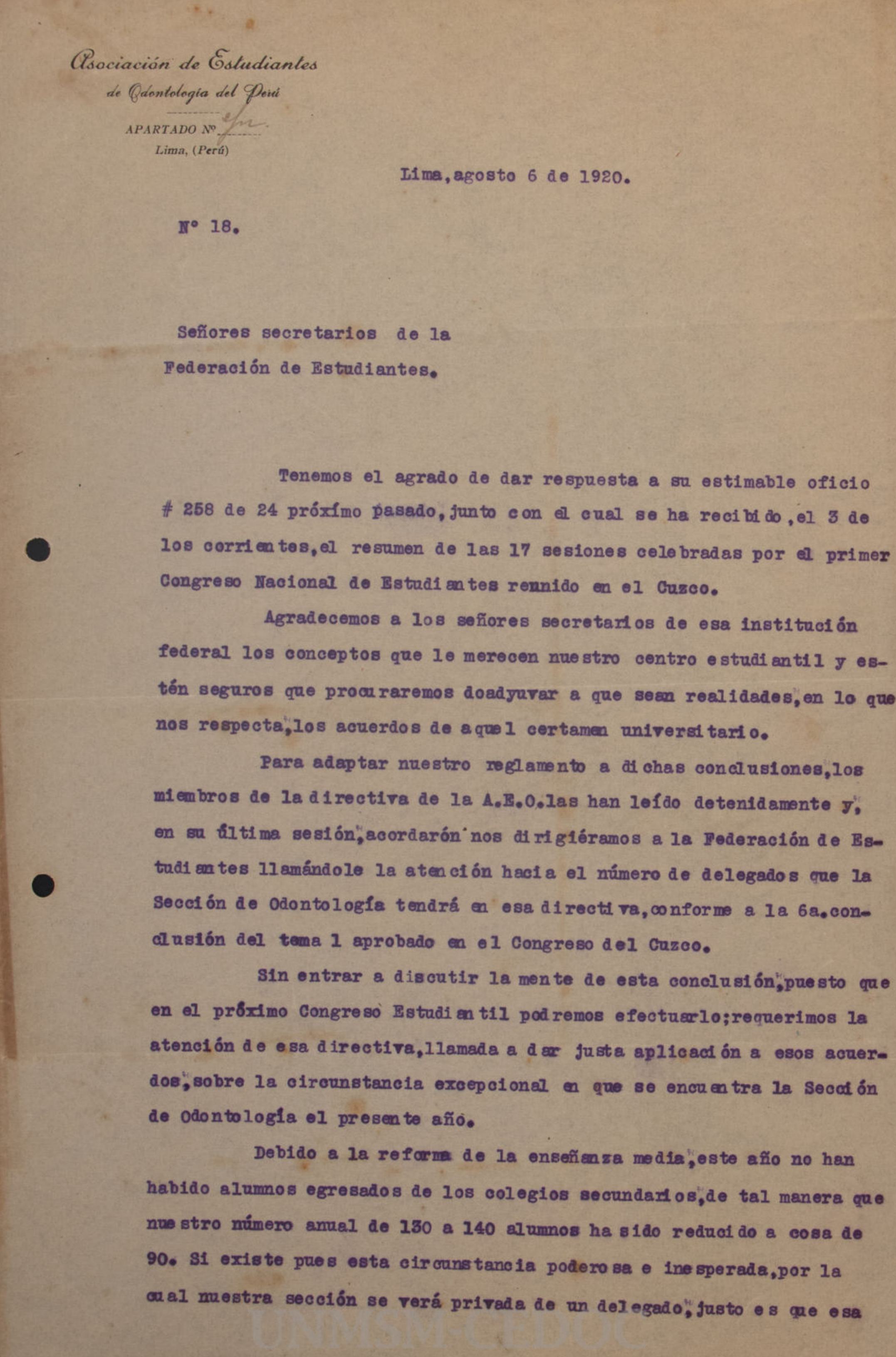 Carta de renuncia dirigida al presidente de la Comisión de Concursos y Conferencias de la Federación de Estudiantes del Perú, Ricardo A. Maguiña, el 7 de mayo de 1920. En la misiva, un miembro de la comisión manifiesta su decisión de renunciar debido a la falta de información y participación en la organización de una reciente conferencia en la federación, de la cual solo tuvo conocimiento por publicaciones en los diarios. Explica que la renuncia busca evitar responsabilidades por decisiones tomadas sin el conocimiento de la comisión.