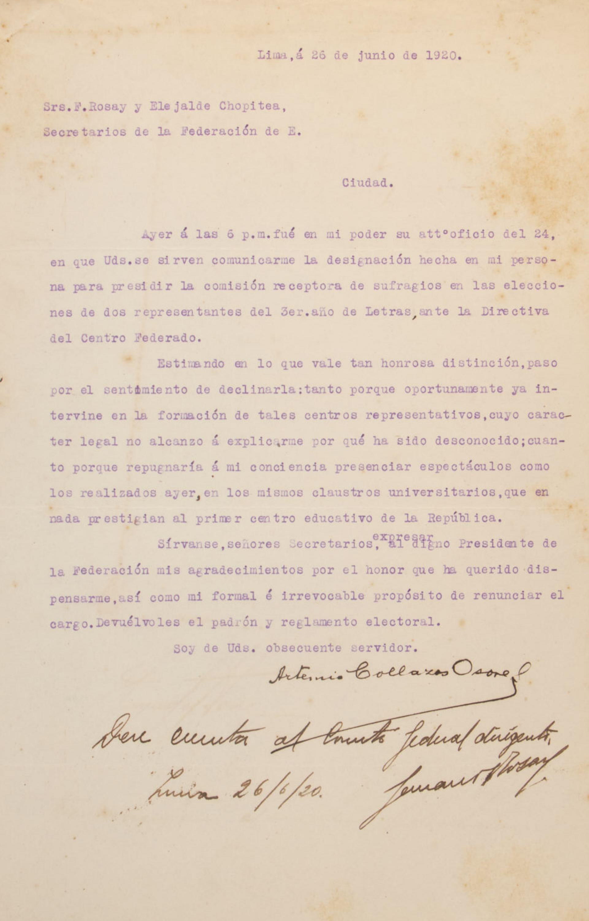 Carta del Dr. Carlos Enrique Paz Soldán, fechada el 10 de mayo de 1920, dirigida al presidente de la Federación de Estudiantes del Perú, en la que se informa sobre la presentación al "Consejo universitario" del informe relacionado con el terreno deportivo de la universidad. Además, se menciona la consideración del pedido sobre la apertura de matrícula y la concesión de becas, puntos que contarán con el apoyo del Dr. Paz Soldán en la próxima sesión del consejo.