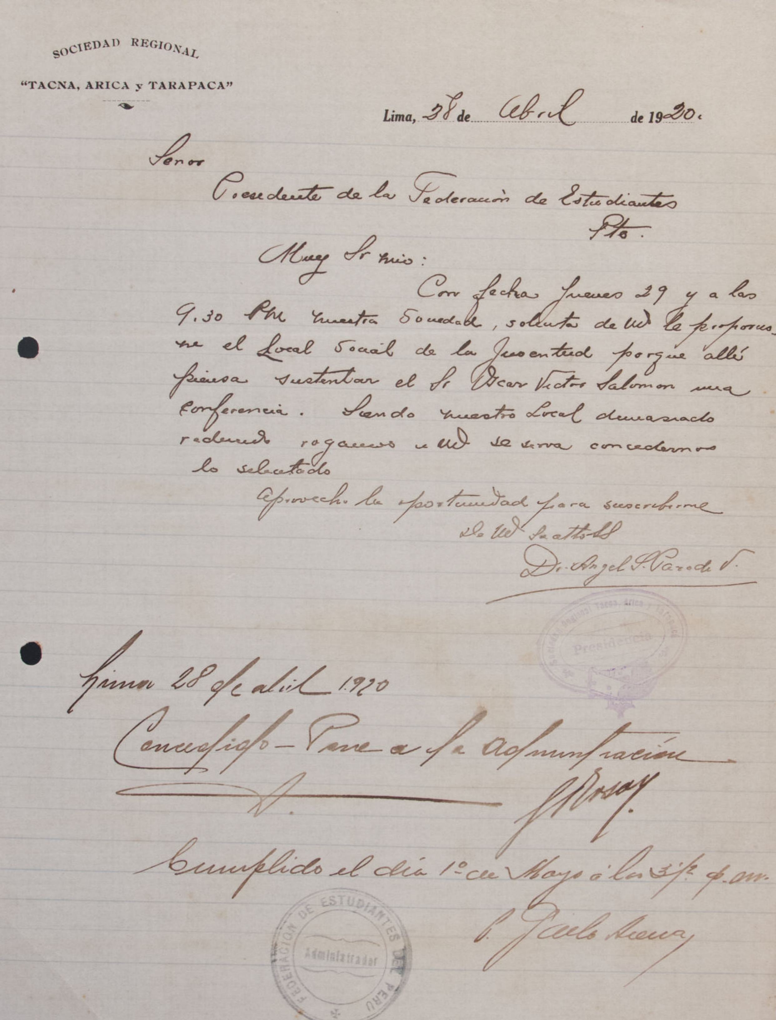 Comunicación de la Universidad Mayor de San Marcos, fechada el 11 de mayo de 1920, en la que se informa al presidente de la Federación de Estudiantes del Perú sobre la autorización del consejo universitario para que la federación perciba íntegramente la renta generada por el campo deportivo adjudicado a la universidad.