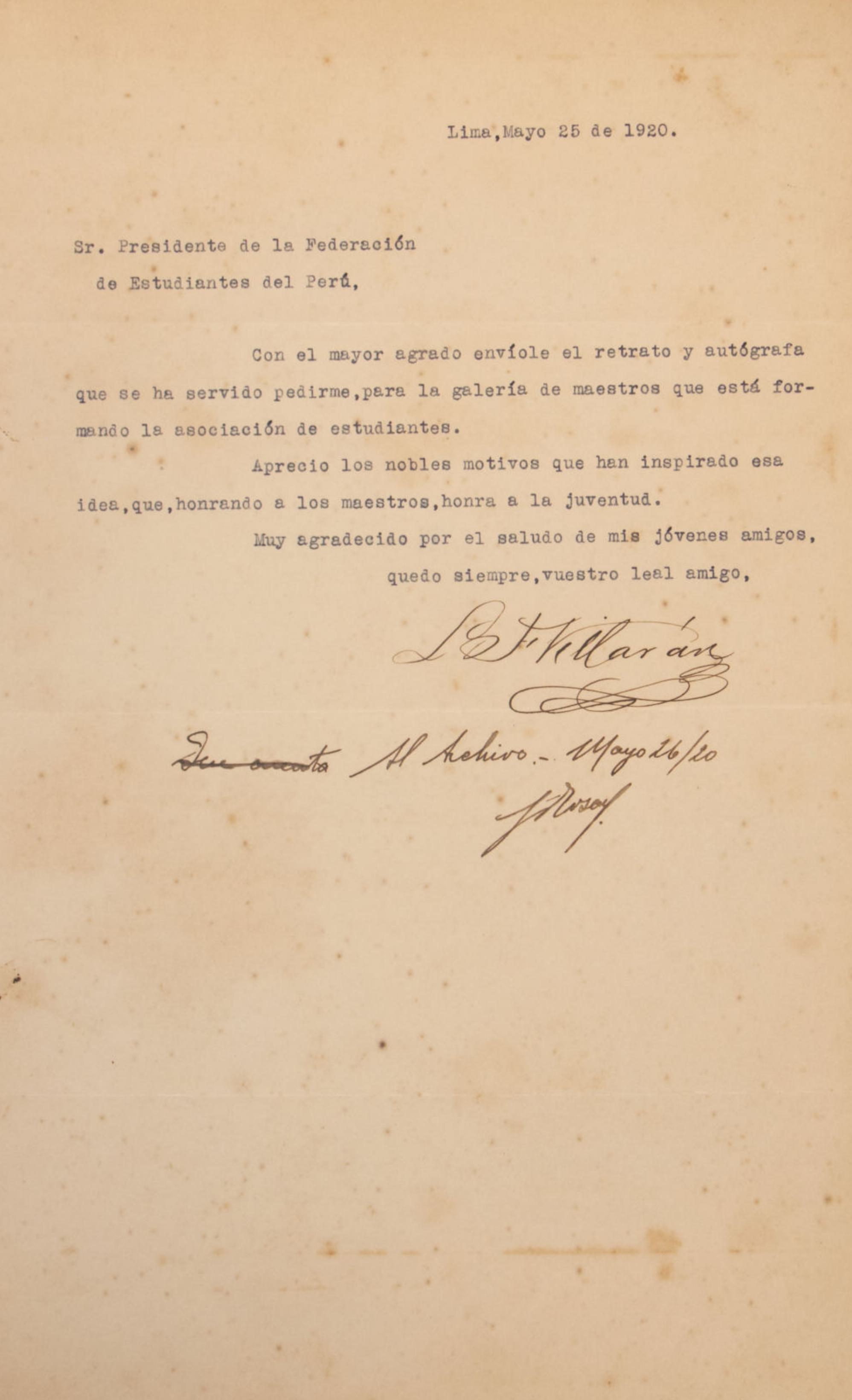 Envío de retrato y autógrafa para la galería de maestros por B. Villarán