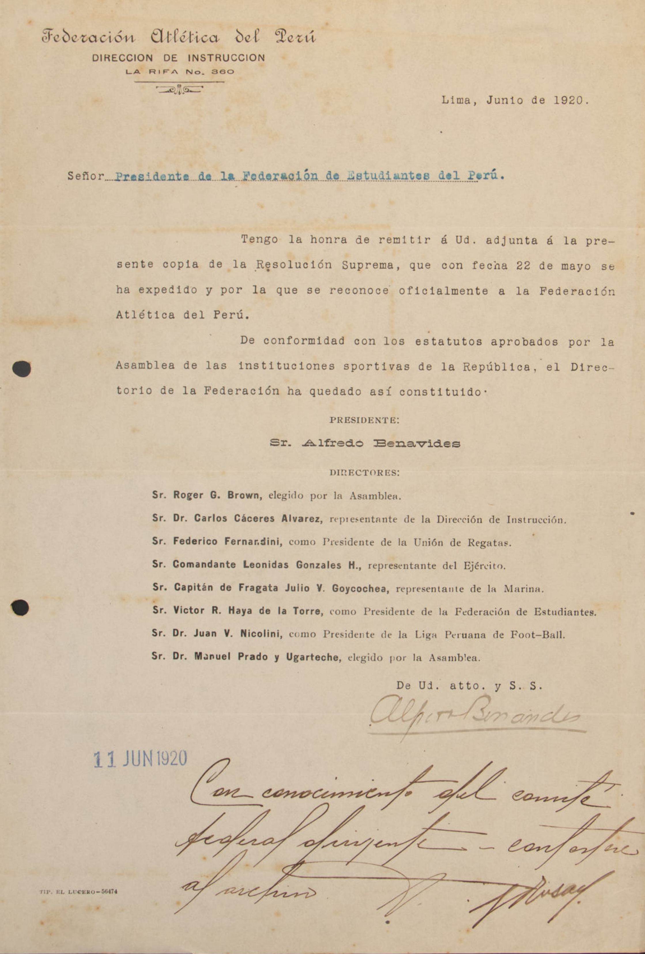 Carta sobre reconocimiento oficial de la Federación Atlética del Perú