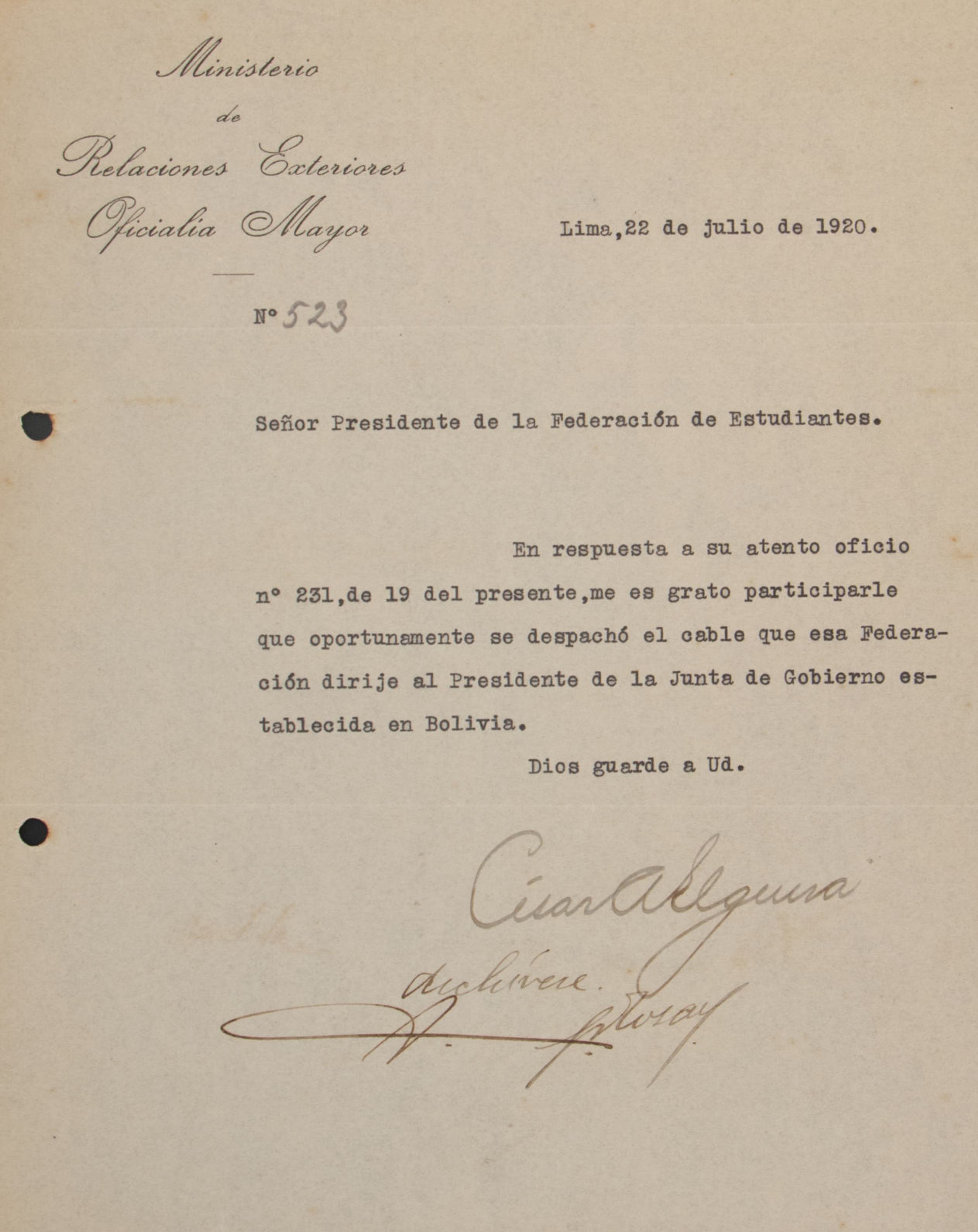 La Asociación de Estudiantes de Ingeniería comunica a la Federación de Estudiantes del Perú la designación de Eloy Vega y Luque como profesor colaborador en la Universidad Popular. Destacan su entusiasmo, compromiso con los ideales de la juventud y experiencia en la enseñanza. La asociación reafirma su apoyo a la universidad popular y expresa sus mejores deseos para el éxito de este proyecto educativo.