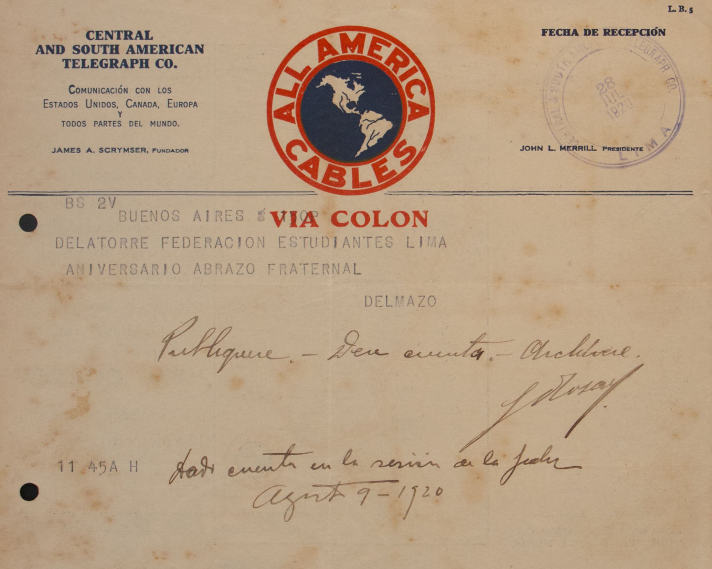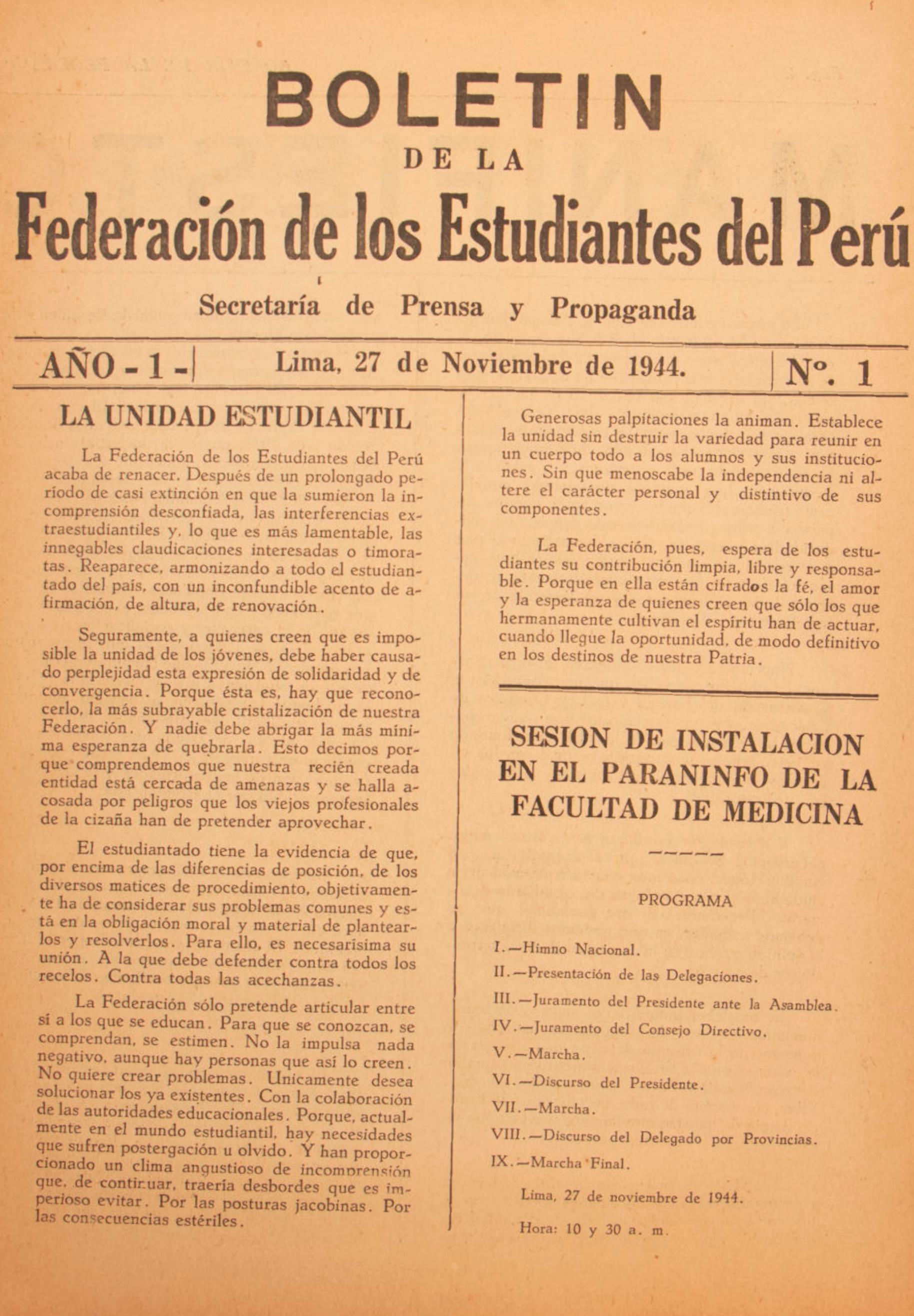 El 15 de mayo de 1922, la Universidad Nacional Mayor de San Marcos, a través de su Consejo Universitario, envió una comunicación al presidente de la Federación de Estudiantes del Perú (FEP), Don Juan Francisco Valega.