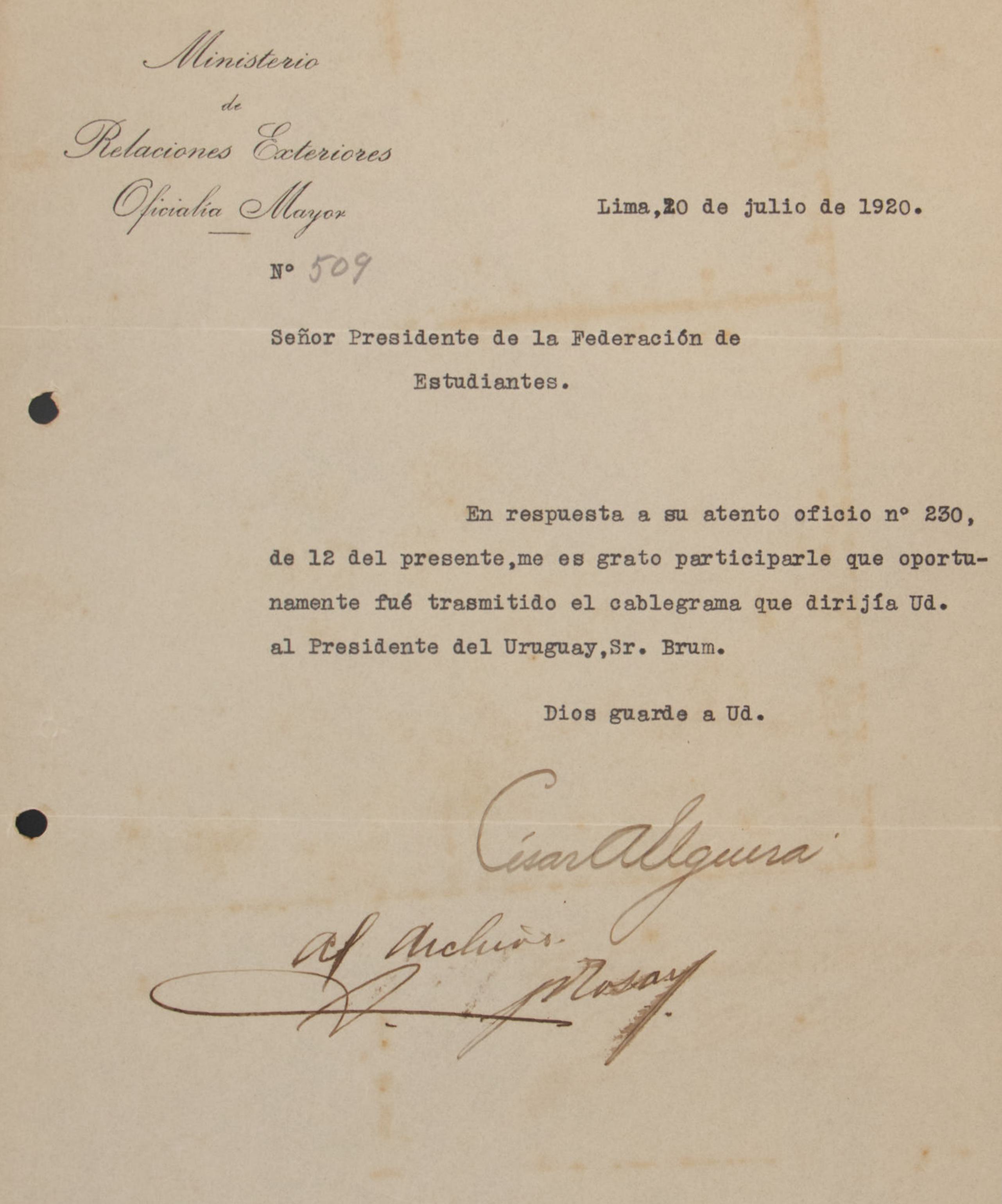 Rómulo Díaz Dianderas, delegado de farmacia, comunica al presidente de la Federación de Estudiantes del Perú, Víctor Raúl Haya de la Torre, su renuncia al cargo por motivos profesionales, ya que debe trasladarse al sur del país para ejercer su profesión de farmacéutico. Expresa su agradecimiento y solidaridad con los principios de la federación, así como su admiración por la gestión del presidente.