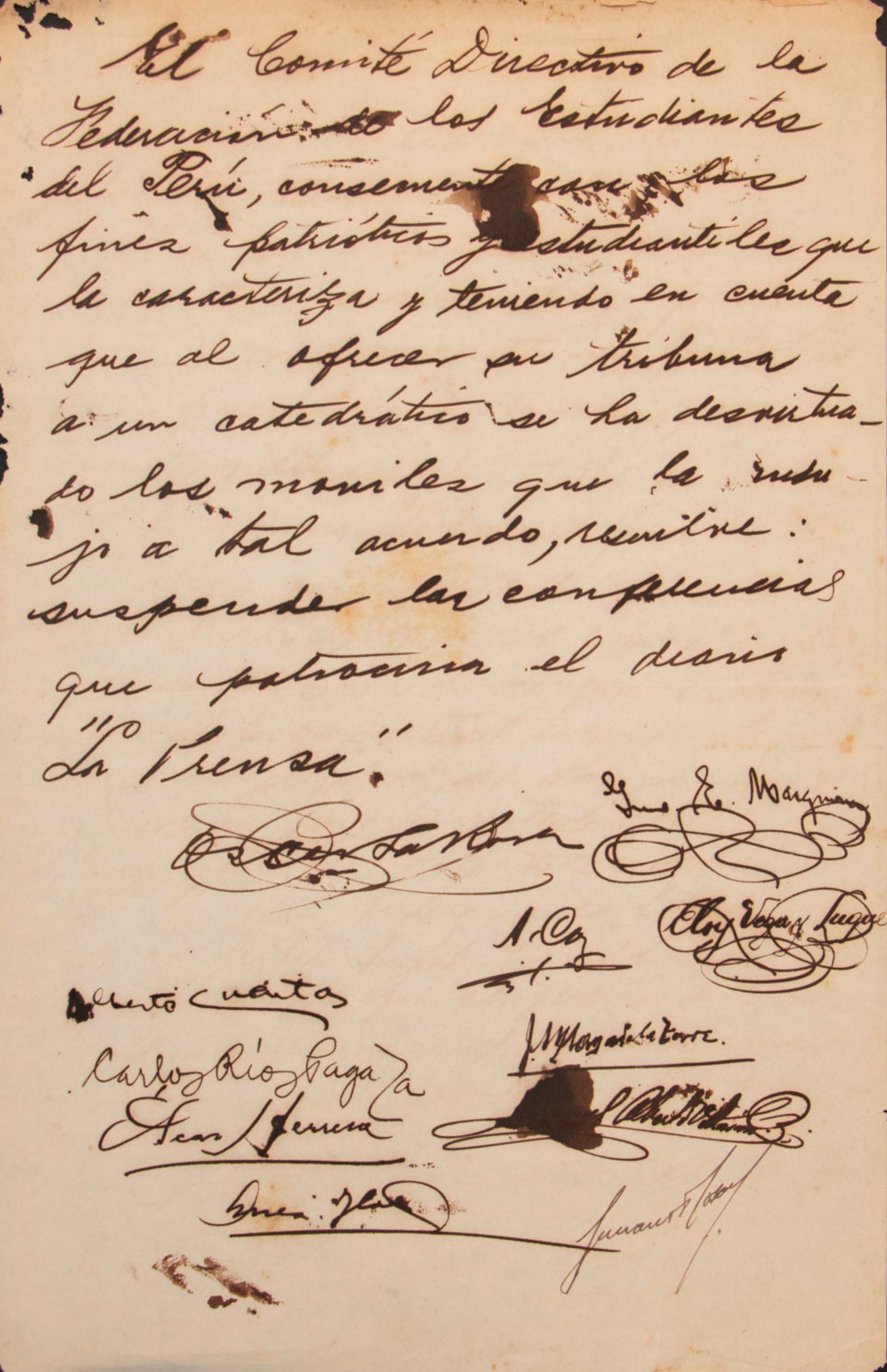 Esta carta, fechada el 20 de enero de 1920 y enviada desde el Casino Español de Lima por L. A. Soldevilla, secretario, está dirigida al secretario de la Federación de Estudiantes del Perú. En el documento, Soldevilla comunica la renovación de la junta directiva del Casino Español para el año en curso, informando que la directiva ha quedado conformada por Agustín Arias como presidente, Bernardo Fernández como vicepresidente, L. A. Soldevilla como secretario, Juan Planas Cortés como tesorero, y varios vocales.