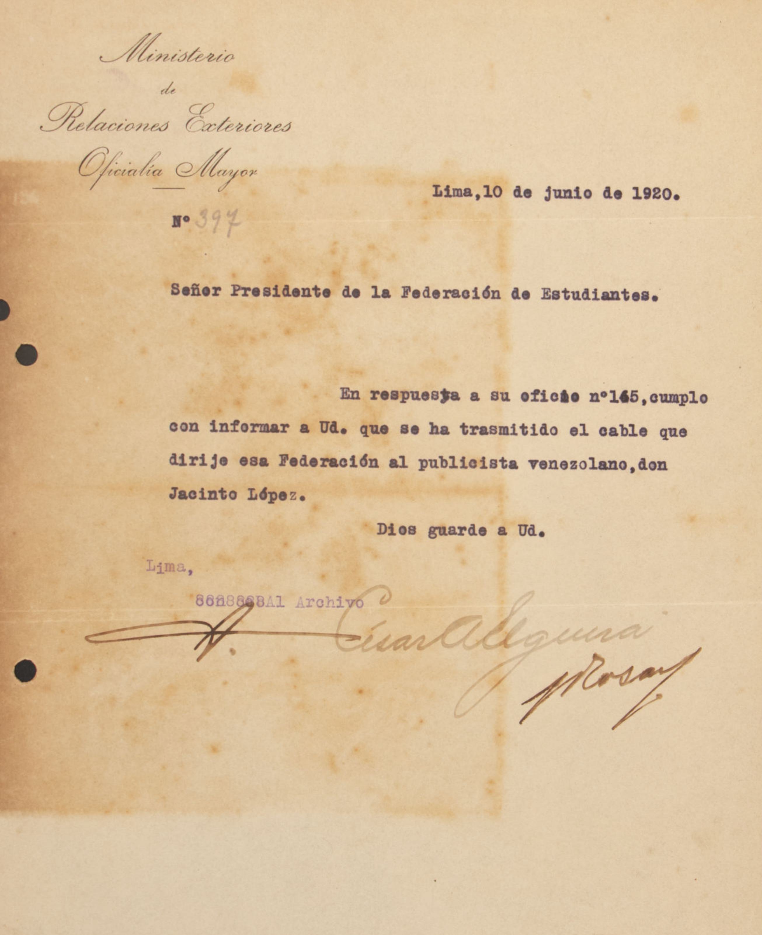 Telegrama enviado desde Julcamarca por A. Falconí, presidente del comité, y C. Montes, secretario, dirigido al presidente de la Federación de Estudiantes del Perú. Los estudiantes del Colegio Nacional de Ayacucho informan sobre una huelga declarada para solicitar el cambio de director, durante la cual fueron secuestrados por el prefecto y obligados a firmar un telegrama de desistimiento. Solicitan el apoyo de la Federación de Estudiantes para enfrentar esta situación.