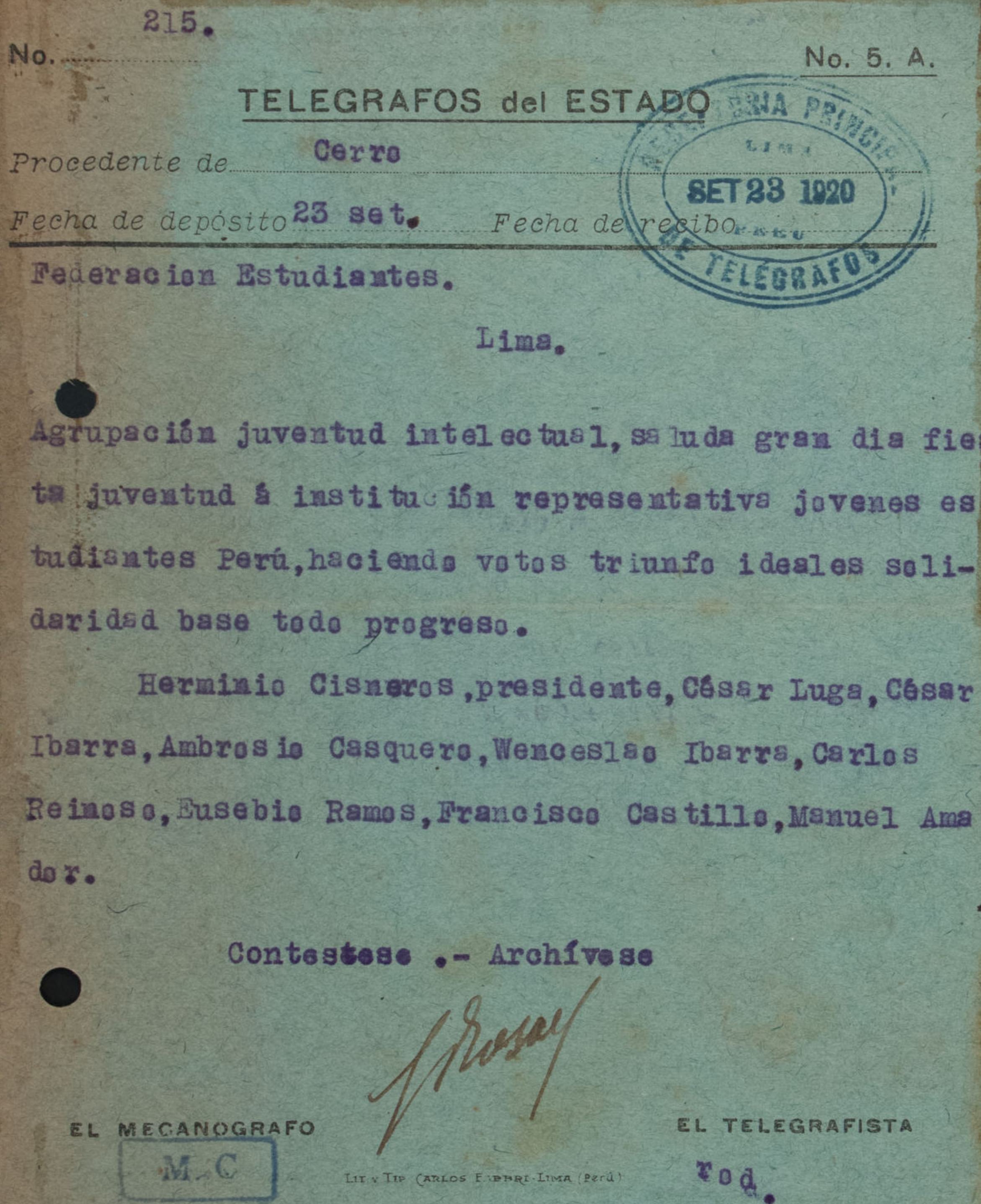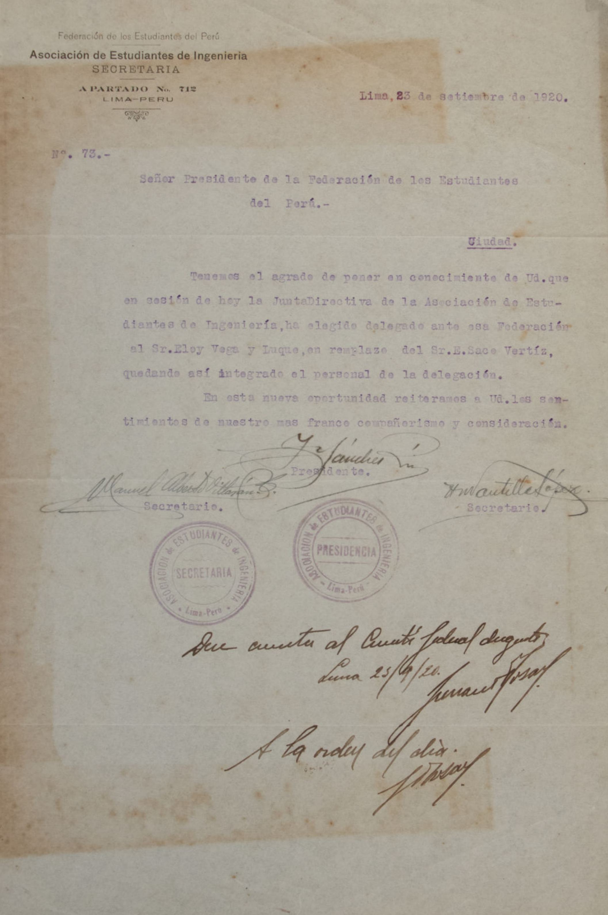 Resolución Suprema emitida por la Dirección General de Instrucción en Lima, el 22 de mayo de 1920. En el documento, se declara que la "Federación Atlética del Perú" es reconocida oficialmente como una institución de utilidad nacional, tras la solicitud presentada por su presidente. La resolución menciona que se han revisado los estatutos y la composición del directorio de la federación. El documento concluye con la rúbrica del presidente y la firma de Salomón.