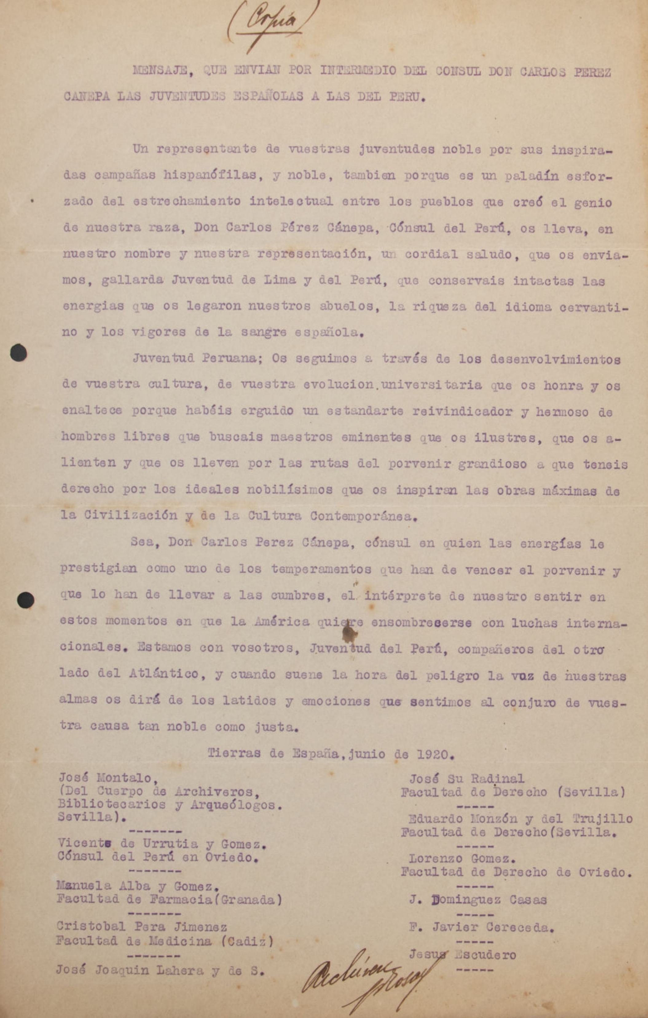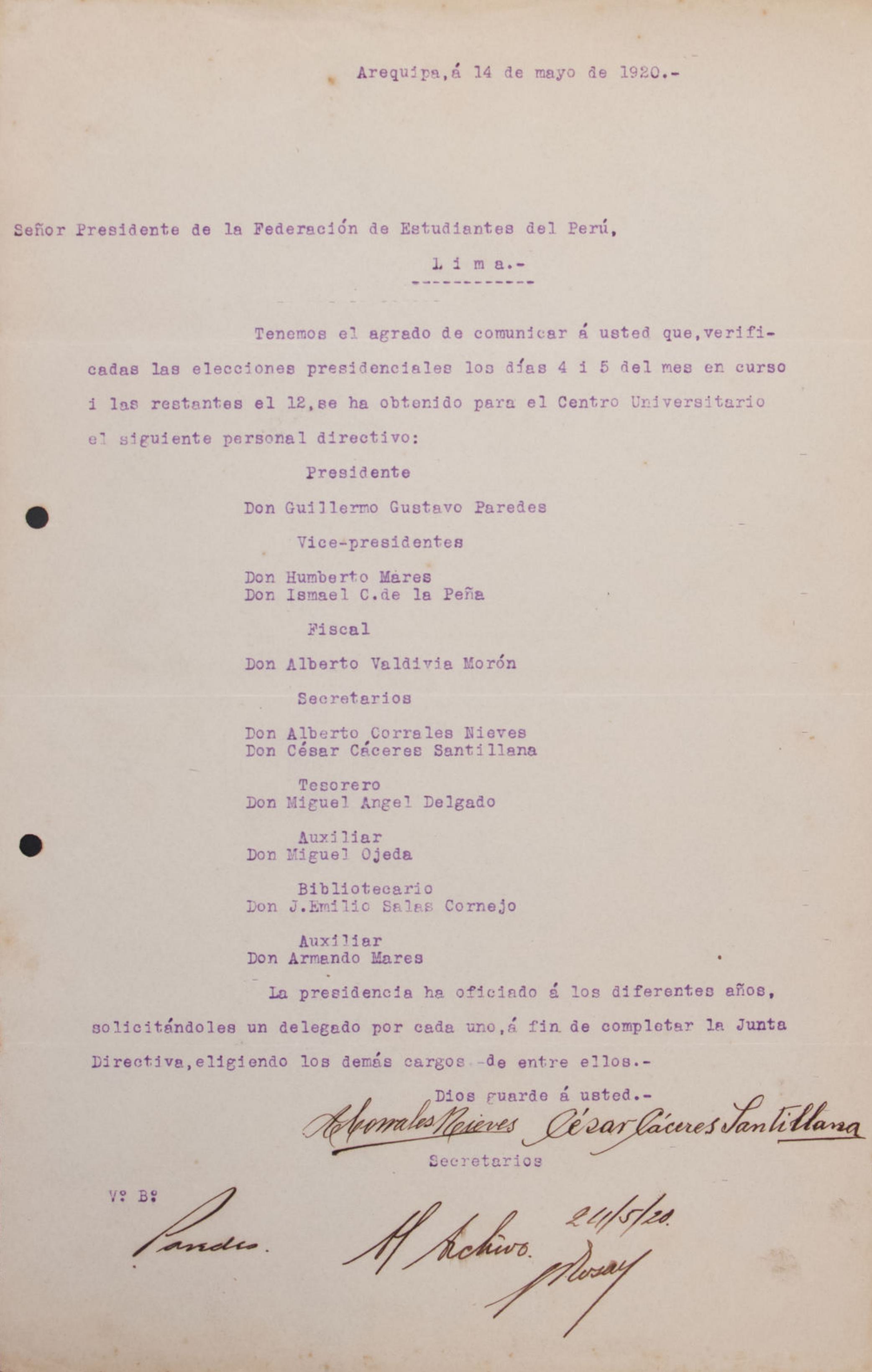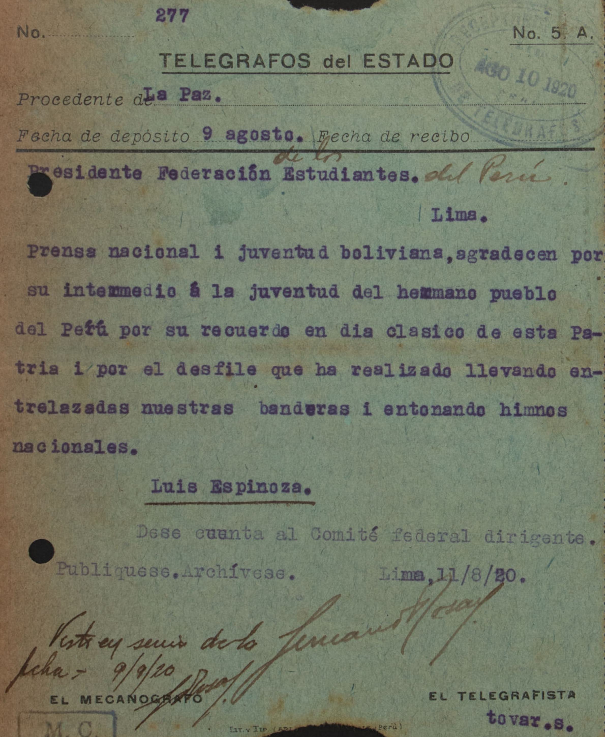 Este telegrama, recibido el 26 de enero de 1920 y dirigido a Víctor Raúl Haya de la Torre, presidente de la Federación de Estudiantes del Perú, proviene de José Nativiad Macías, rector de la Universidad Nacional de México. En el mensaje, Macías expresa el agradecimiento de la juventud mexicana por el mensaje de condolencias enviado por los estudiantes peruanos. Además, considera que esta muestra de solidaridad contribuirá a fortalecer los lazos entre ambas comunidades estudiantiles
