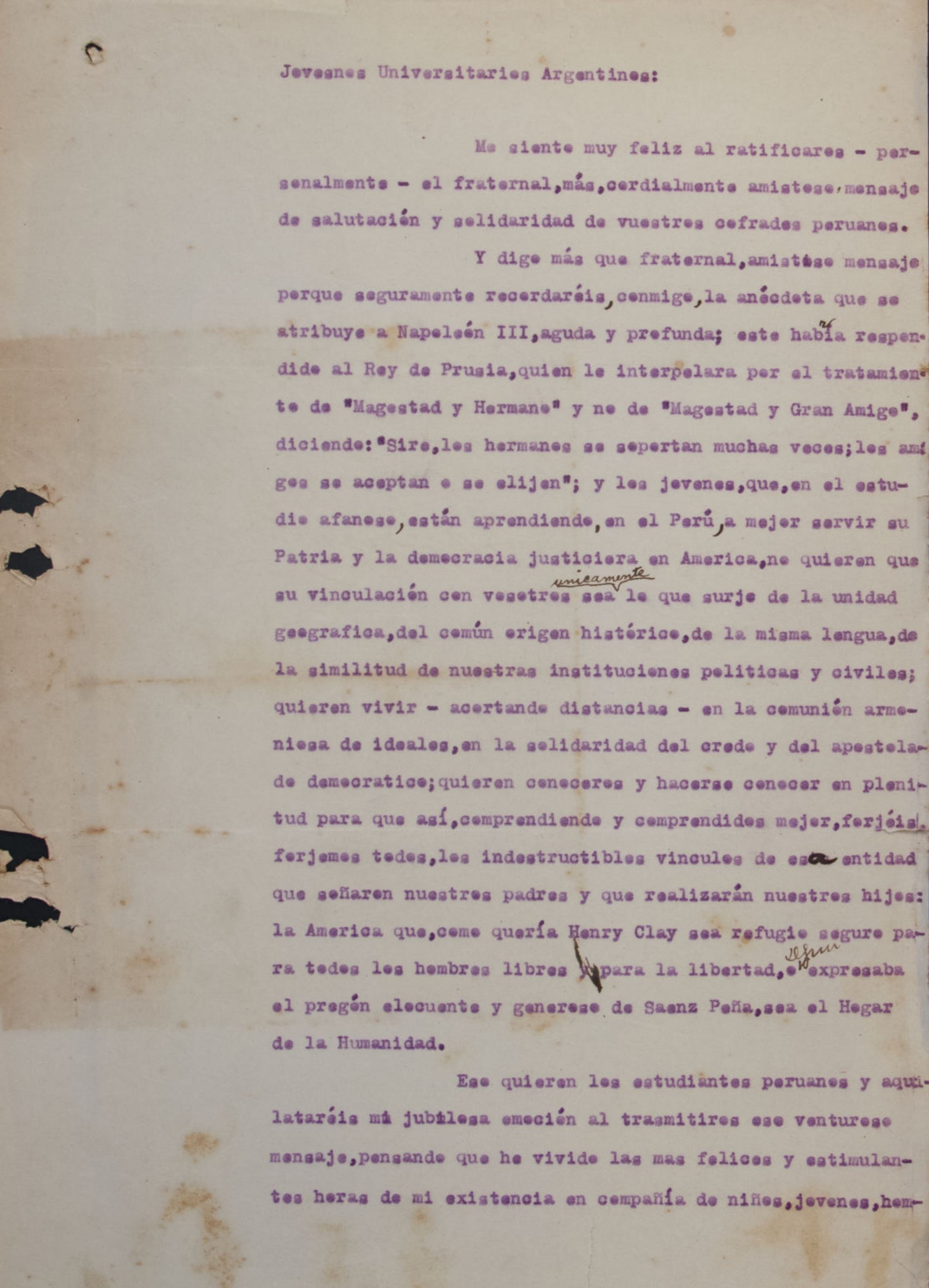 Carta enviada el 25 de mayo de 1920 por Álvaro Pinillos, presidente del Centro Universitario de La Libertad, a la Federación de Estudiantes del Perú en Lima. La comunicación informa sobre la asamblea general del 18 de mayo de 1920, donde se eligió a la nueva junta directiva para el periodo 1920-1921. Pinillos destaca el compromiso de la nueva junta en trabajar por el bienestar cultural y los intereses del departamento, solicitando la cooperación de la federación para el éxito de sus iniciativas, especialmente en vísperas del centenario de la independencia nacional. Se adjunta documento de la junta directica del Centro Universitario de La Libertad 1920-1921.