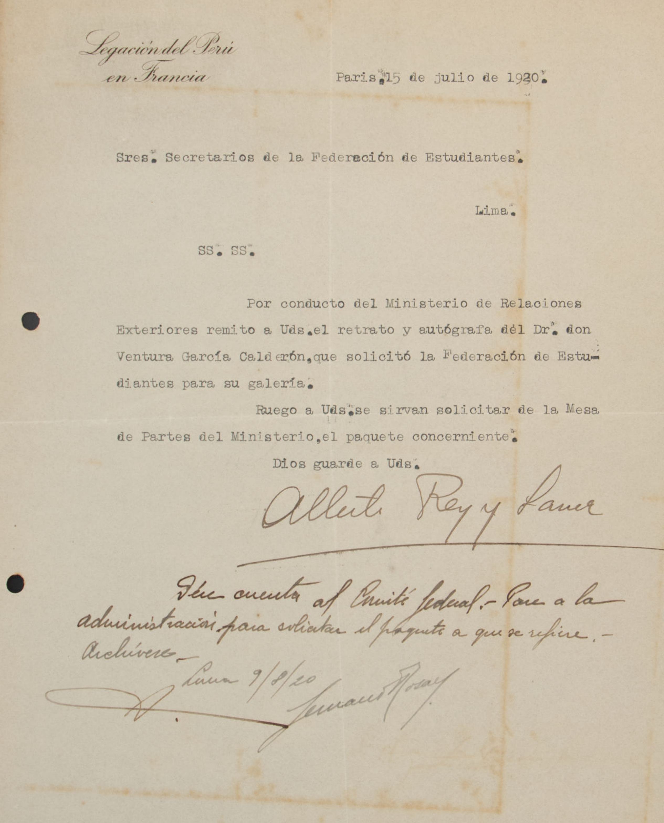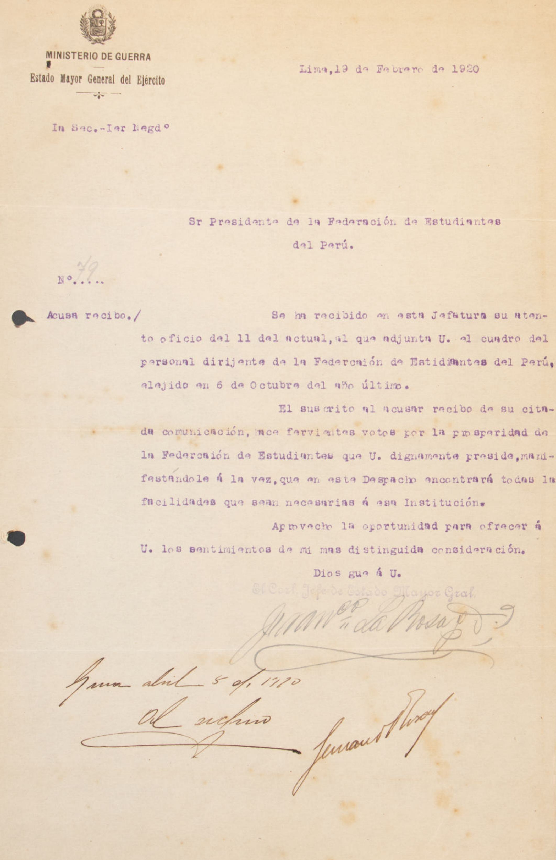 Carta fechada el 28 de mayo de 1920, escrita por Reynaldo Timoteo, secretario general de la Federación de Obreros Zapateros, y dirigida al presidente de la Federación de Estudiantes del Perú. La misiva solicita el uso del local de la federación para una conferencia sobre organizaciones obreras, programada para el 6 de junio a las 2:30 p.m. Timoteo destaca que el evento está orientado a la cultura y educación de los trabajadores y menciona las muestras de apoyo recibidas por parte de la juventud intelectual hacia las causas del pueblo.