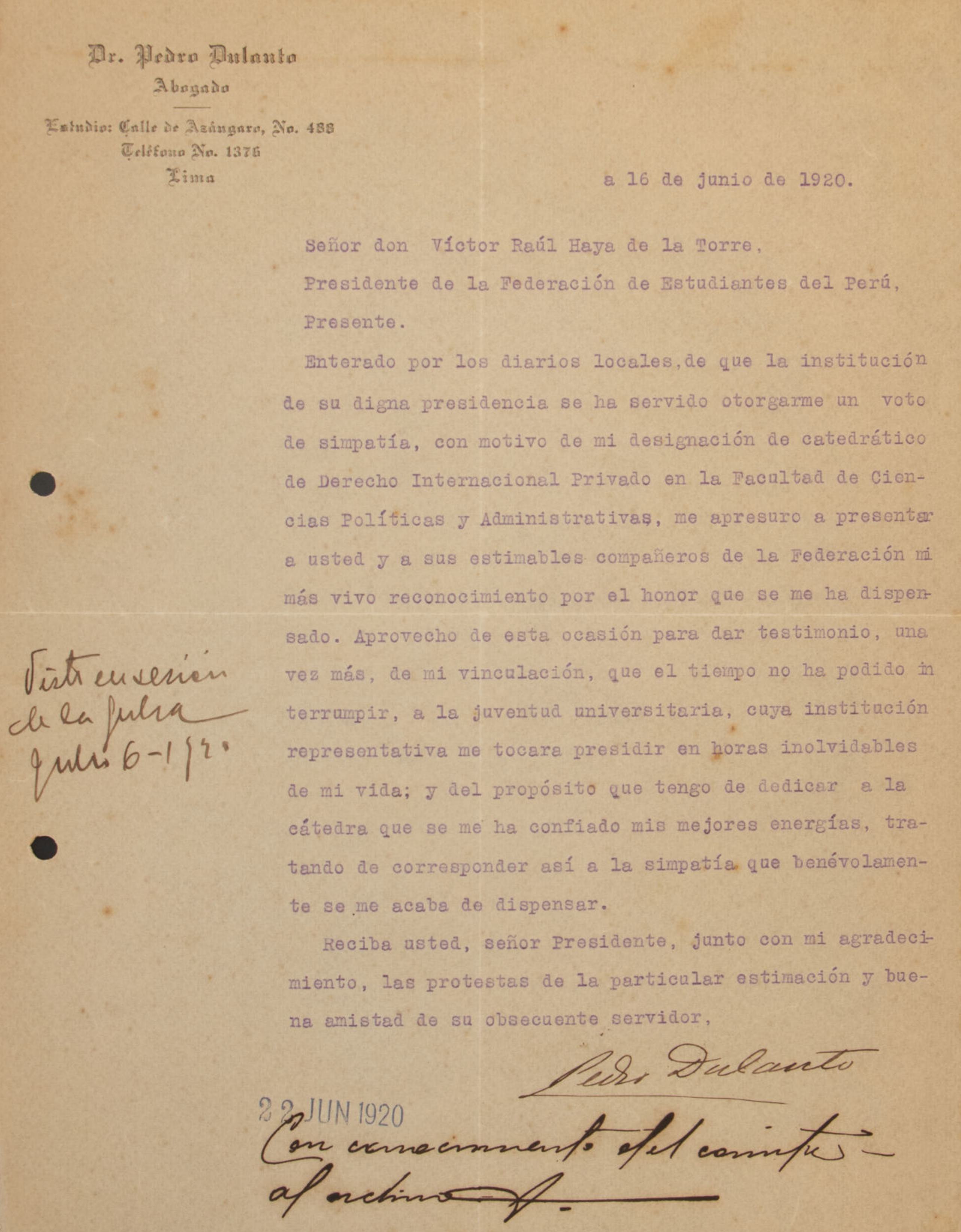 La empresa editora "El Tiempo", a través de una carta dirigida al presidente de la Federación de Estudiantes del Perú, expresa su agradecimiento por el éxito de las gestiones realizadas por la federación para obtener becas para periodistas en la universidad. La carta destaca la importancia de este logro para el periodismo, agradeciendo especialmente la asignación de una beca para su diario en la Facultad de Jurisprudencia. La dirección de "El Tiempo" felicita al presidente y asegura su apoyo para futuros esfuerzos en pro del prestigio y la cultura universitaria, así como de iniciativas de beneficio para la patria.