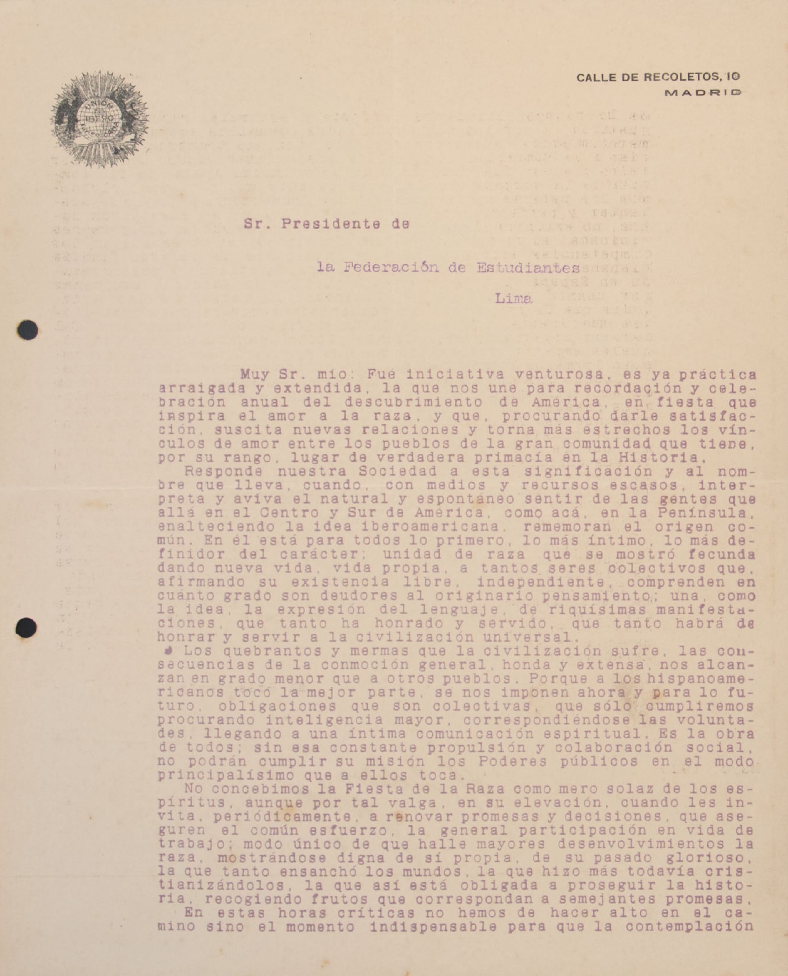 Telegrama enviado el 6 de junio de 1920 desde Pacasmayo, dirigido a Víctor Raúl Haya de la Torre, presidente de la Federación de Estudiantes del Perú en Lima. En el mensaje, Napoleón Gil expresa su entusiasta adhesión al homenaje que la juventud está ofreciendo al maestro Manzanilla, destacando su relevancia como catedrático y figura del foro parlamentario.