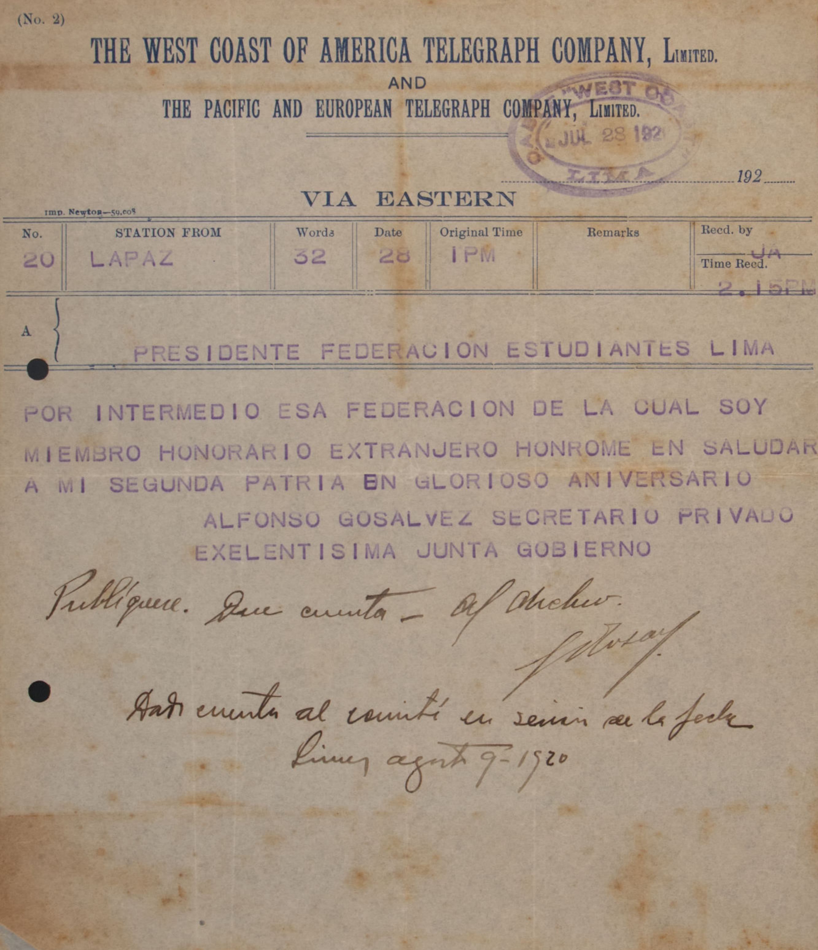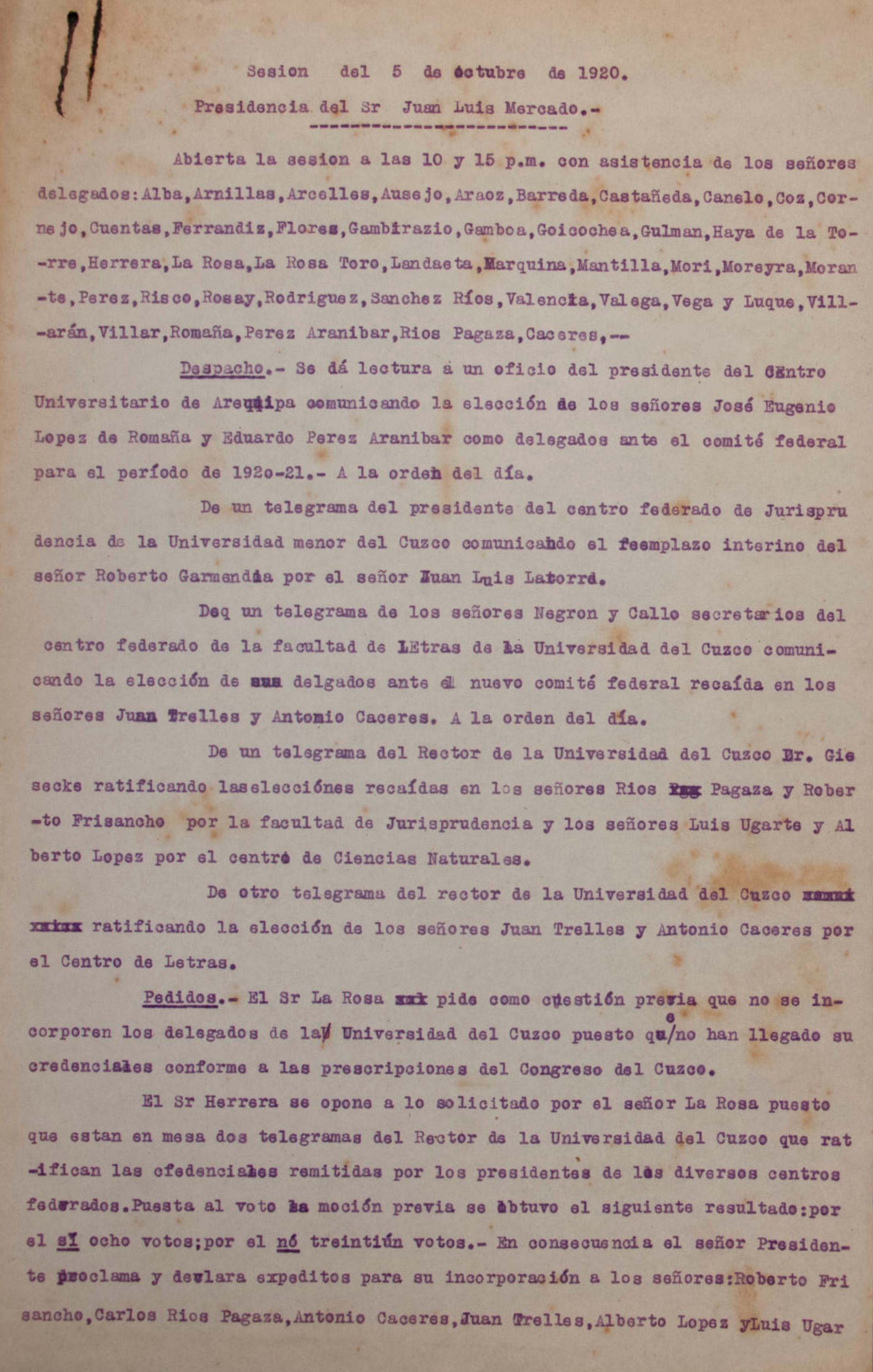 Carta enviada el 8 de junio de 1920 desde Lima por el presidente Ruis Hermoza Cuba y el secretario José Cámus Chappa al presidente de la Federación de Estudiantes del Perú. La comunicación informa sobre la reciente instalación del "Centro Normalista" y la renovación de su personal directivo. Se menciona que el centro está conformado por los alumnos de la sección profesional de la Escuela Normal de Preceptores y, al ser parte de la federación, se remite una lista general de los alumnos con el propósito de que se dicten las bases necesarias para los fines correspondientes. Se adjunta nómina del personal directivo del "Centro Normalista" y la nómina general de los alumnos.