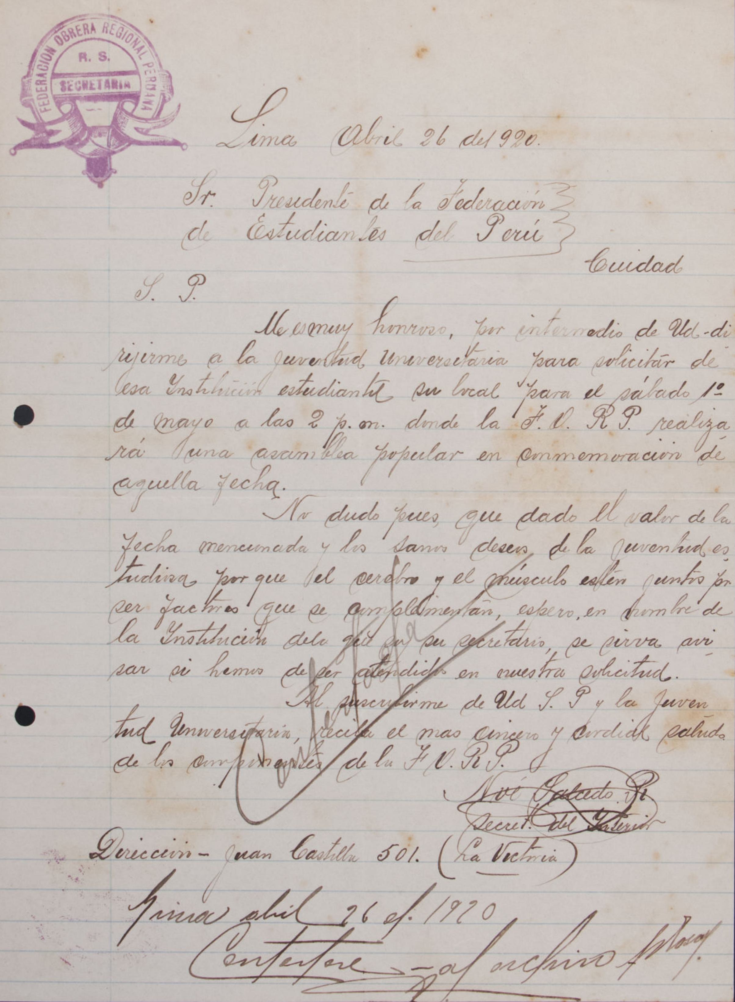 Carta de Diógenes Baca Gómez, presidente del Centro de Derecho Internacional de la Universidad Nacional en Bogotá, agradeciendo el saludo de la Federación de Estudiantes del Perú y manifestando deseos de fortalecer la comunión intelectual y espiritual entre las juventudes de ambos países. Se compromete a enviar colaboraciones para el órgano de difusión de la federación peruana y espera reciprocidad para su revista.