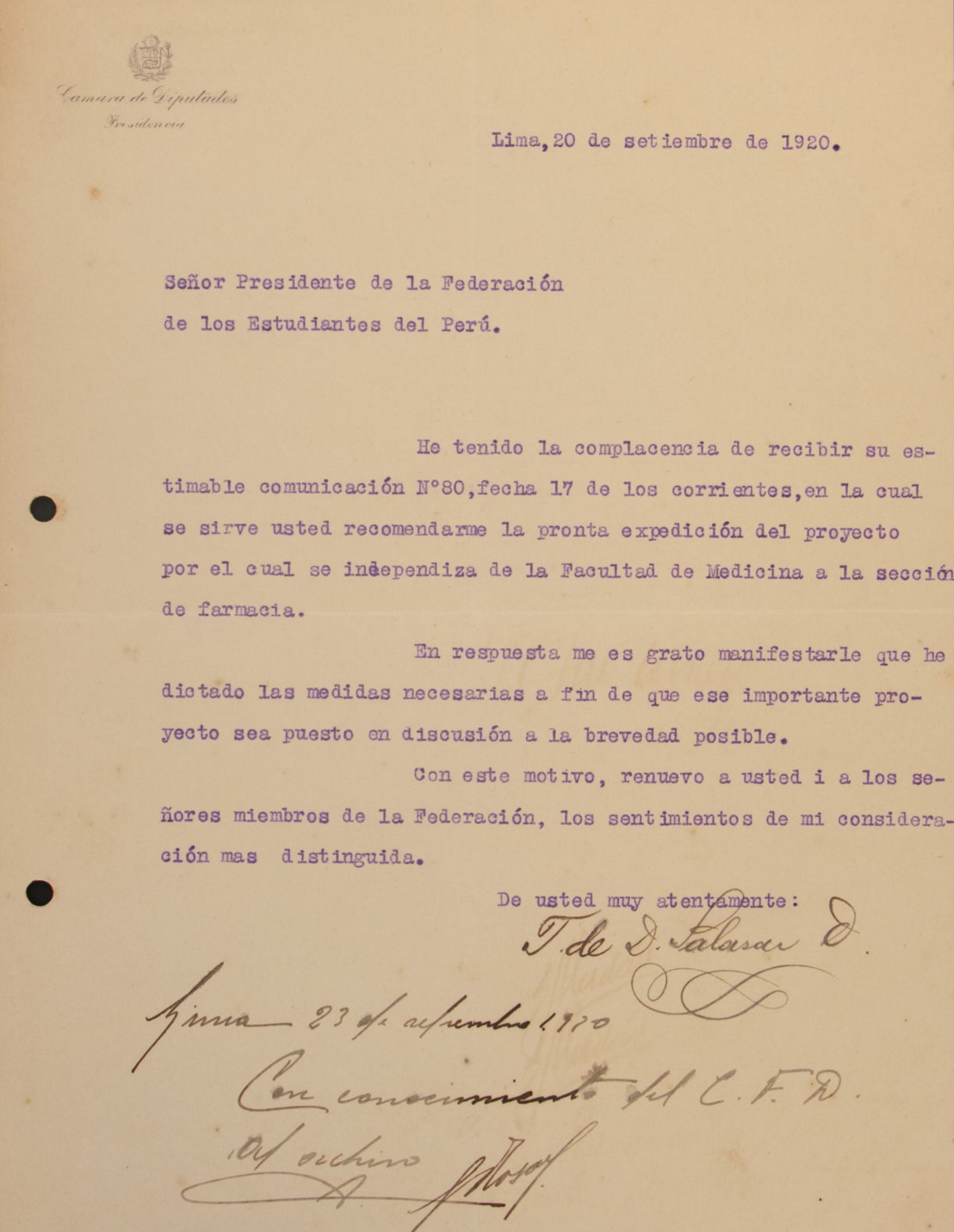 Carta en la que el Dr. Pedro Dulanto, abogado y recientemente nombrado catedrático de Derecho Internacional Privado, agradece al presidente de la Federación de Estudiantes del Perú y a sus miembros por el voto de simpatía otorgado tras su designación. Dulanto expresa su compromiso con la juventud universitaria y promete dedicar sus mejores esfuerzos a la cátedra.