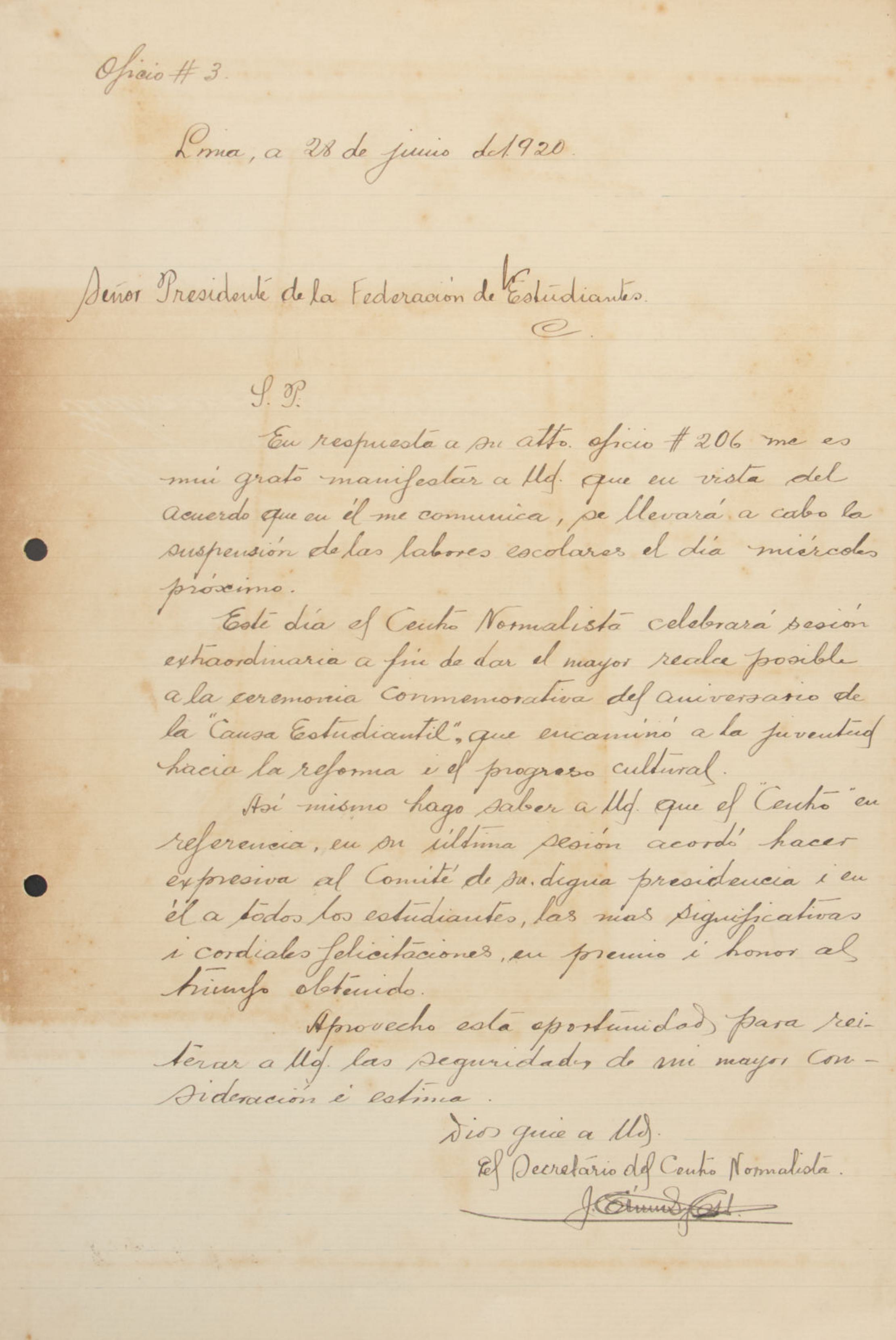 Carta en la que la Litografía y Tipografía Nacional Pedro Berrío ofrece sus servicios al presidente de la Federación de Estudiantes del Perú para la impresión de carteles con motivo de la manifestación que la federación está organizando para el próximo aniversario de los Estados Unidos. La carta detalla las medidas de los carteles (65 x 89 cm) y el costo propuesto de LP. 70.0.00 por cada cien unidades. Se solicita una respuesta breve debido al tiempo limitado para la producción.
