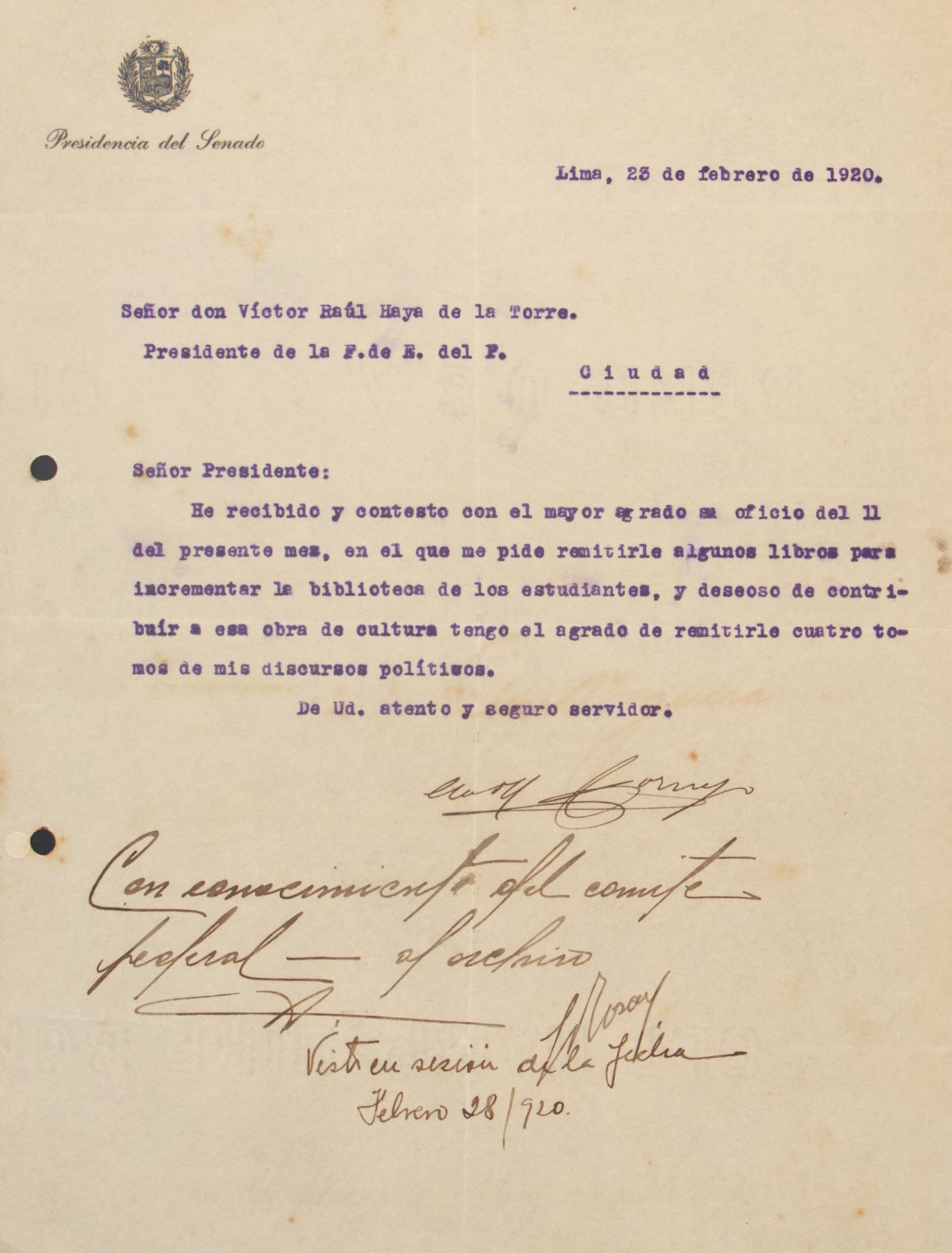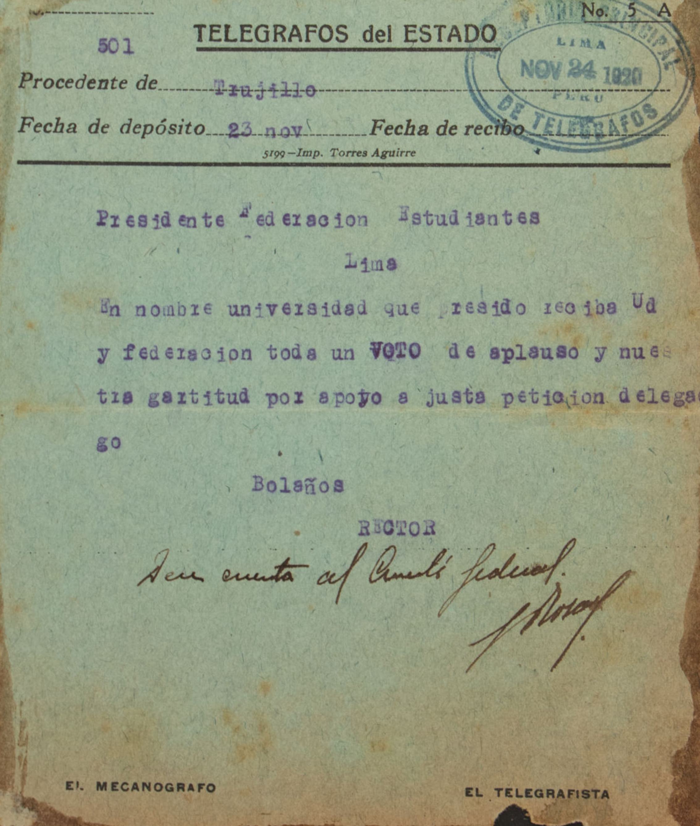 Este documento, enviado por los secretarios del "Centro de Ciencias", Alfredo Levi Rendón y Óscar Herrera, informa sobre la aceptación de la renuncia presentada por Rodrigo Franco Guerra como delegado ante el Comité de la Federación de Estudiantes del Perú. La decisión fue tomada en la sesión celebrada el día anterior, en la cual se consideraron las razones expuestas en la renuncia. Además, el Centro de Ciencias expresa un voto de aprecio y simpatía hacia Franco Guerra, reconociendo su valiosa contribución durante su breve tiempo en el comité.