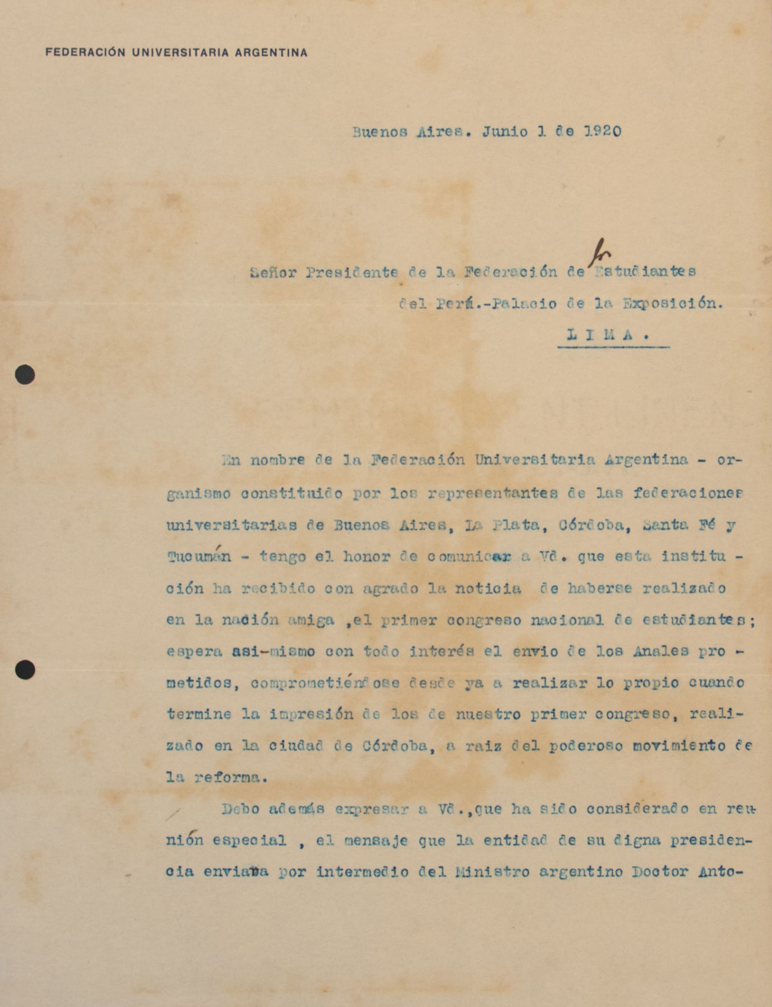 Carta de la Federación Universitaria Argentina sobre el Congreso Nacional de Estudiantes
