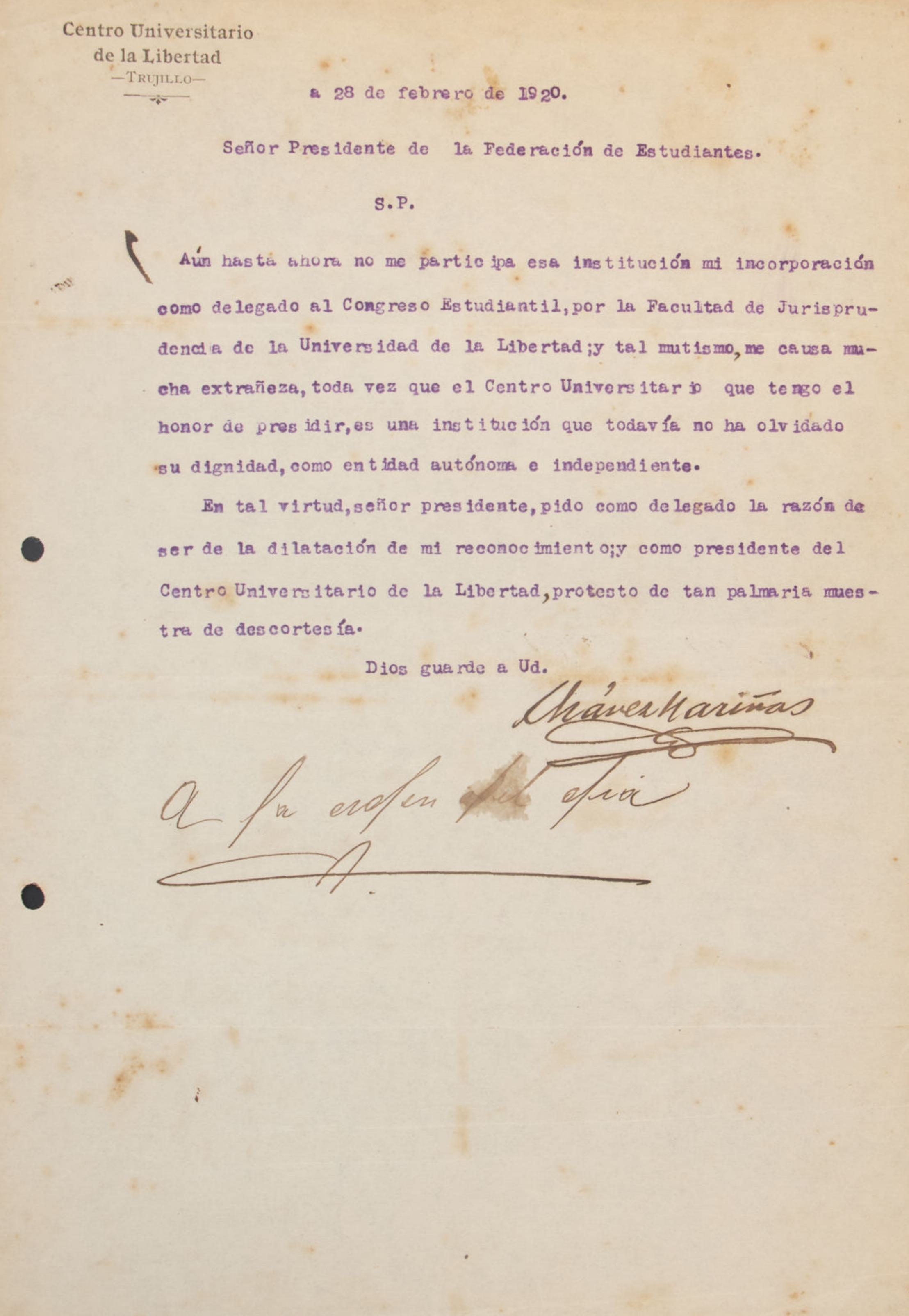 Carta de Hernando de Lavalle al Presidente de la Federación de Estudiantes del Perú