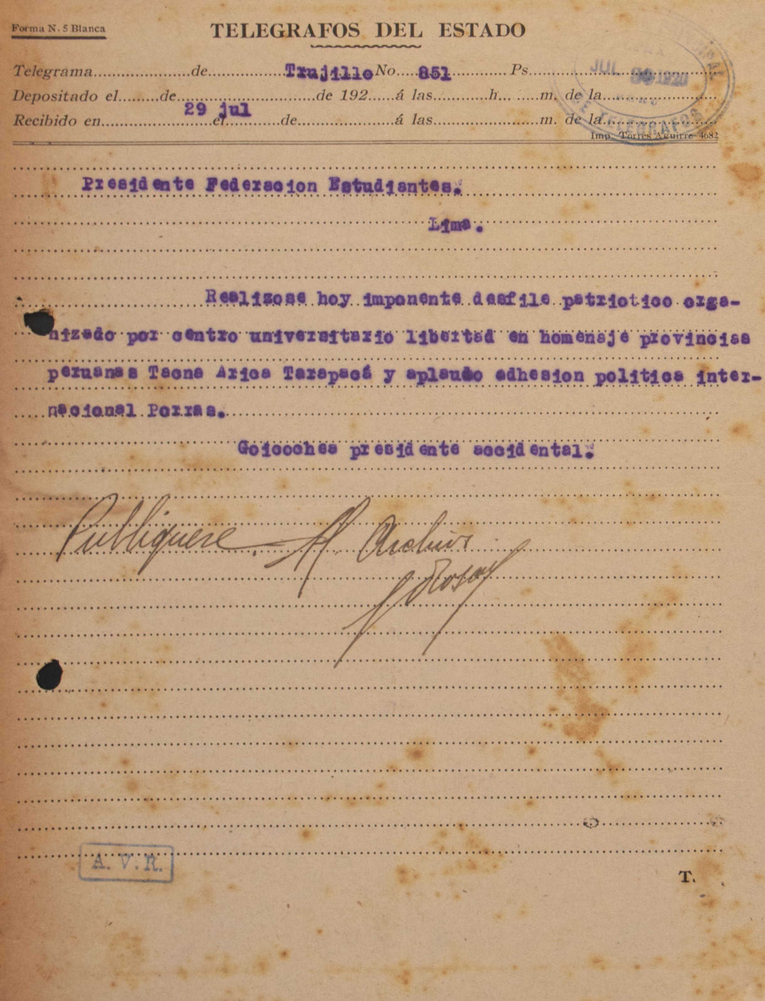 La Legación del Perú en Francia informa al presidente de la Federación de Estudiantes del Perú sobre la entrega de un oficio al compatriota Ventura García Calderón, quien ha prometido enviar un retrato y autógrafo solicitados. También se comunica que el señor Carlos Rey de Castro, encargado de Negocios en Paraguay, ha solicitado ejemplares de la revista "Studium" para distribuir entre estudiantes de Paraguay, Argentina y Uruguay.
