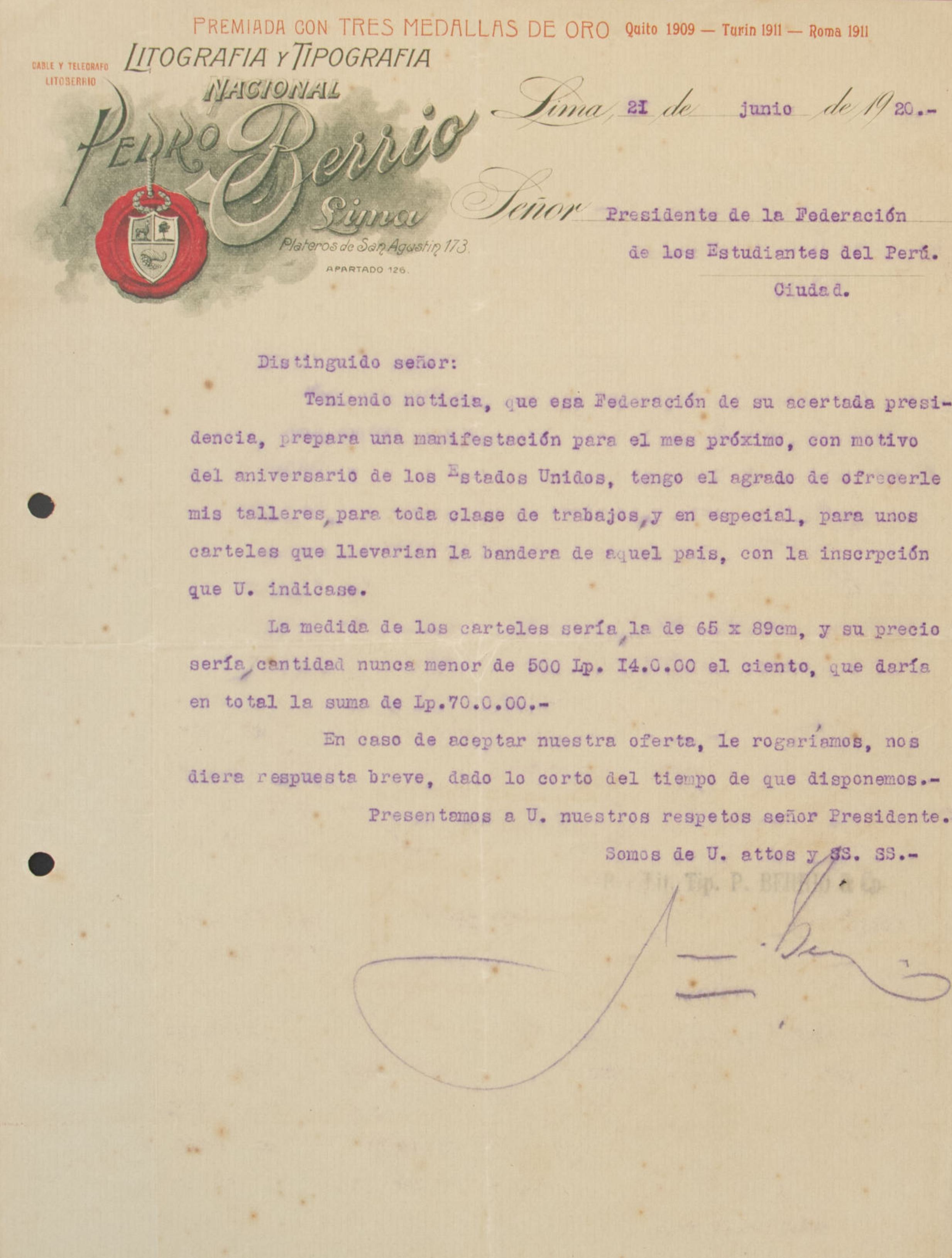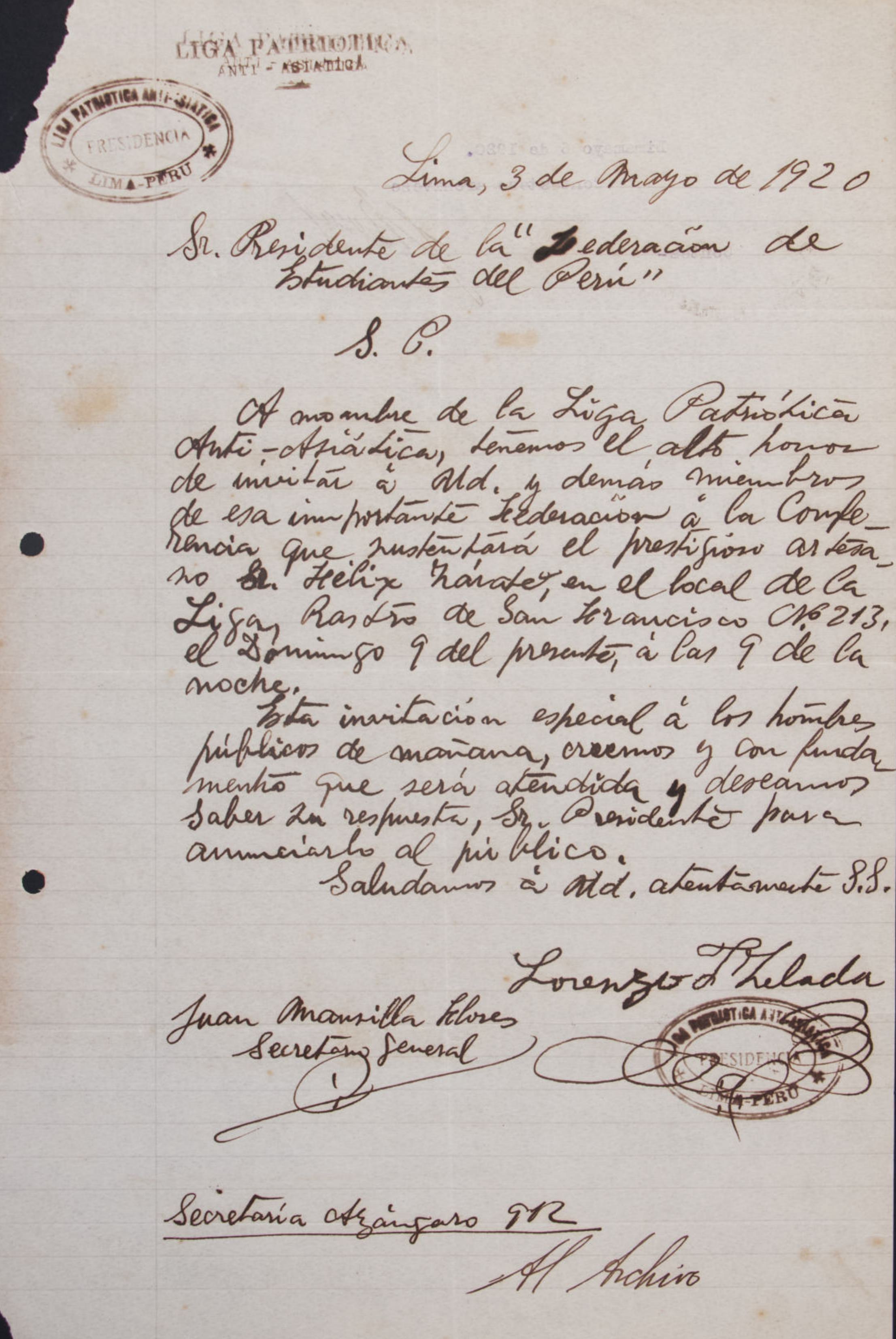 Esta carta, enviada el 3 de febrero de 1920 a Víctor Raúl Haya de la Torre, presidente de la Federación de Estudiantes del Perú, es una respuesta en la que el remitente agradece profundamente haber sido designado como "Médico de la Juventud." Expresa gratitud por esta muestra de confianza y estima, manifestando que siempre ha considerado a la juventud actual como continuadora de los ideales que él mismo tuvo en su época estudiantil. Al asumir este rol honorífico, se compromete a velar por la salud y el bienestar de los estudiantes, recordando con afecto y nostalgia sus propios días como joven optimista en busca de logros y ideales.