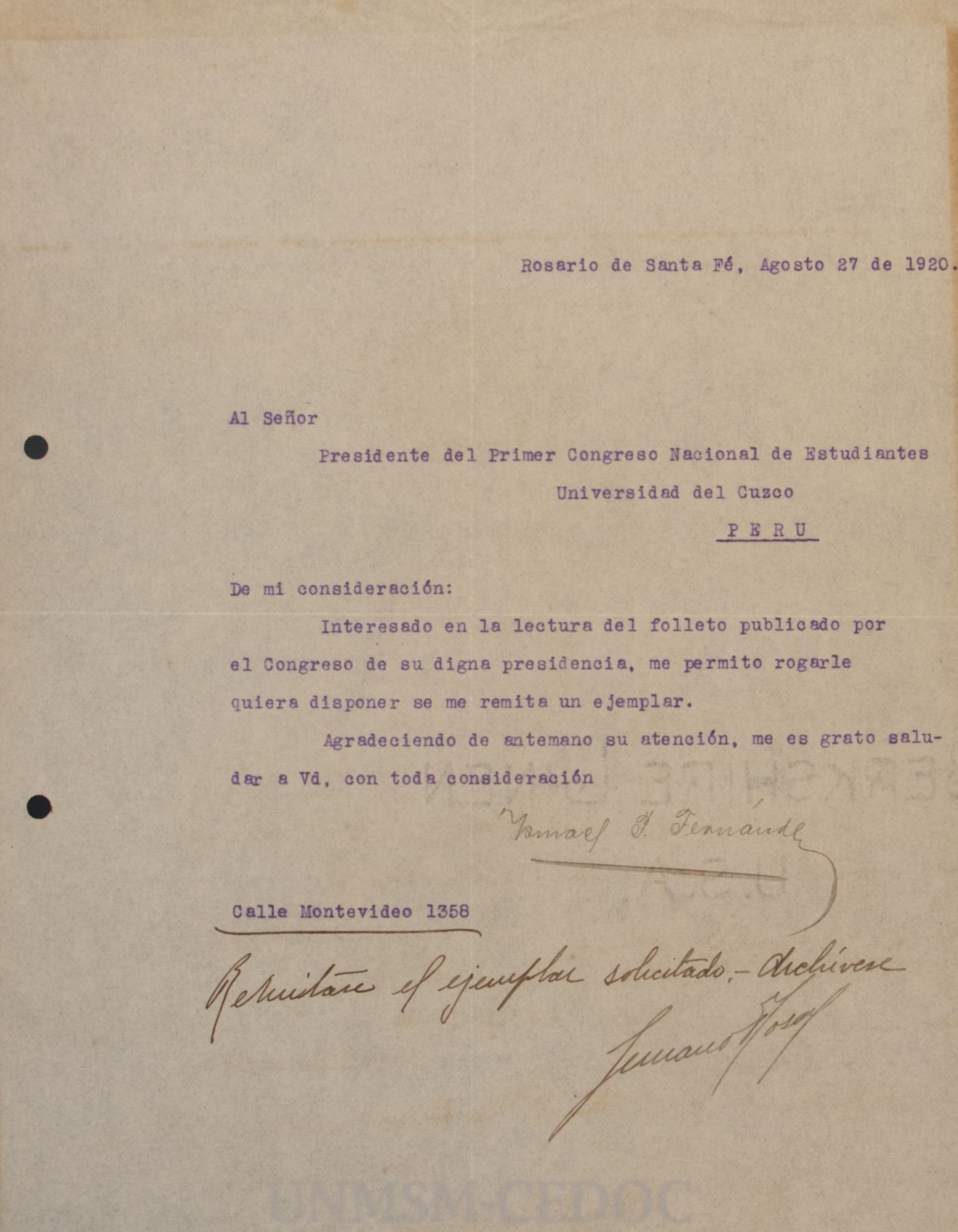 Esta carta, enviada desde la Dirección General del Ministerio de Instrucción en Lima el 4 de febrero de 1920, está dirigida al presidente de la Federación de Estudiantes del Perú. En respuesta a un oficio de la federación, el ministerio informa que, aunque los colegios están clausurados por ser época de vacaciones, ha comunicado a los directores la solicitud de la federación. Les ha instado a facilitar la participación de una comisión de alumnos de cada plantel en la romería programada para el 7 de febrero a la tumba de don Ricardo Palma.