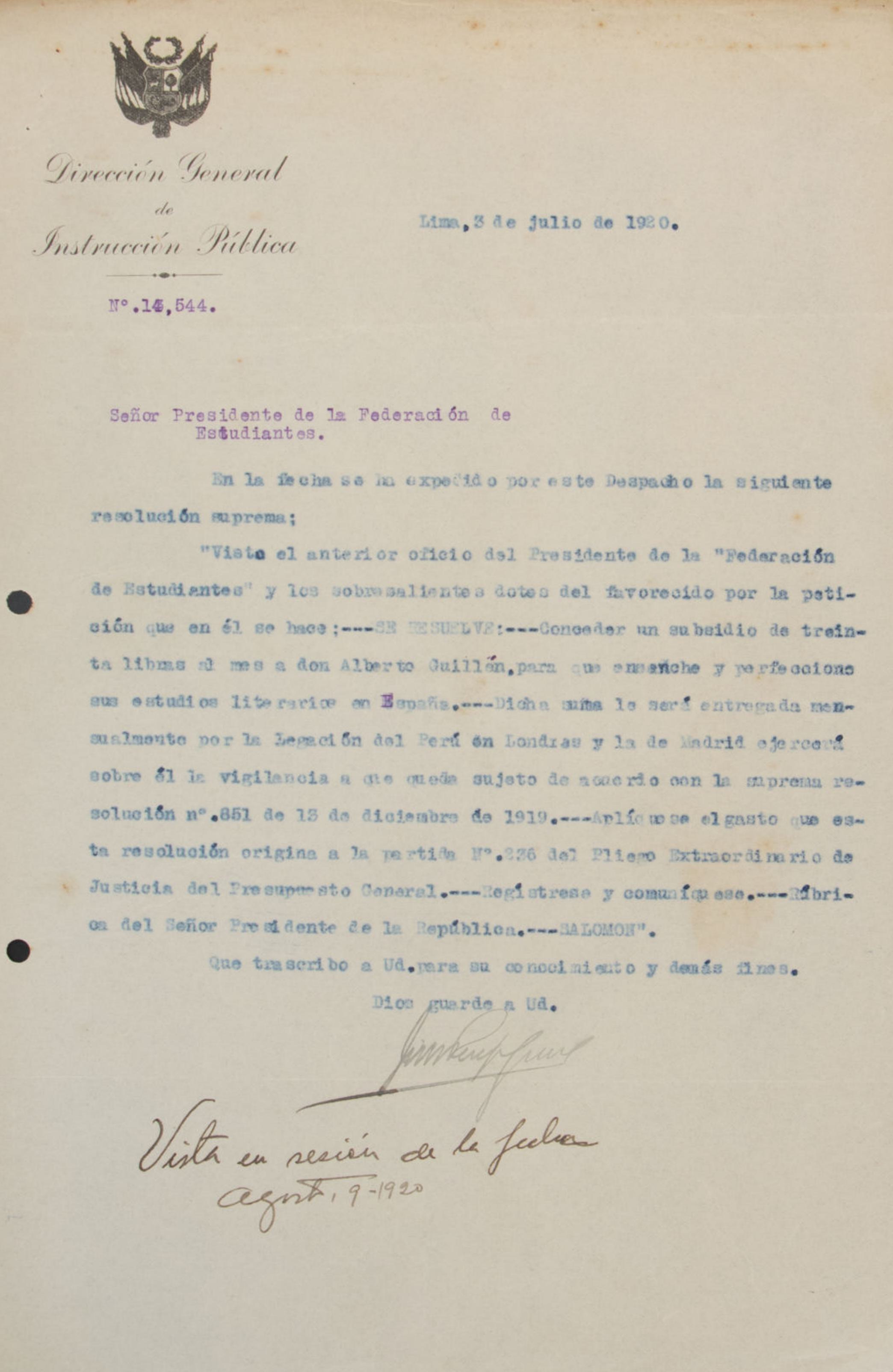 G. Hánia y Gordillo Lulet, en representación del colegio Guadalupe, solicitan al presidente de la Federación de Estudiantes del Perú el permiso para utilizar el terreno de la federación el jueves por la tarde para llevar a cabo el partido definitivo contra el equipo "High School" de Callao. Expresan su agradecimiento y aseguran que el colegio Guadalupe recordará siempre este favor