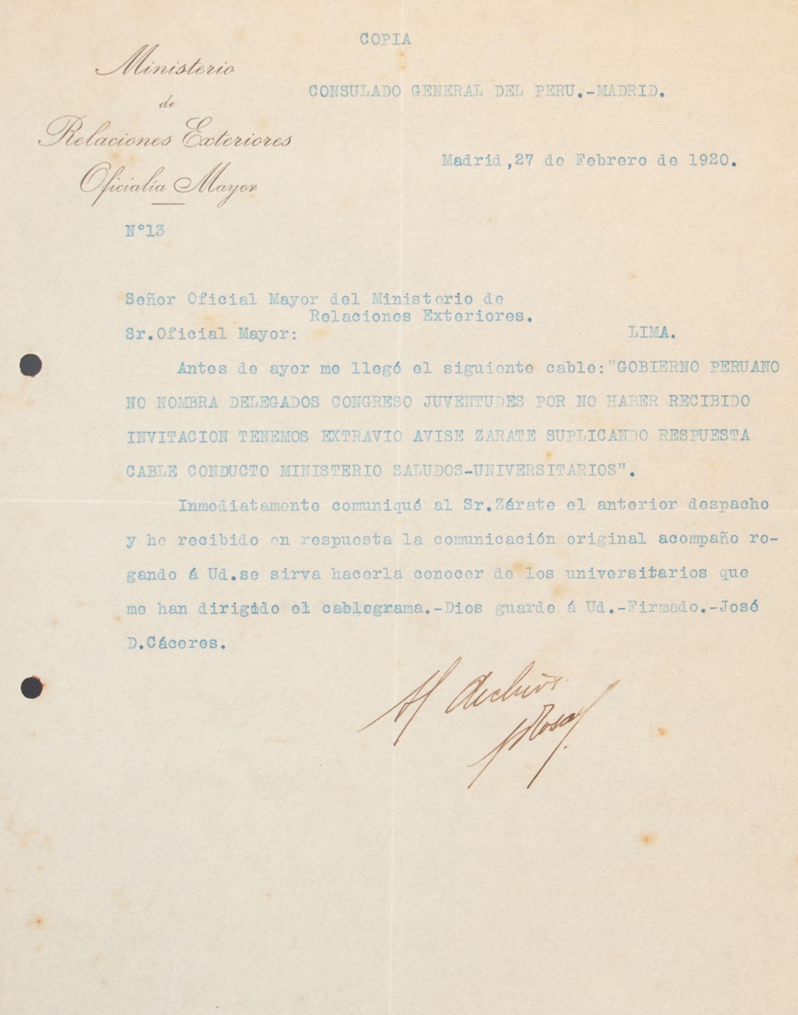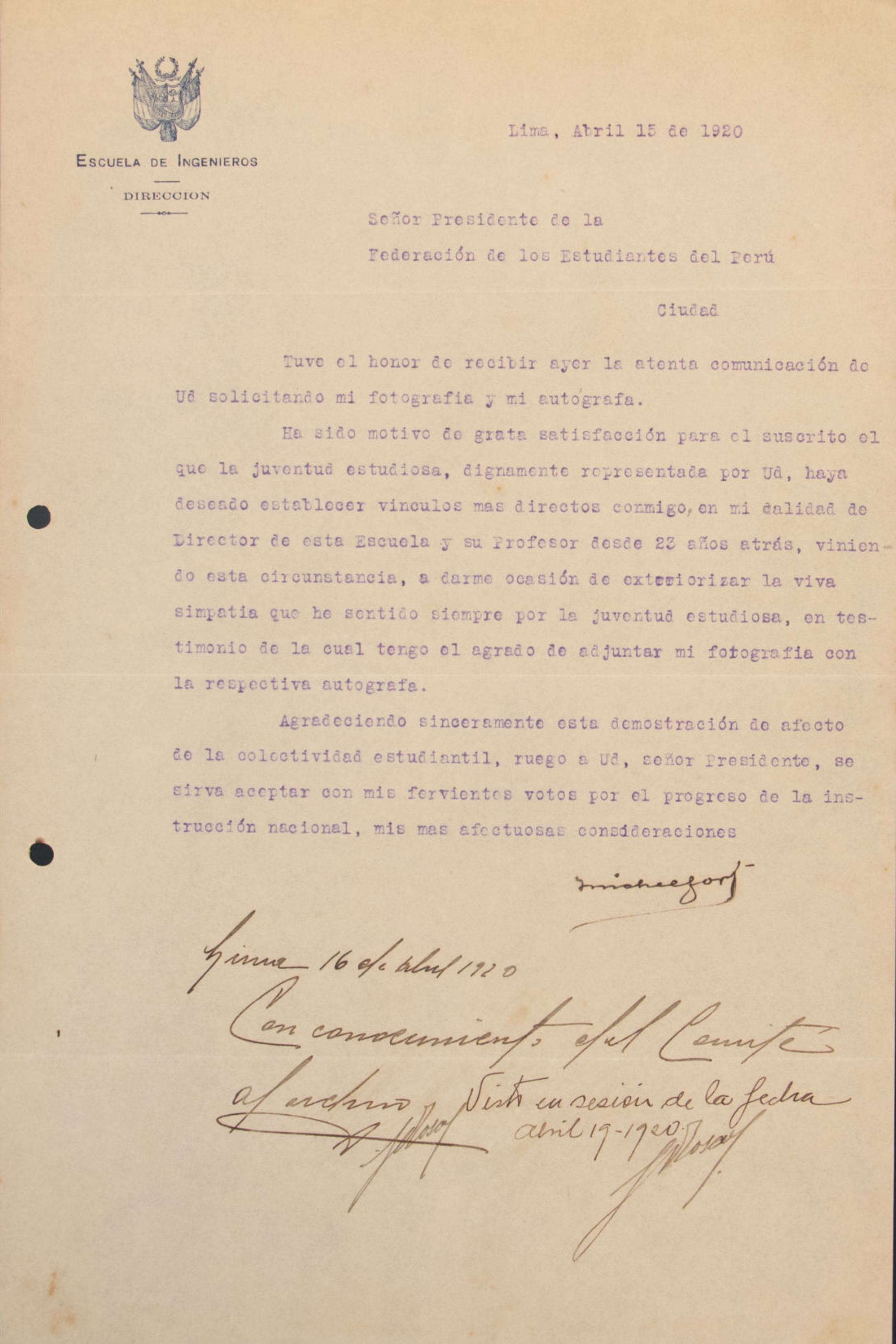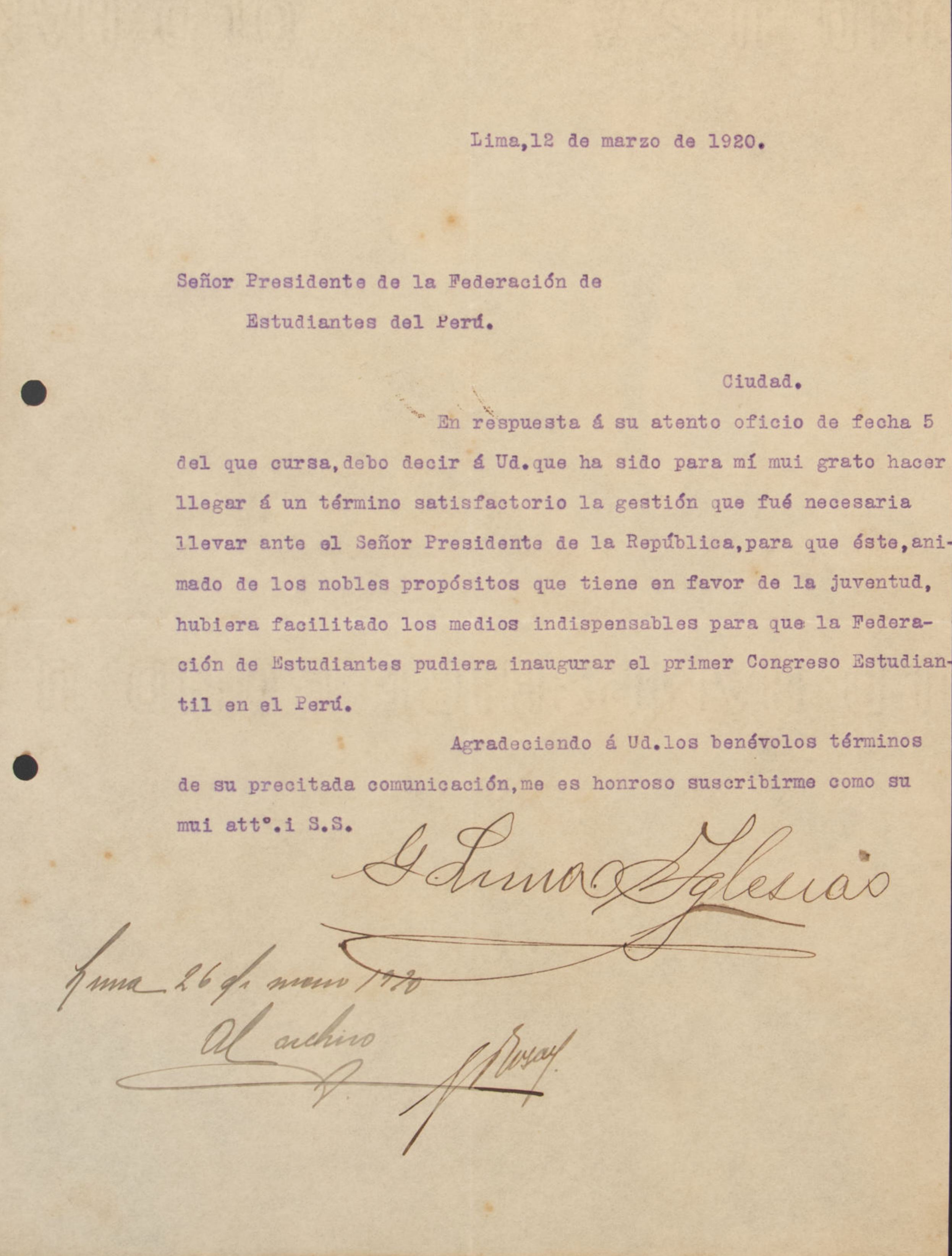 Carta enviada el 20 de enero de 1921 por Typewriter Emporium al presidente de la Federación de Estudiantes del Perú, informando sobre la apertura de su establecimiento en Lima. Ofrecen servicios especializados en reparación y mantenimiento de máquinas de escribir, calculadoras, gramófonos y aparatos eléctricos, destacando su experiencia, herramientas avanzadas y garantía de calidad.