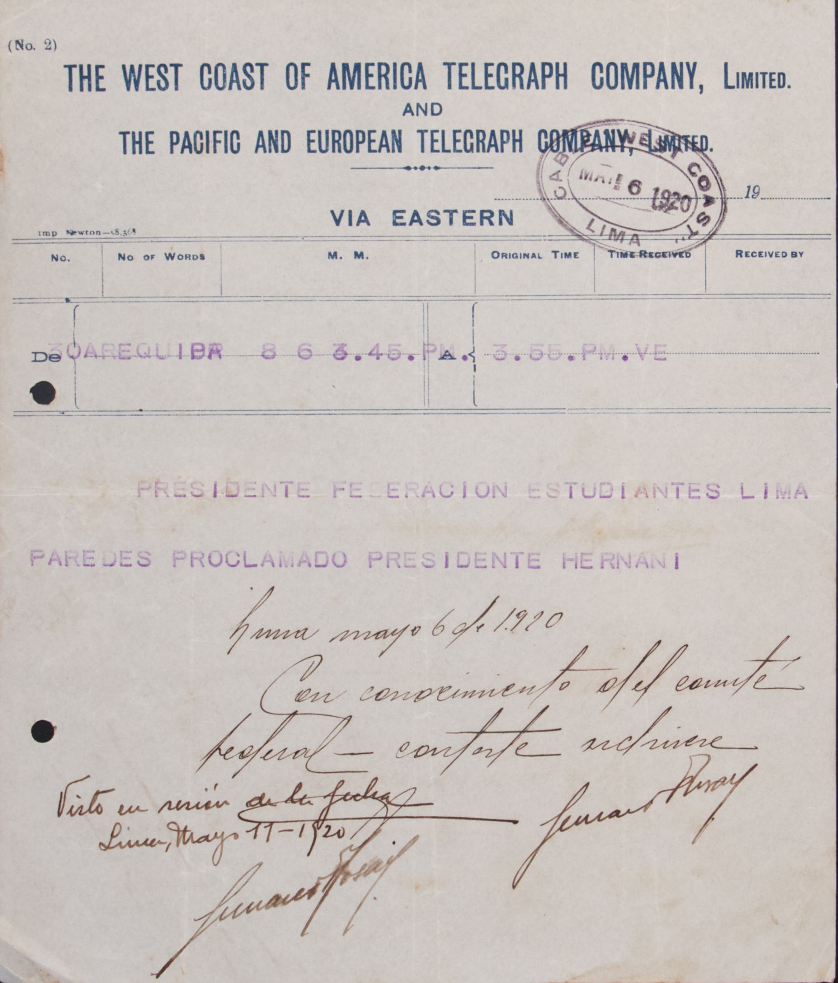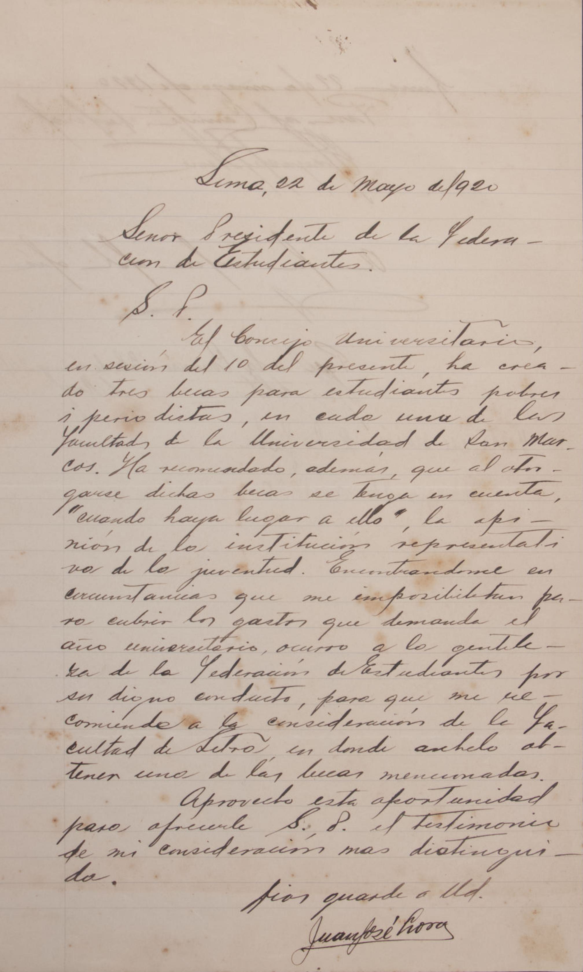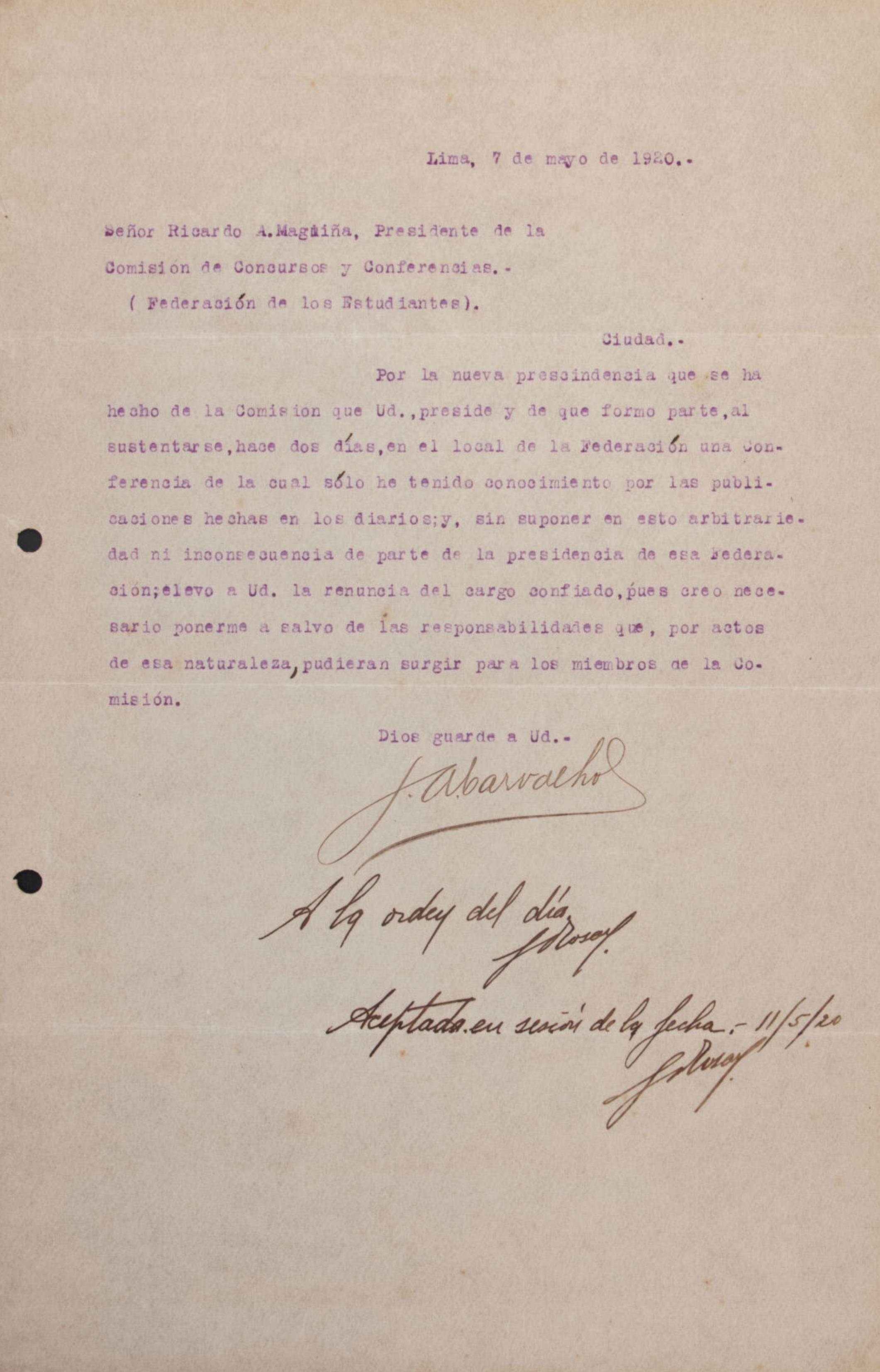 Esta carta, fechada el 4 de febrero de 1920 y dirigida a Víctor Raúl Haya de la Torre, presidente de la Federación de Estudiantes del Perú, es enviada por Felipe, quien informa la devolución del volumen 458 de la biblioteca de la federación, titulado Curso de Historia General de América de Pedro Rada y Paz Soldán.
