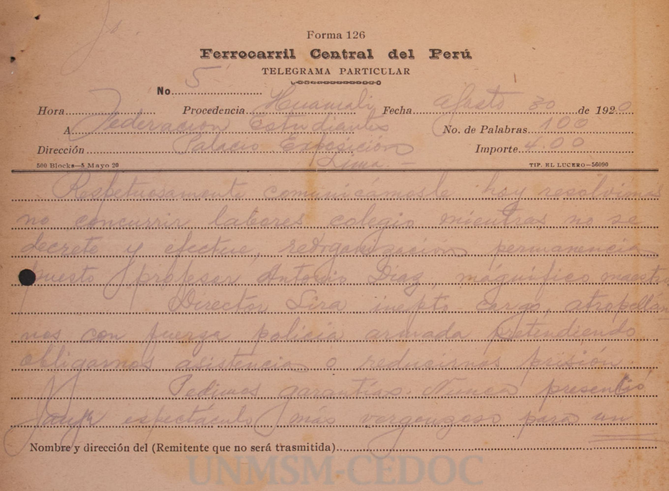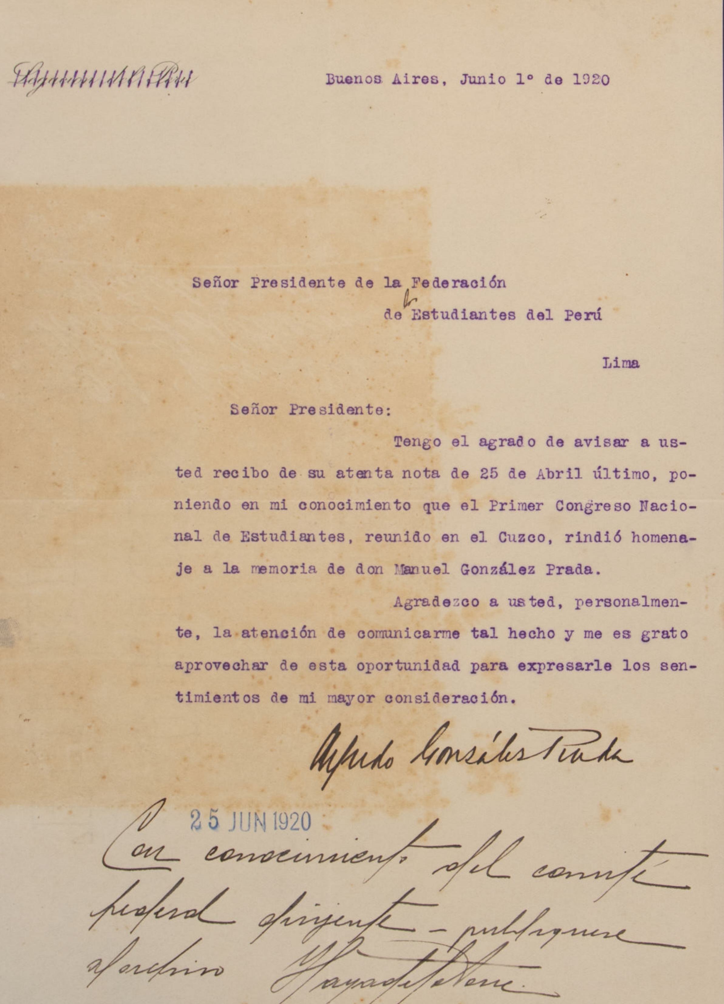 Carta enviada al presidente de la Federación de Estudiantes del Perú por los preceptores y empleados de las Escuelas Fiscales de Lima y Callao, solicitando el préstamo del local de la Federación por dos horas el 22 de julio, de 6 a 8 p.m., para la entrega de un álbum y una tarjeta de oro al Dr. Alberto Salomón en reconocimiento por su labor en el Ministerio de Instrucción.
