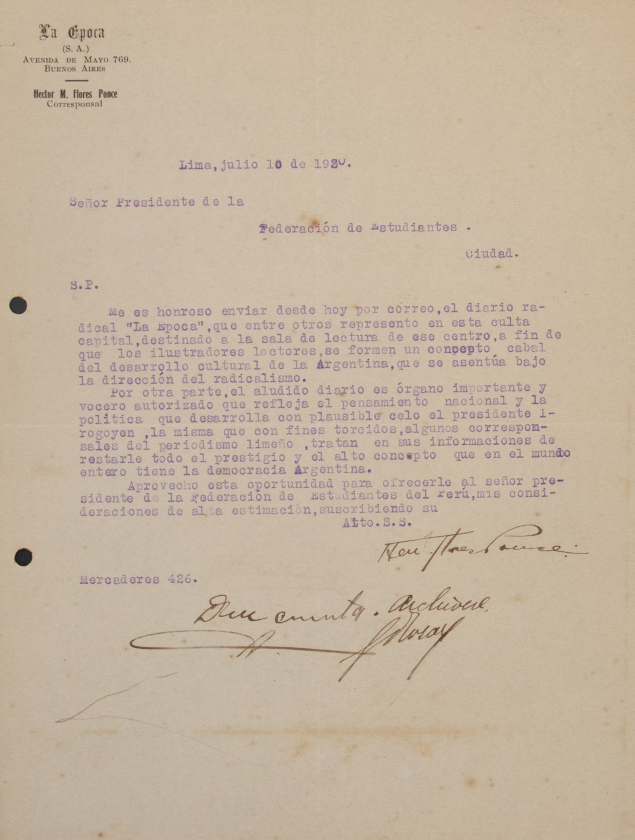 Carta de la Asociación de Estudiantes de Ingeniería al presidente de la Federación de Estudiantes del Perú solicitando la cesión gratuita del terreno de la federación el día 31 de julio para la realización de un mitin patriótico en honor a las provincias de Tacna, Arica y Tarapacá. La solicitud se presenta debido a que los gastos de propaganda han superado el presupuesto y la municipalidad está dispuesta a otorgar un subsidio solo si no se cobra por el uso del terreno.