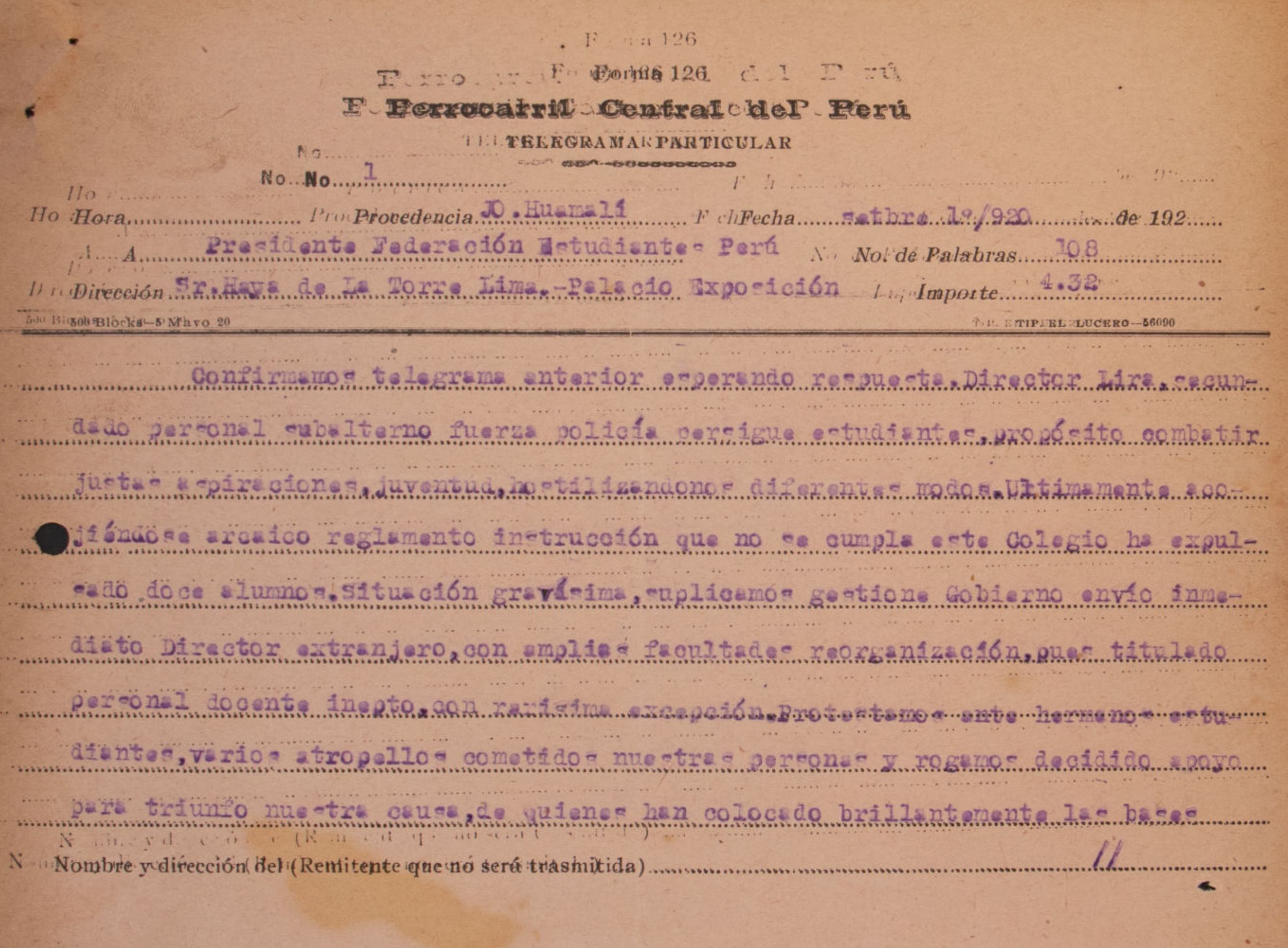 Carta de la Dirección de Gobierno al presidente de la Federación de Estudiantes del Perú informando, por encargo del ministro, que el gobierno ha decidido enviar un objeto de arte como premio. Este será adjudicado al equipo vencedor en el campeonato organizado por la federación con motivo de las fiestas patrias.