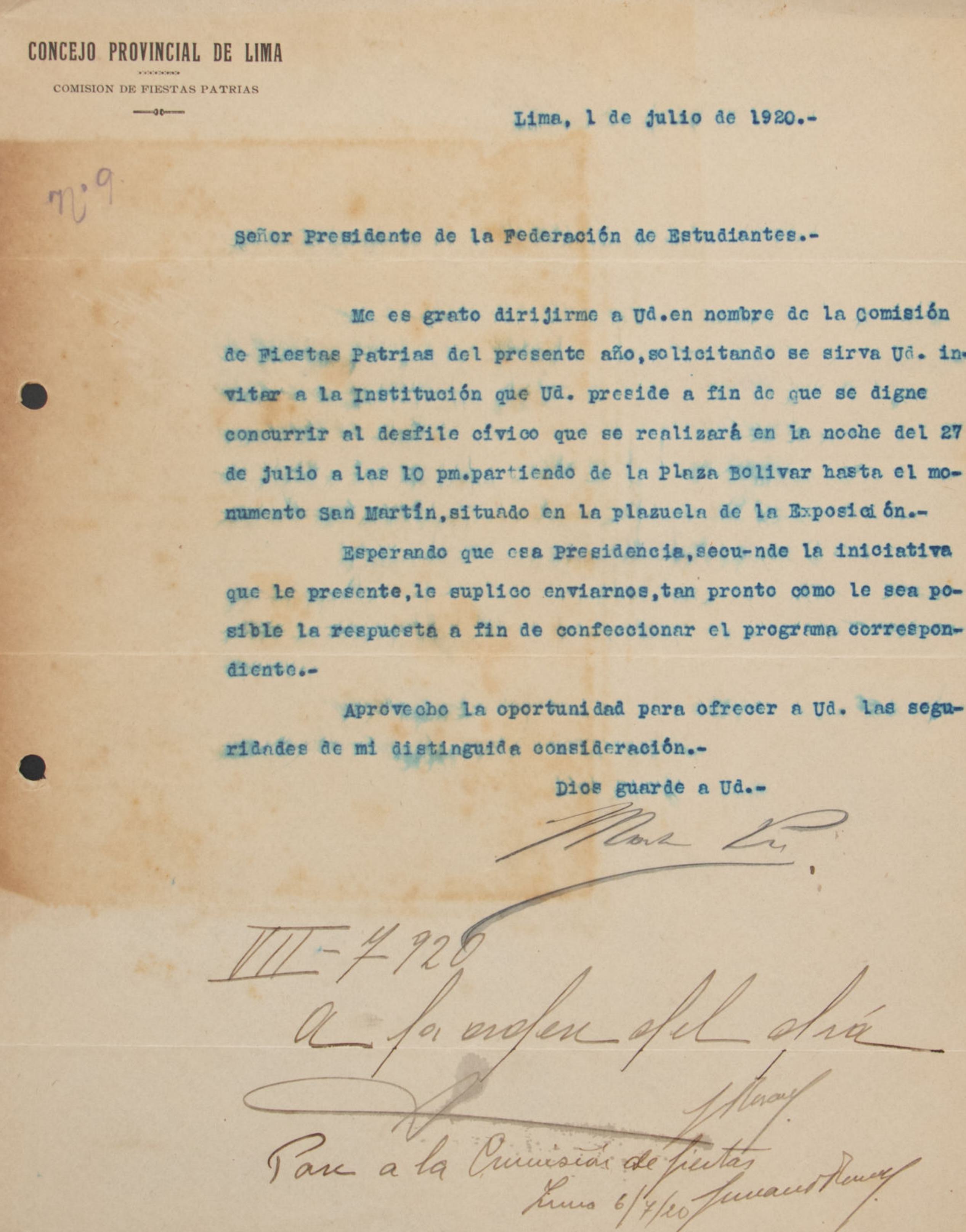 Mendoza Solar informa al presidente de la Federación de Estudiantes del Perú que la comisión representará a la federación en un mitin patriótico y que los detalles se enviarán por correo. También menciona que se está preparando un mitin similar para el 31 de julio.