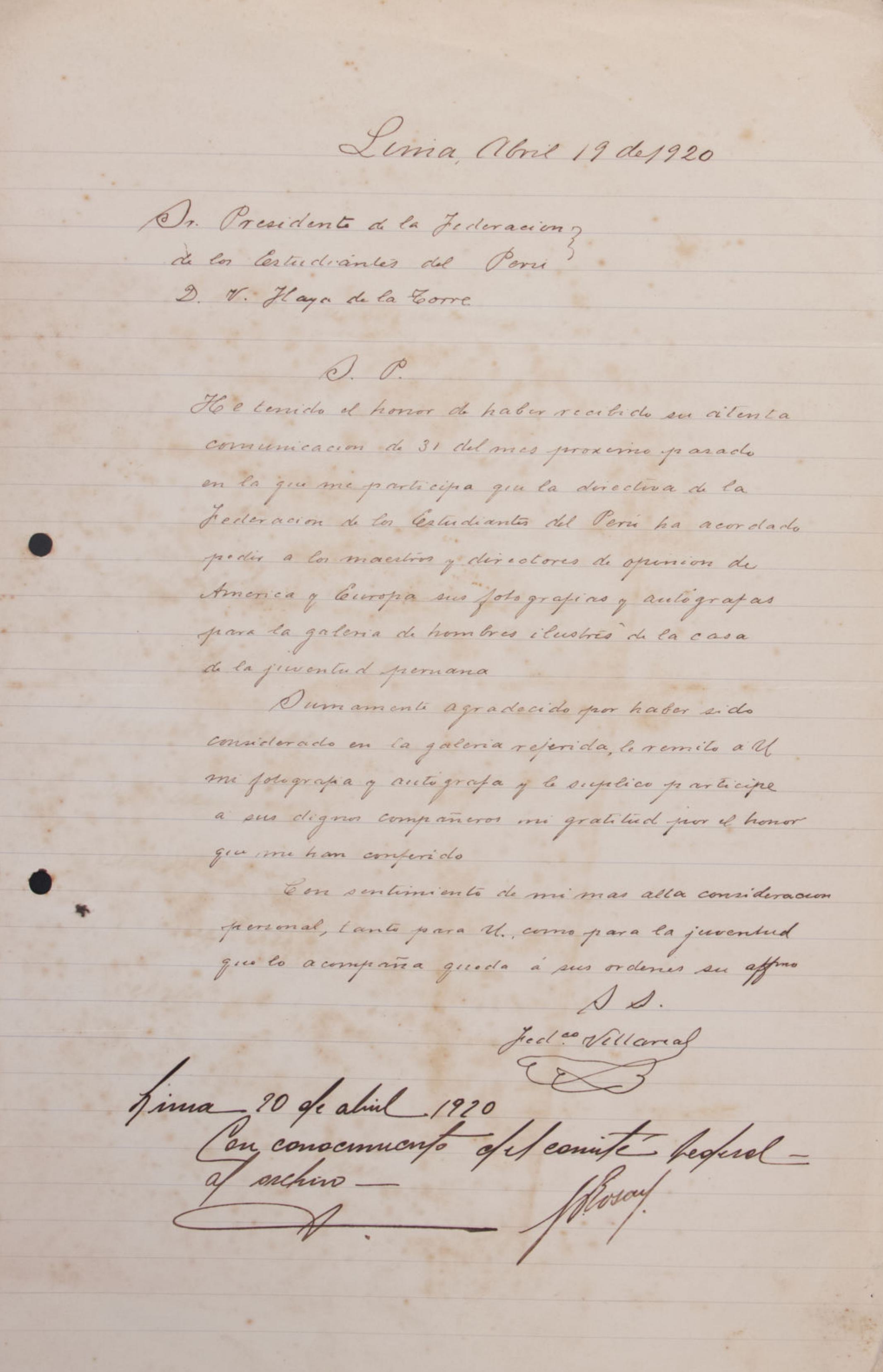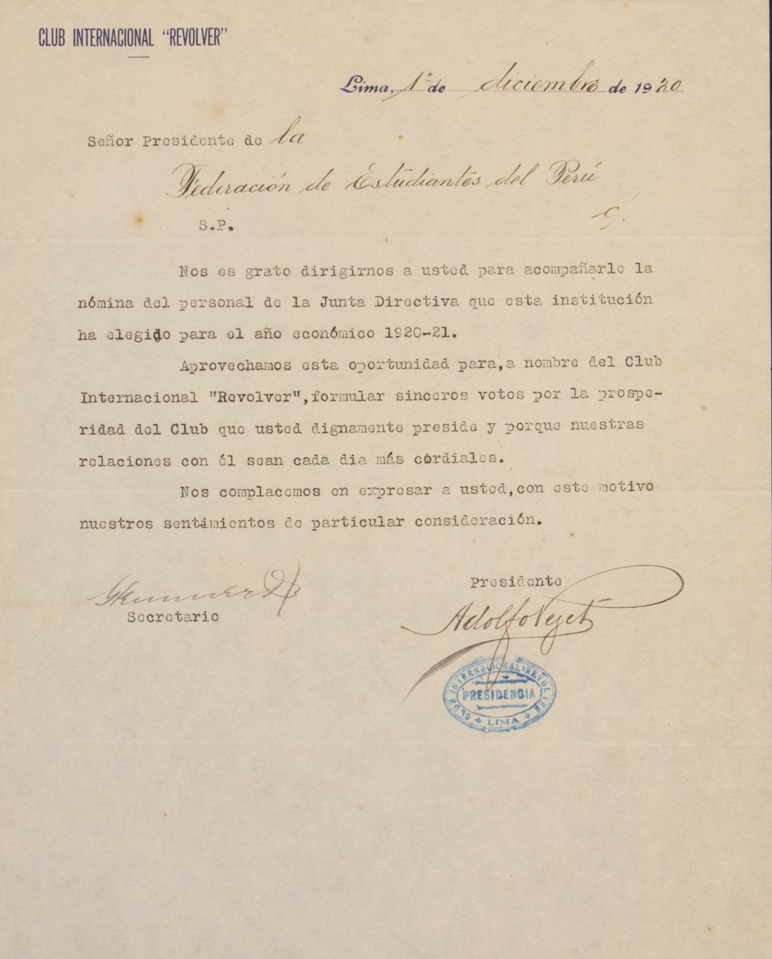 Comunicación en la que el ministro de hacienda saluda al presidente de la Federación de Estudiantes del Perú y expresa su deseo de contribuir al éxito del campeonato deportivo que la federación organizará durante las fiestas patrias. Con este propósito, el ministro envía un objeto para ser utilizado como premio en dicho evento.