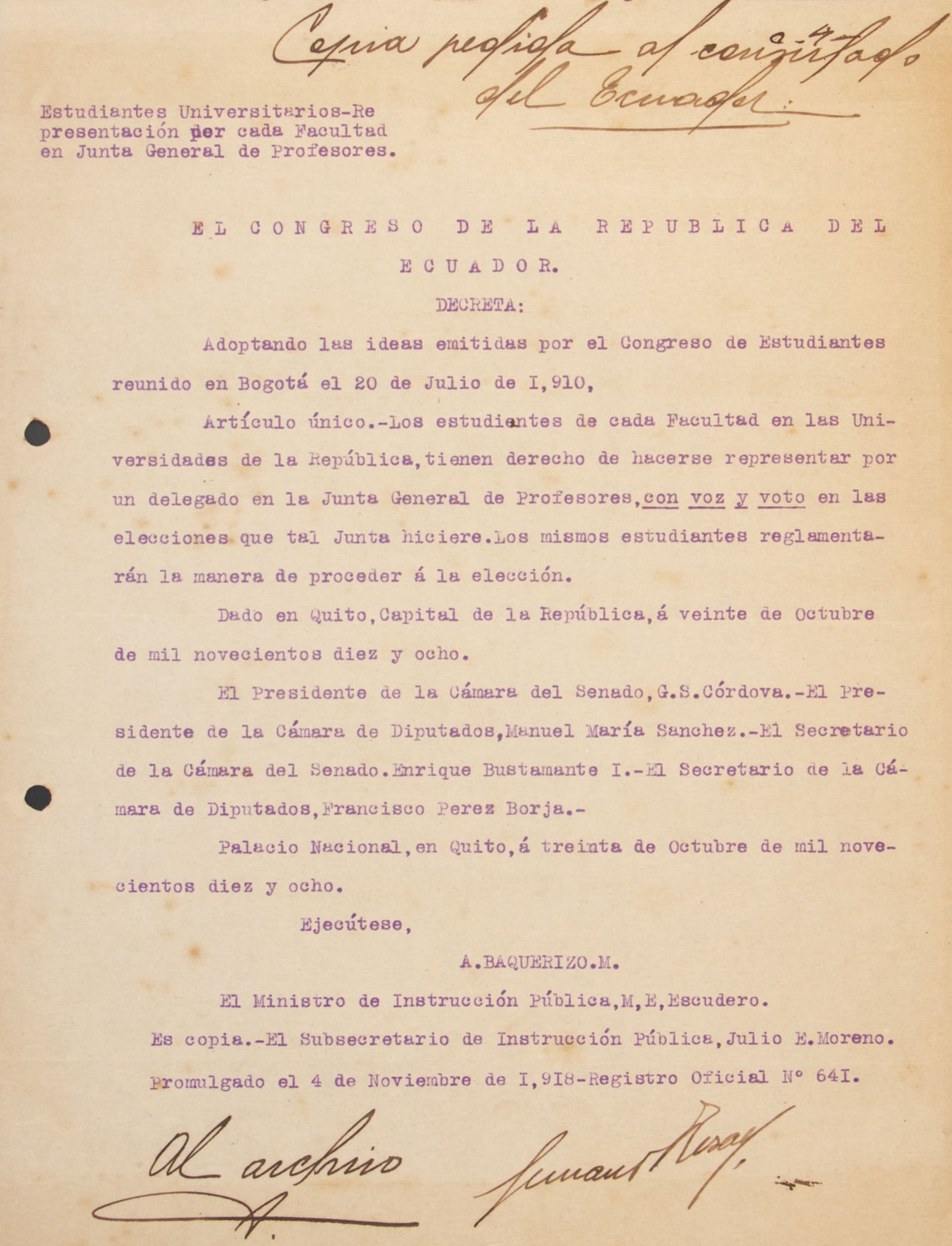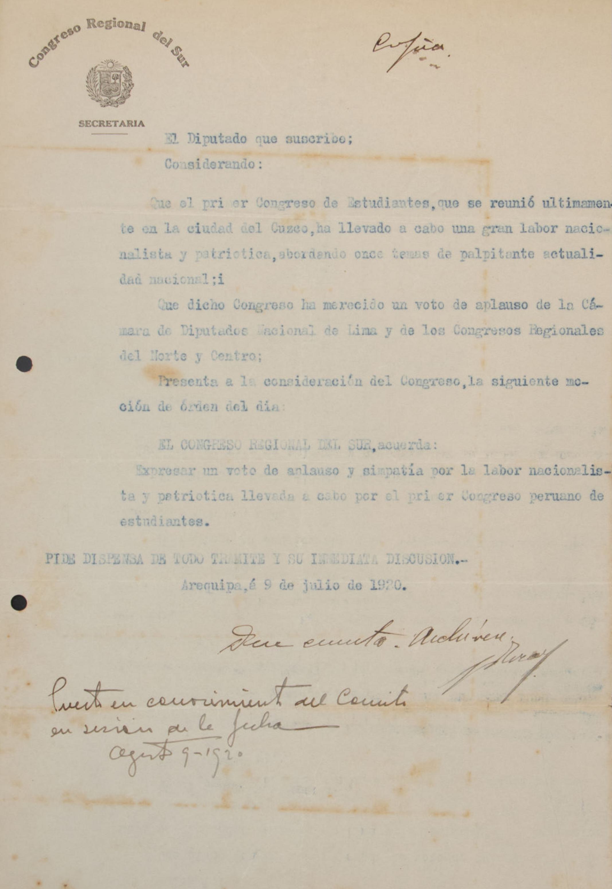 Telegrama enviado desde Buenos Aires por Sagarna al presidente de la Federación de Estudiantes del Perú, informando que la noche anterior amplió su mensaje ante la federación argentina con vítores dirigidos a los estudiantes peruanos, expresando saludos y apoyo.