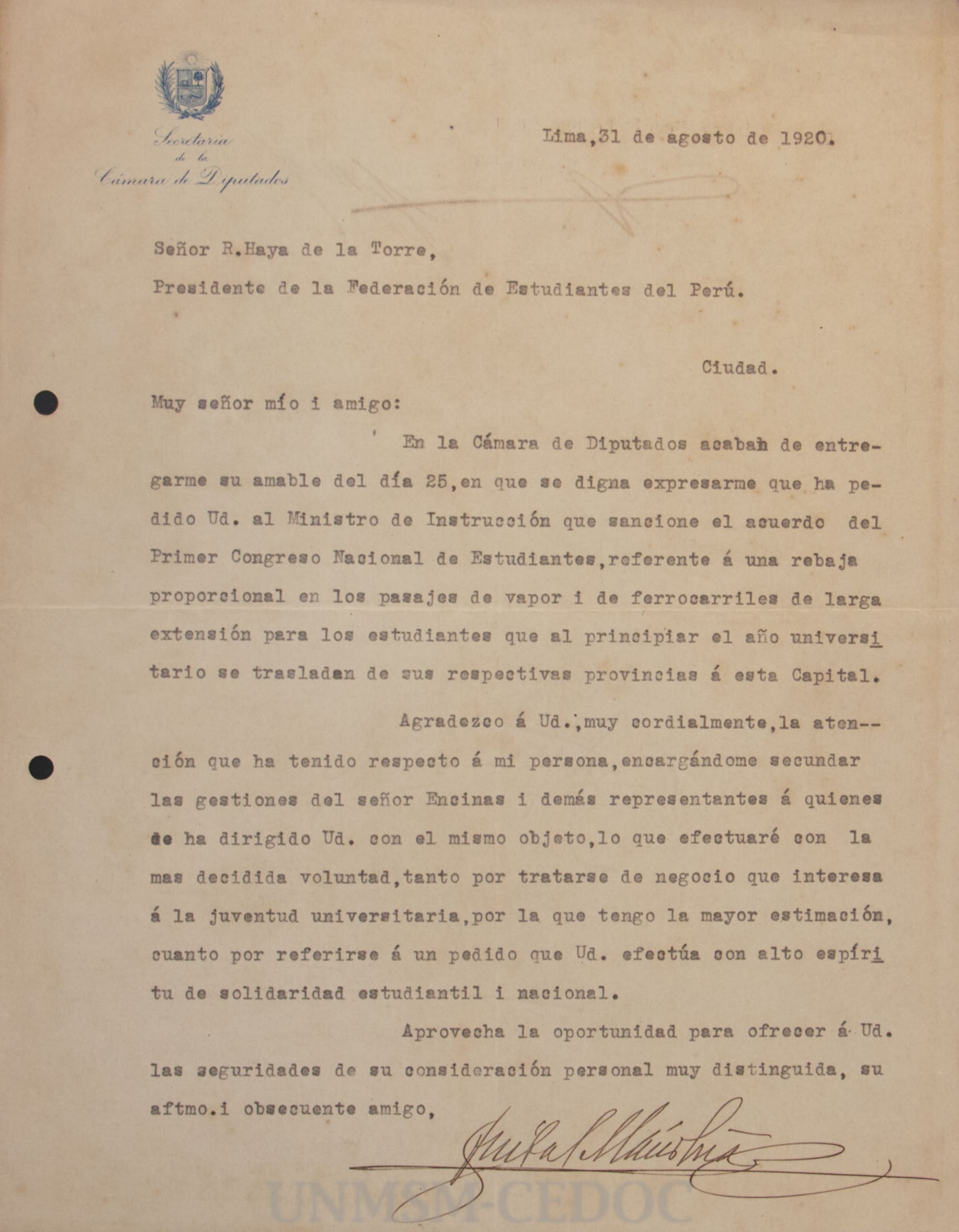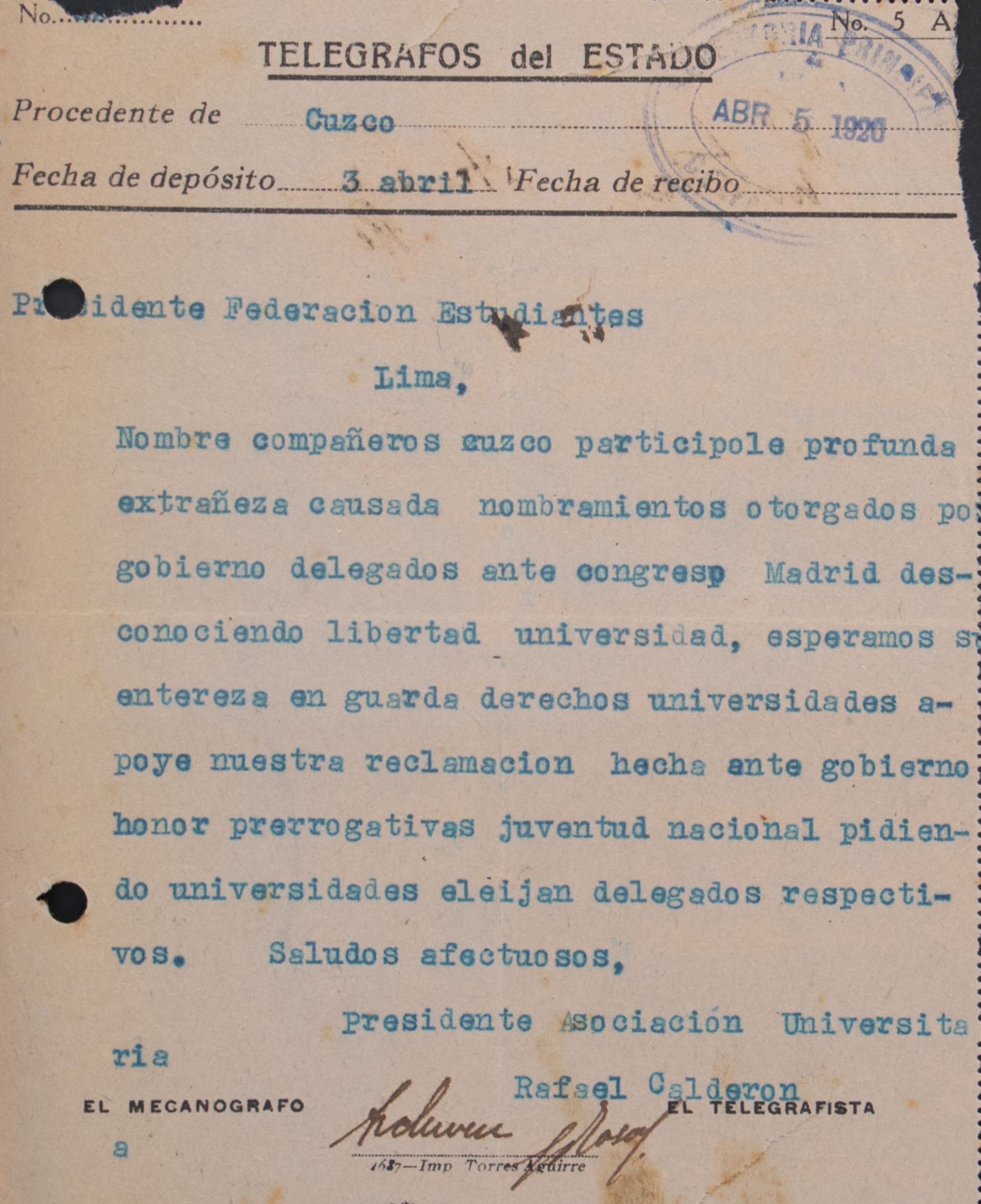 Telegrama procedente de La Paz, en el que Luis Espinoza agradece en nombre de la prensa nacional y la juventud boliviana al presidente de la Federación de Estudiantes del Perú. La gratitud se expresa por el gesto de la juventud peruana al recordar el día clásico de Bolivia, realizando un desfile en el que llevaron entrelazadas las banderas de ambos países y entonaron los himnos nacionales.