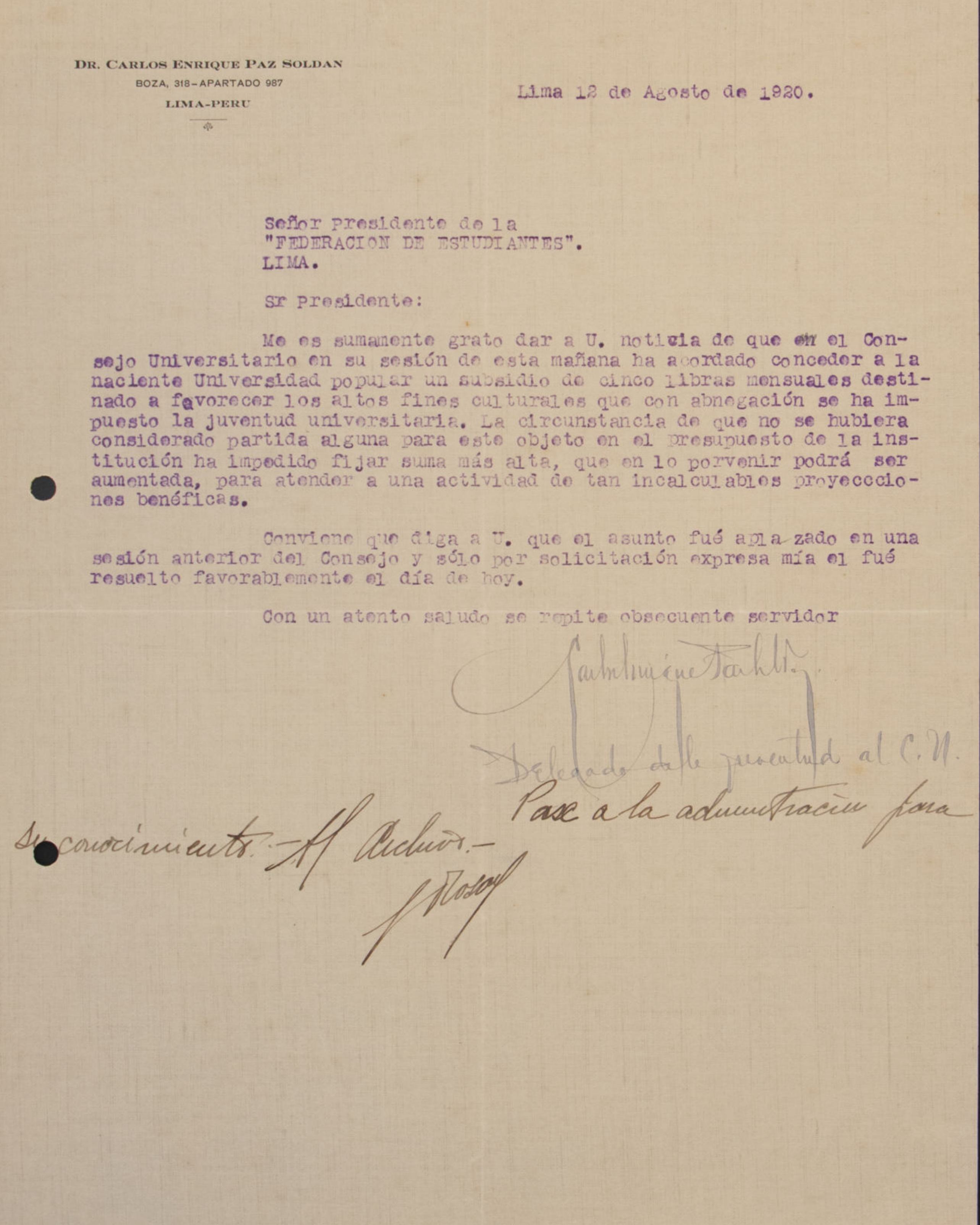 Telegrama enviado el 6 de mayo de 1920 desde Arequipa al presidente de la Federación de Estudiantes del Perú, informando que Gustavo Paredes ha sido proclamado presidente, destacando la participación de Hernani en el proceso.