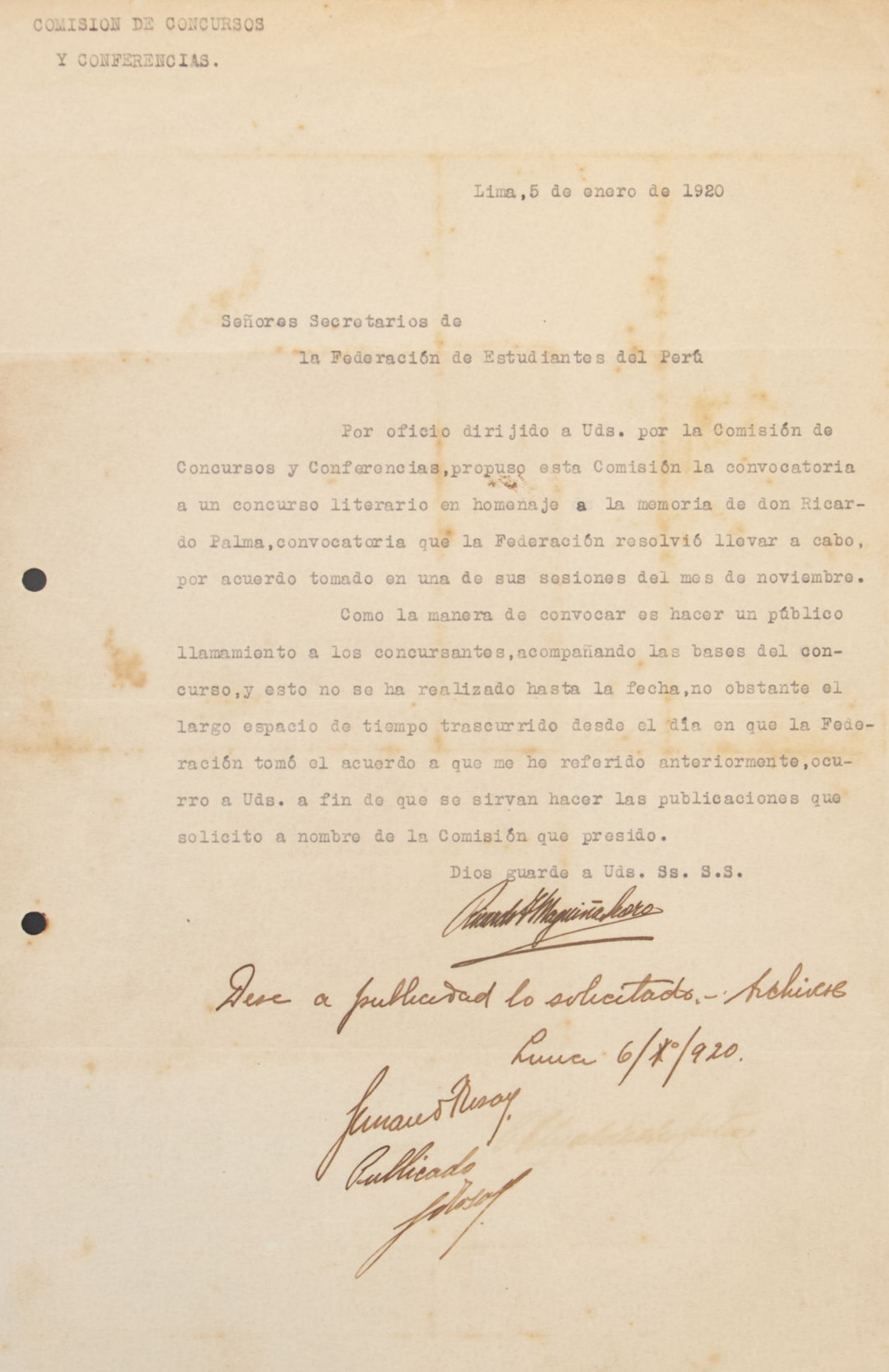 Carta de Carlos Enrique Paz Soldán al presidente de la Federación de Estudiantes del Perú, informando que el consejo universitario ha acordado conceder un subsidio mensual de cinco libras a la Universidad Popular. Este apoyo busca fomentar los objetivos culturales promovidos por la juventud universitaria. Se destaca que, debido a la falta de una partida presupuestaria específica, la suma otorgada es modesta, con la posibilidad de incrementarse en el futuro. Además, se menciona que el asunto fue resuelto gracias a una solicitud expresa del remitente.
