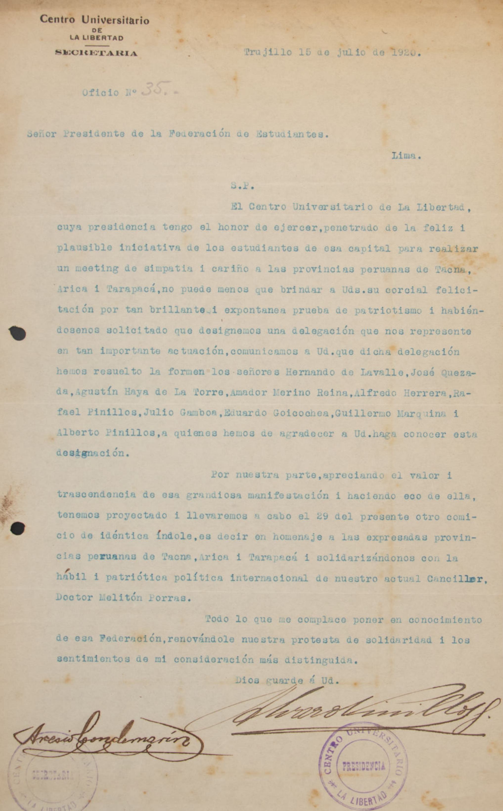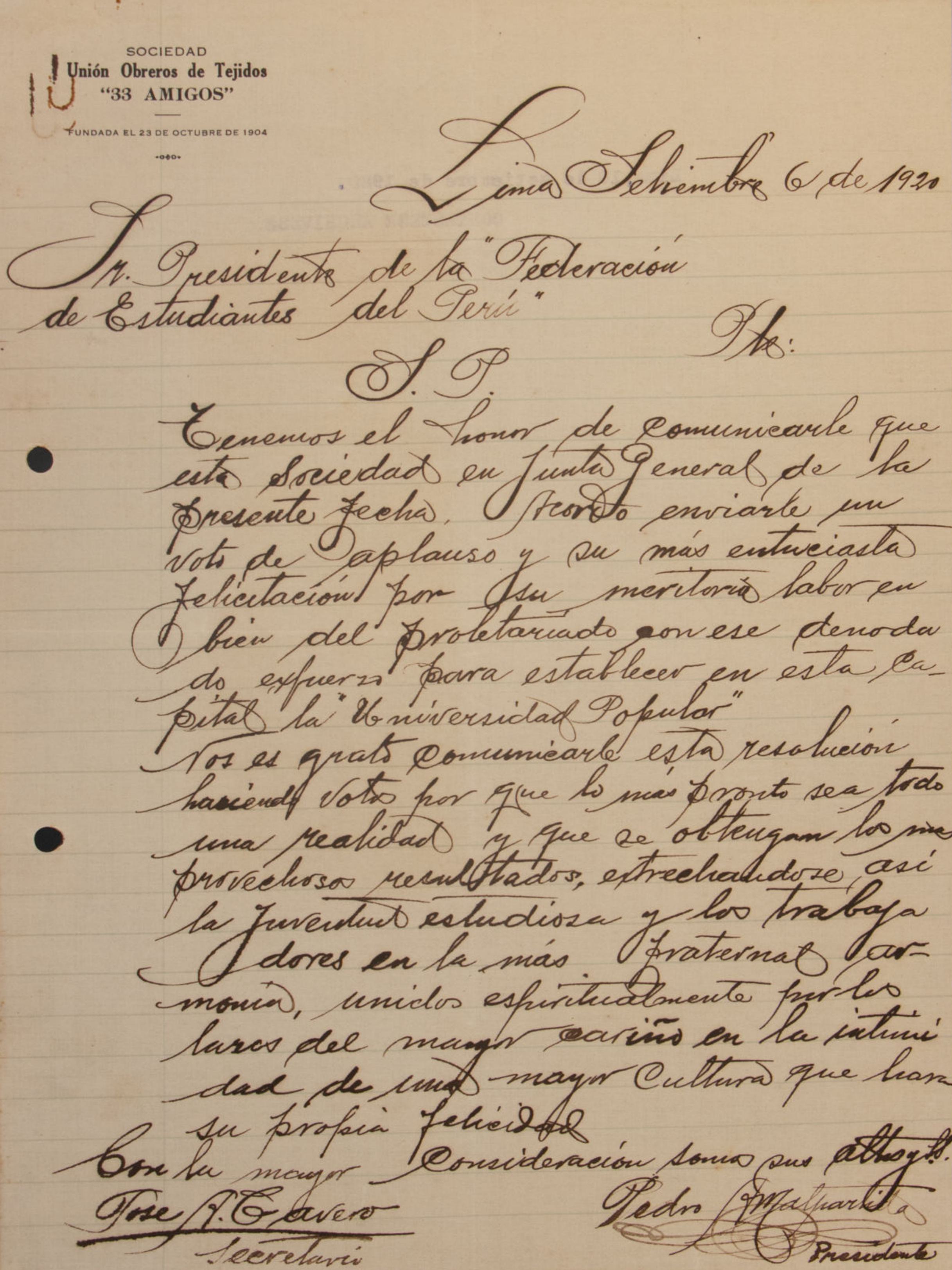 Carta de Juan Mariano Velasco, presidente del Centro de Estudiantes de la Universidad Católica, al presidente de la Federación de Estudiantes del Perú, aclarando que su inasistencia a la reunión del 7 de septiembre, convocada para discutir las bases de organización de la Universidad Popular en Lima, se debió a la tardía recepción de la invitación. Destaca su interés en la iniciativa y el reconocimiento a la labor de la federación en esta importante tarea.