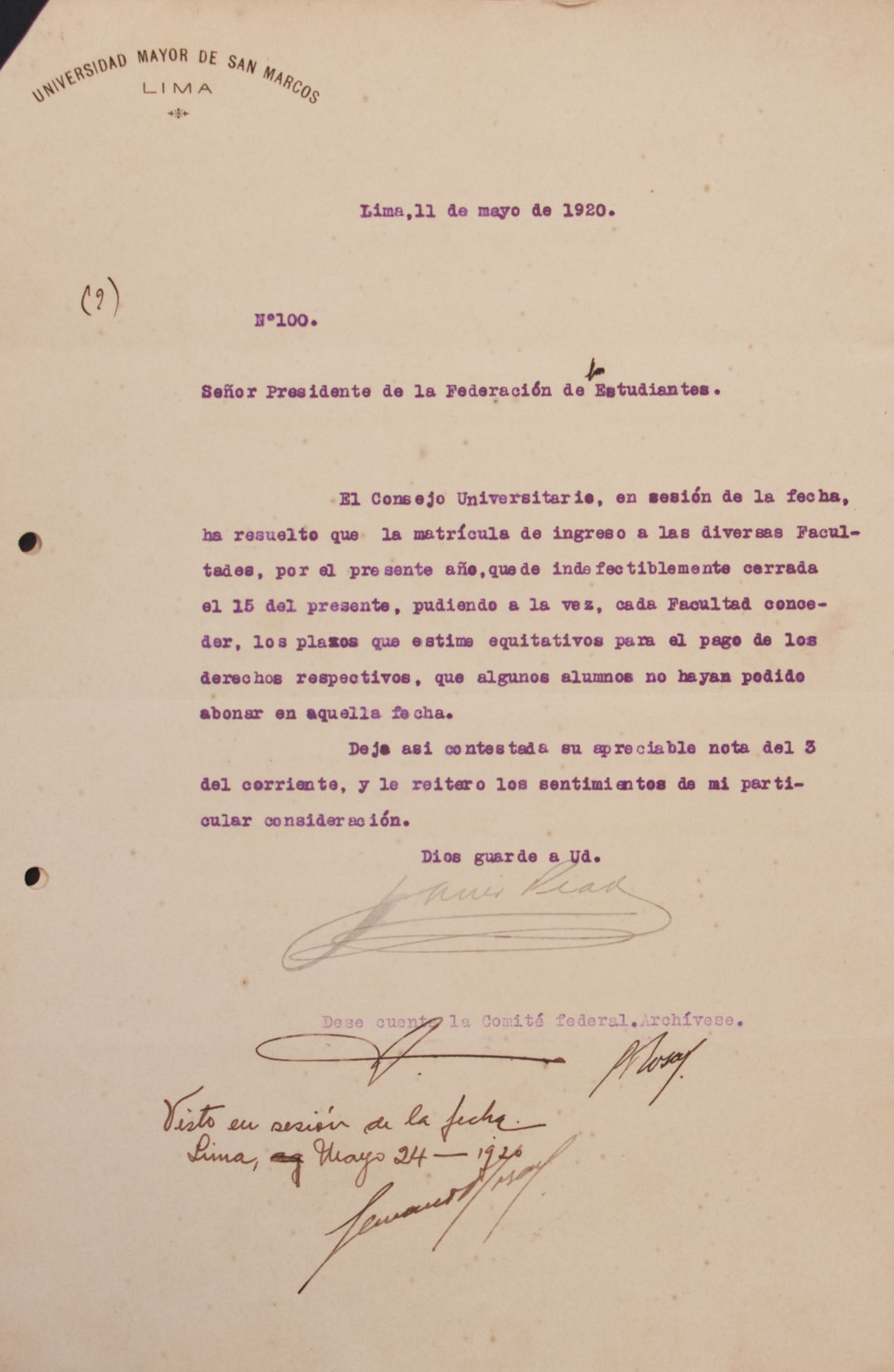 omunicación de la Federación de Carpinteros y Ramas Similares al presidente de la Federación de Estudiantes del Perú, solicitando el uso del local de la institución para realizar una conferencia de carácter social y económico. La federación agradece de antemano el apoyo de la Federación de Estudiantes del Perú hacia el proletariado y expresa su confianza en la colaboración para llevar a cabo esta actividad.