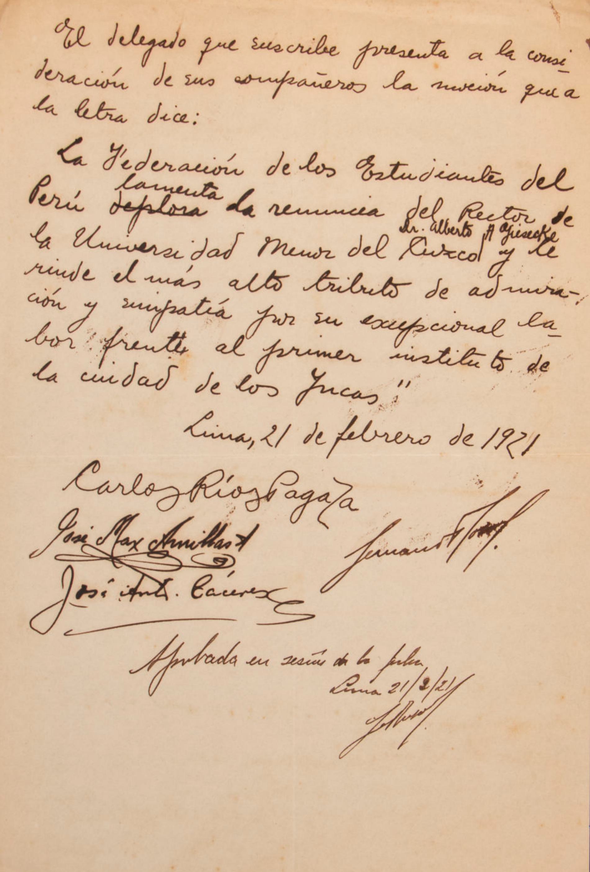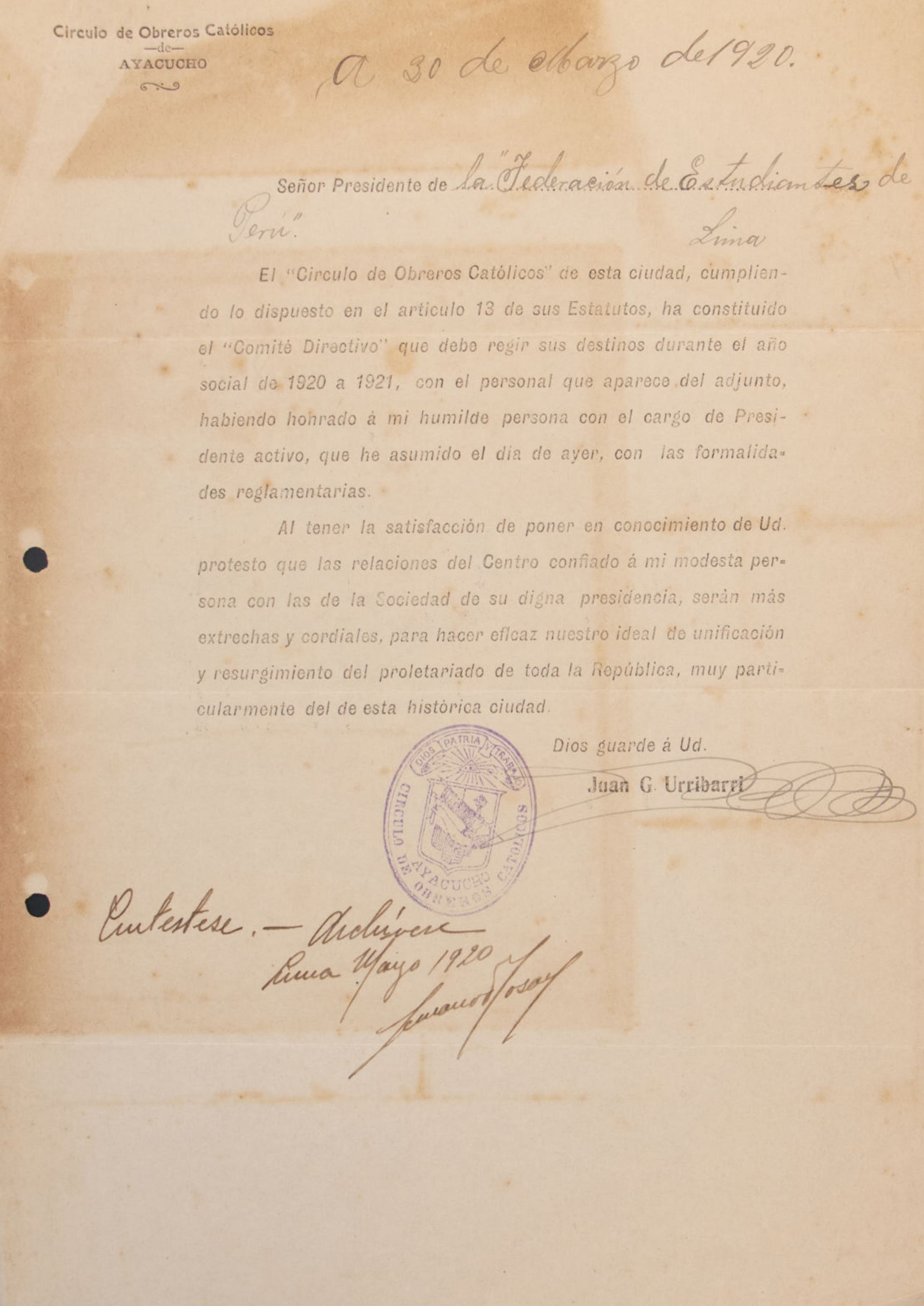 Fidel Ganoza, secretario de la Unificación Textil "La Victoria," comunica al presidente de la Federación de Estudiantes del Perú el acuerdo de la asamblea general de la institución de solicitar el uso del terreno de Santa Beatriz. El propósito es realizar un torneo en beneficio de los trabajadores de la organización, quienes se encuentran actualmente en huelga.
